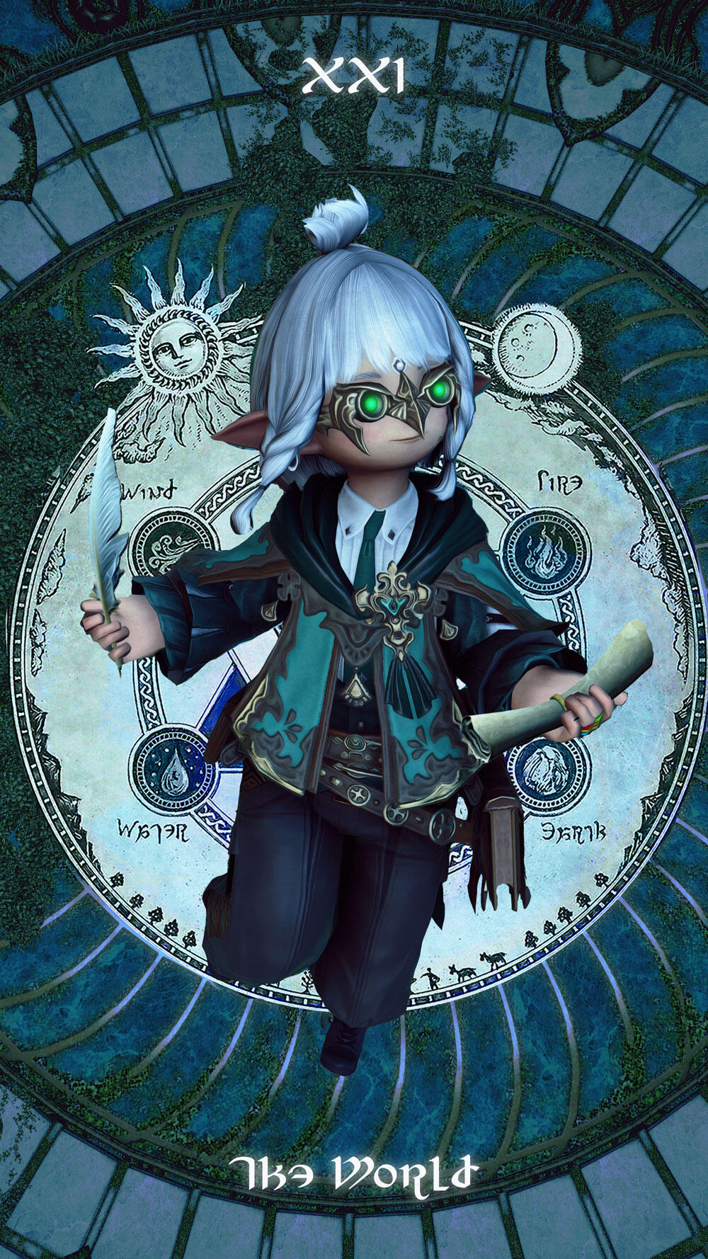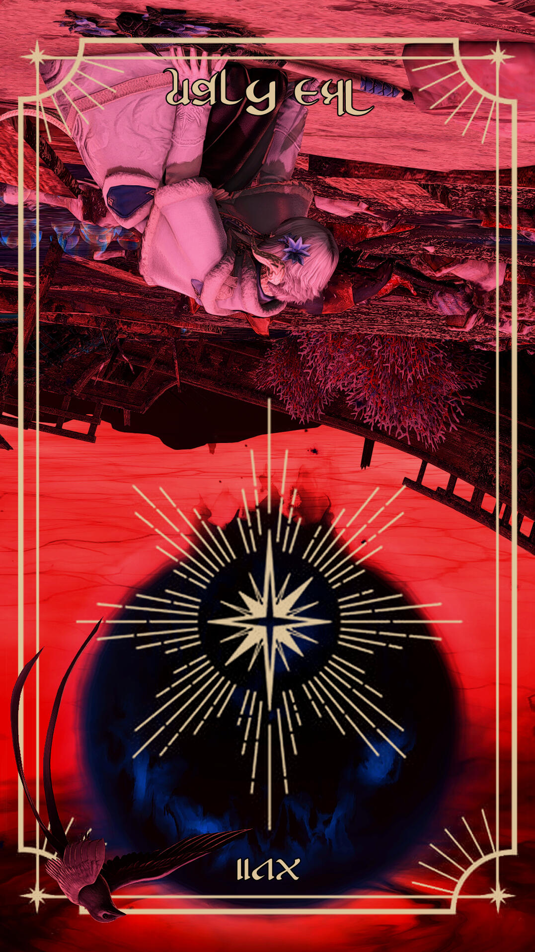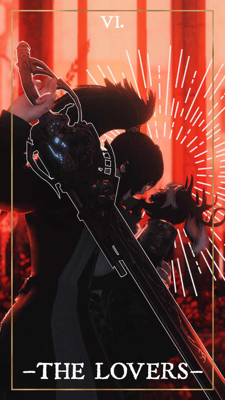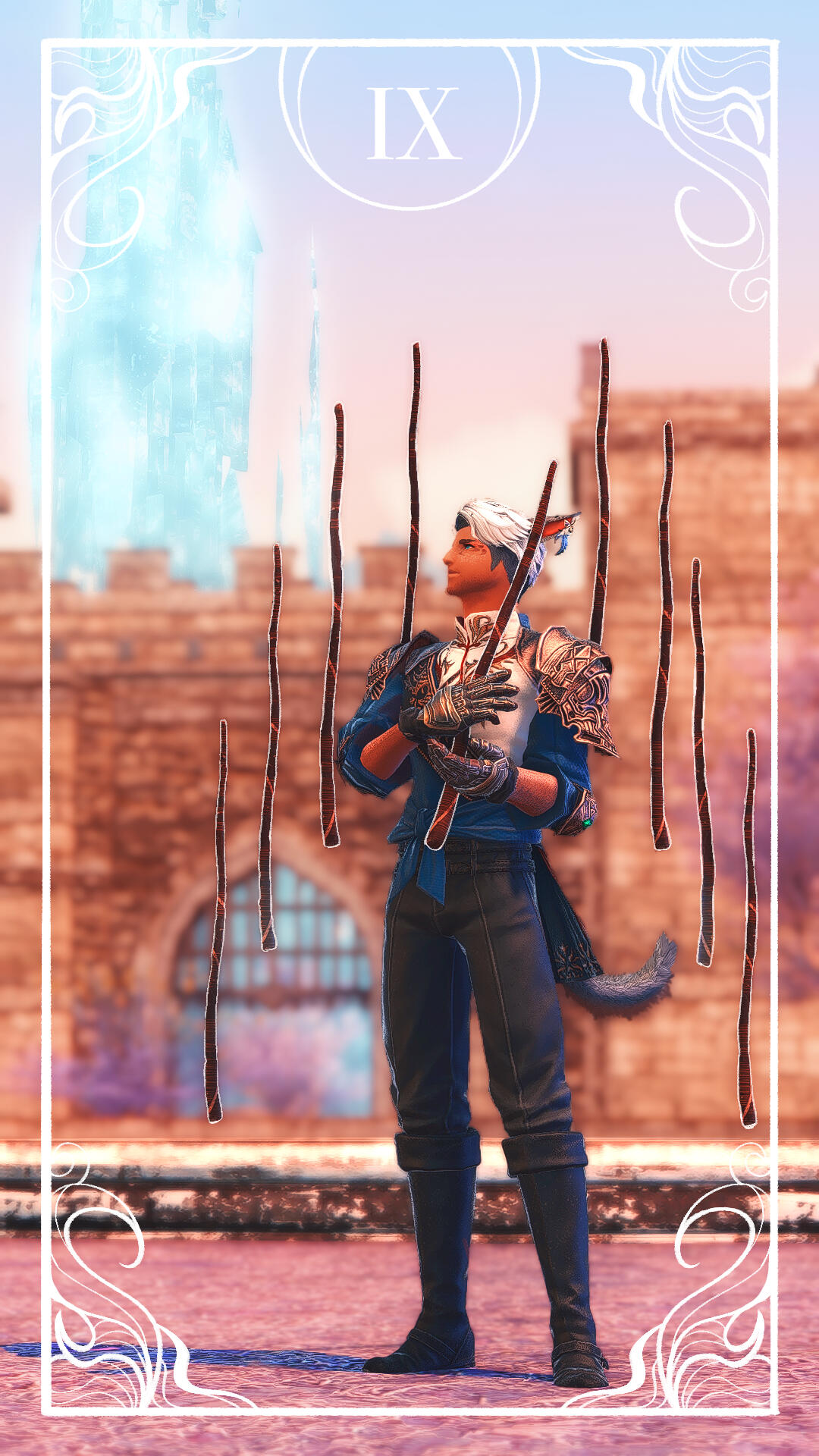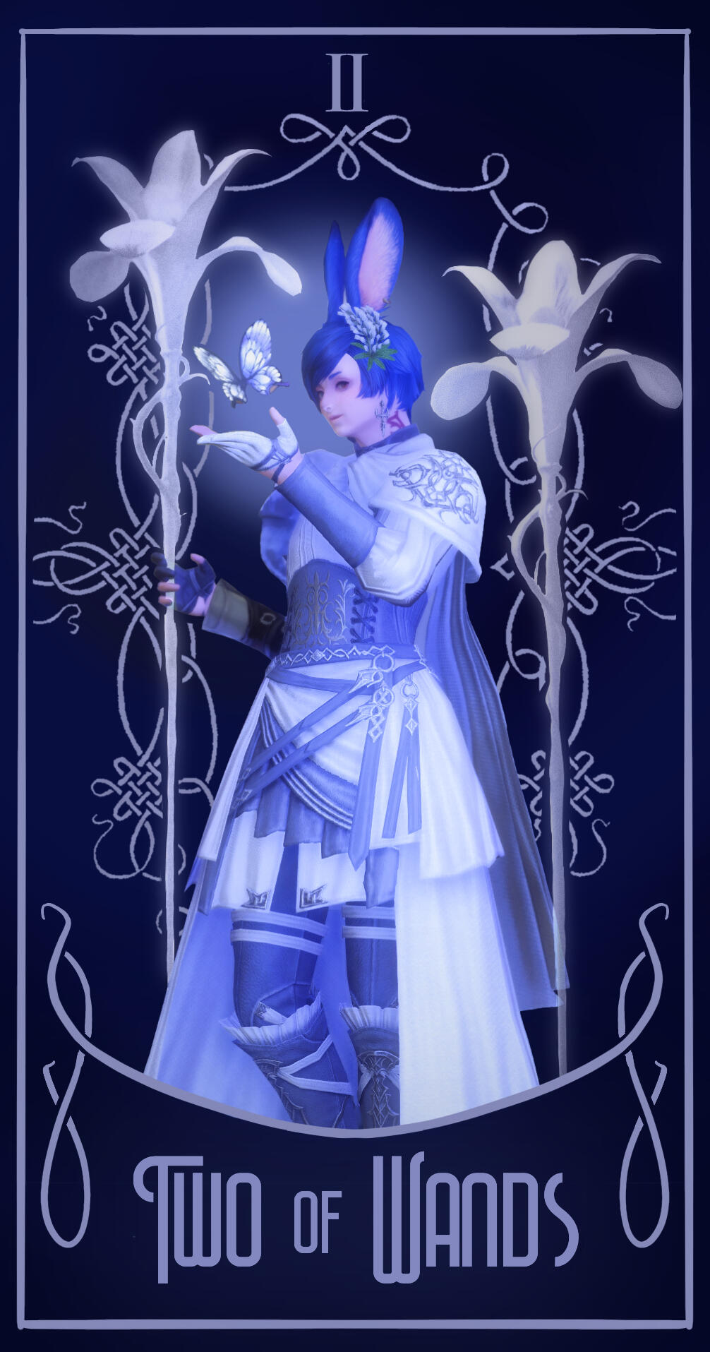 The choice for the card was due to its themes of love and success- as of 6.5- Sappho is happy with a loving girlfriend in Zero and is recovering from Endwalker and all that came before. Her path is looking up, and even reversed has good fortune, and the card also represents femininity, and Sappho is Hyper-Feminine so that matched well.As for the card itself, the elpis blooms and planet behind her representing her triumph over all that was ENW and before. She holds her red mage weapon proudly, and with the focus attached to make a staff as reference to the posing of a lot of other Empress tarot cards. She also has the azem symbol behind her head- its supposed to mimic the holy halos in older christian art while also being related to fourteen and her as a shard of Azem. But the underlying reason to all of this was I just thought it looked really cool.