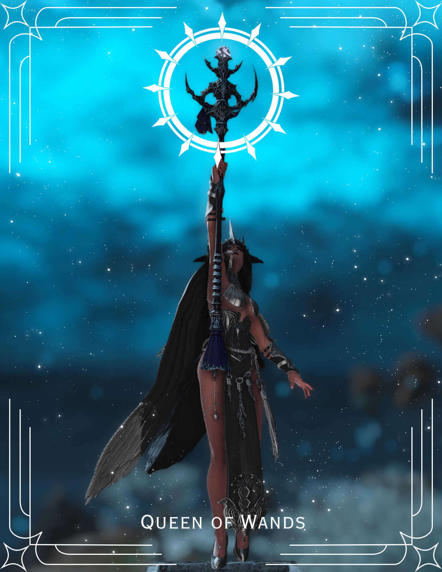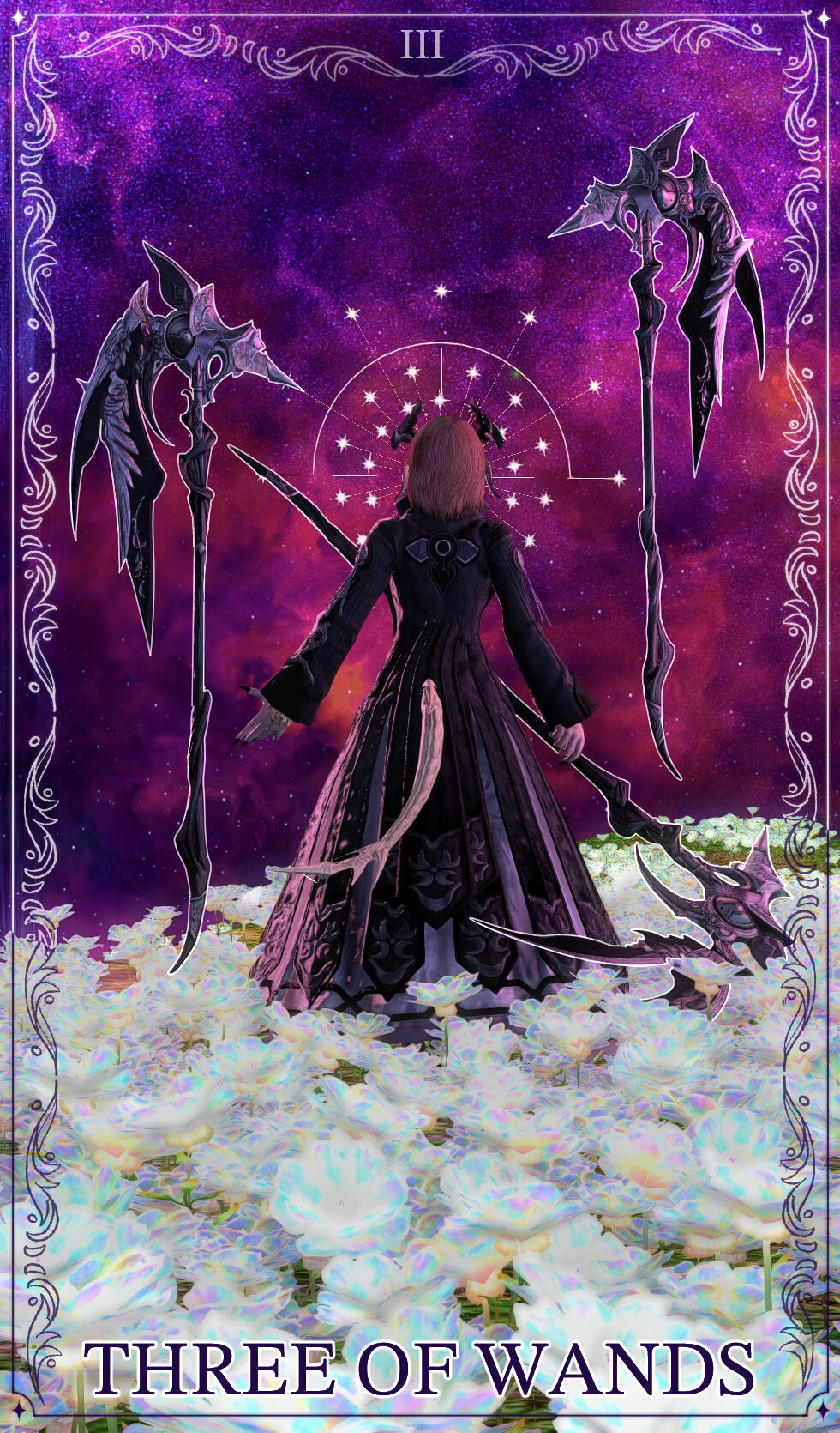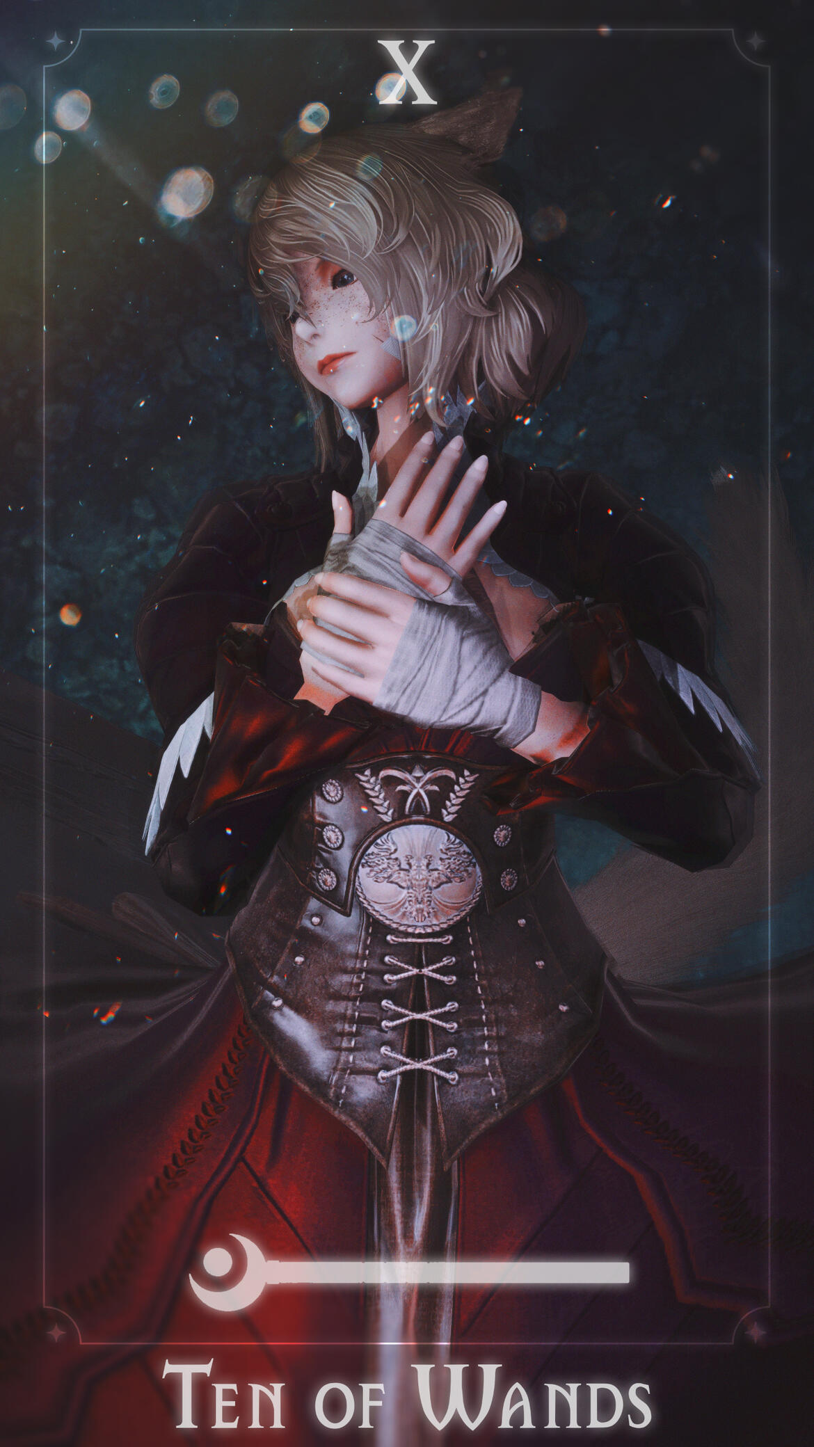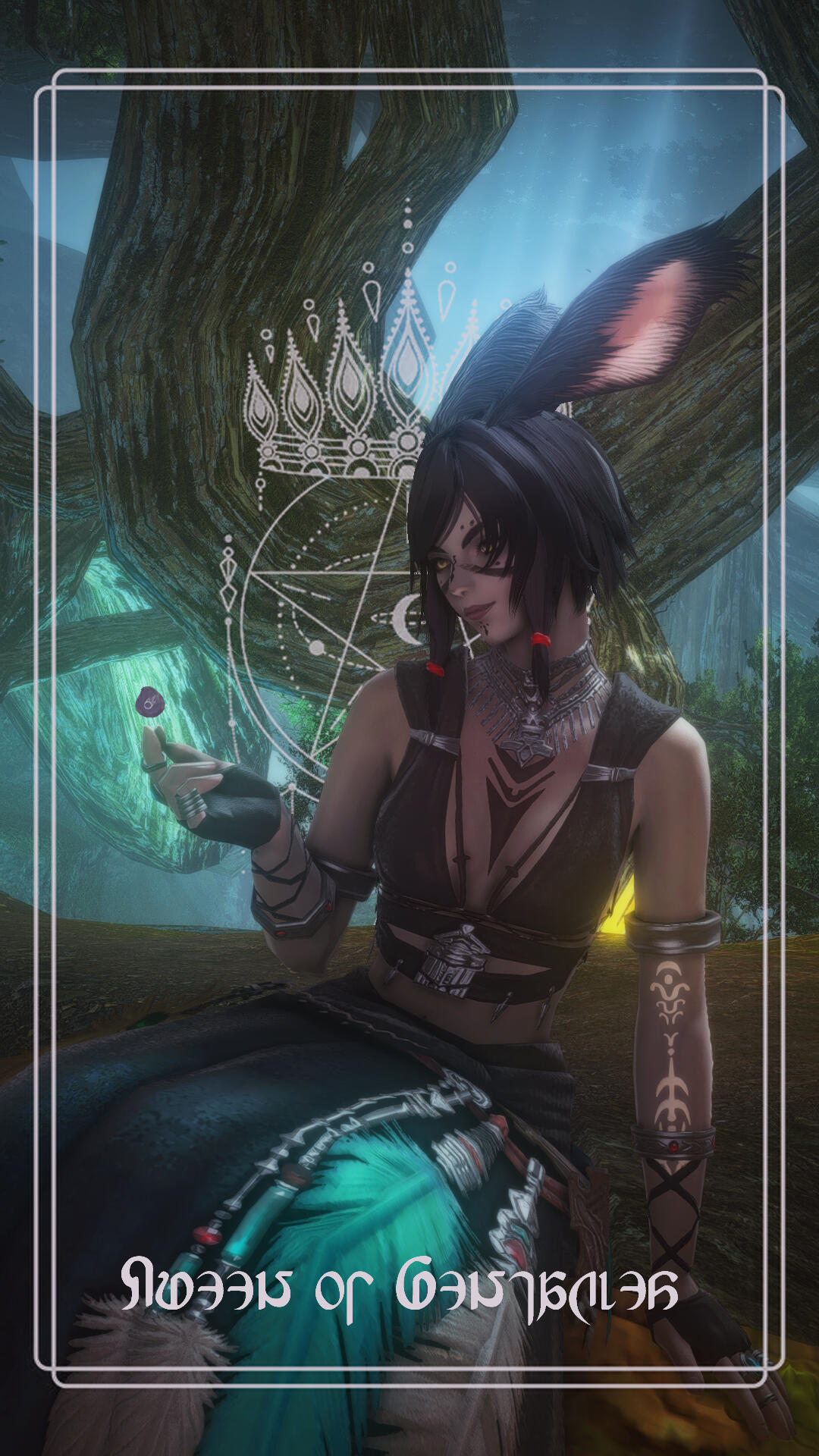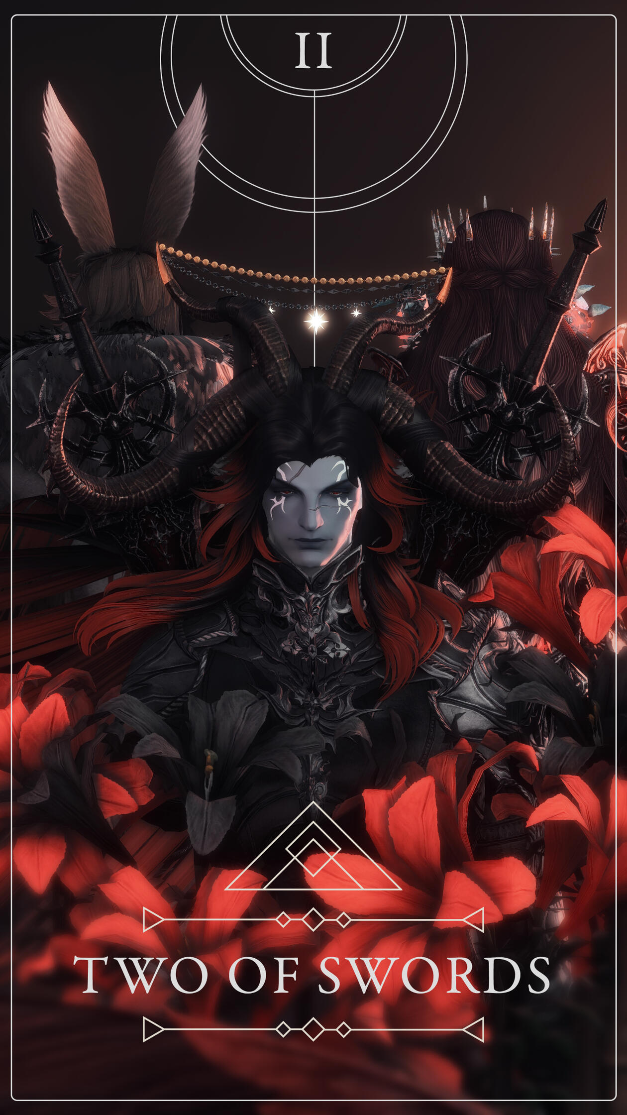 The choice for the card was due to its themes of love and success- as of 6.5- Sappho is happy with a loving girlfriend in Zero and is recovering from Endwalker and all that came before. Her path is looking up, and even reversed has good fortune, and the card also represents femininity, and Sappho is Hyper-Feminine so that matched well.As for the card itself, the elpis blooms and planet behind her representing her triumph over all that was ENW and before. She holds her red mage weapon proudly, and with the focus attached to make a staff as reference to the posing of a lot of other Empress tarot cards. She also has the azem symbol behind her head- its supposed to mimic the holy halos in older christian art while also being related to fourteen and her as a shard of Azem. But the underlying reason to all of this was I just thought it looked really cool.