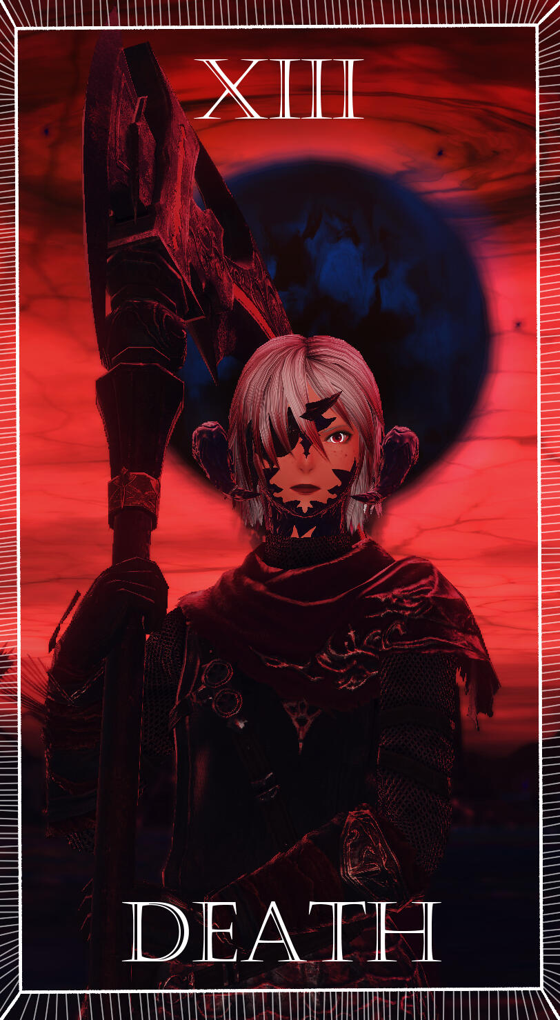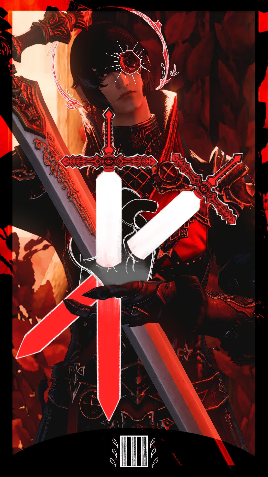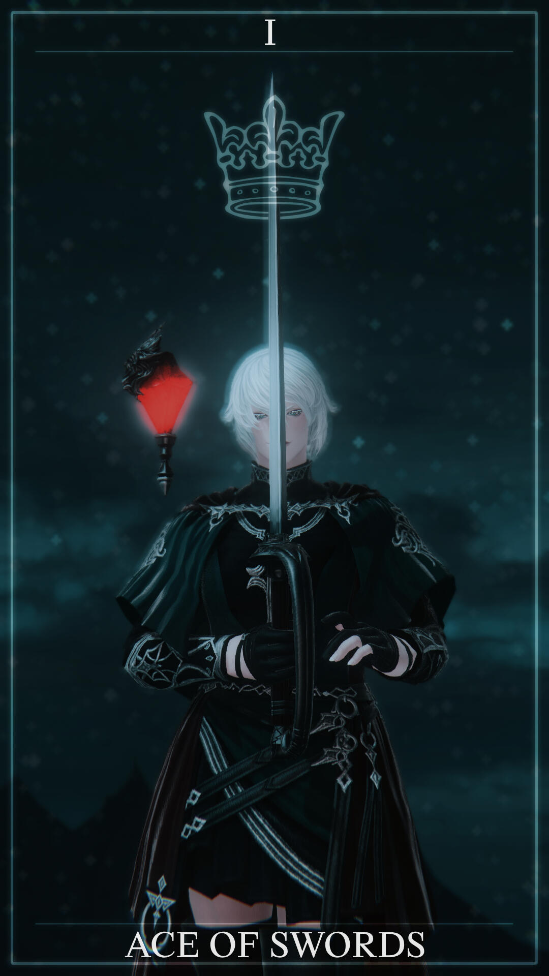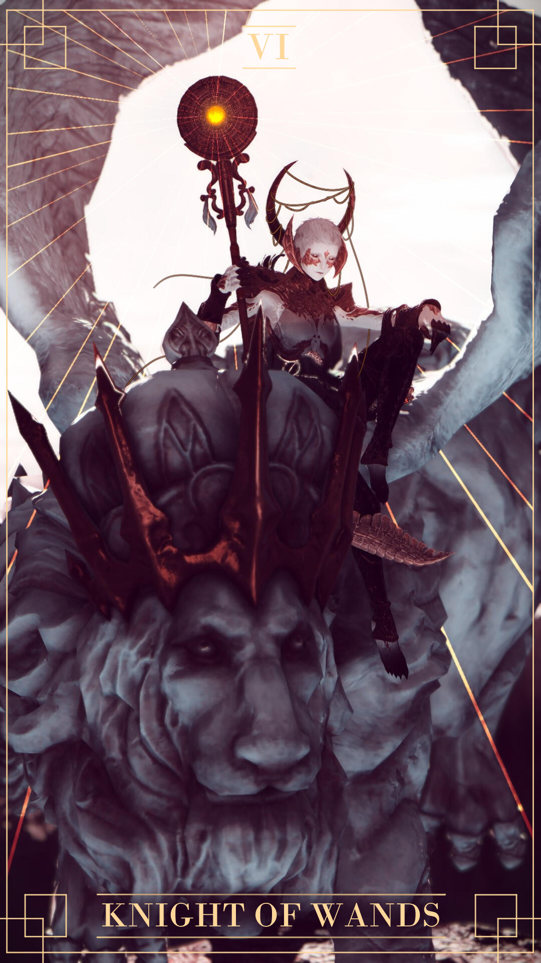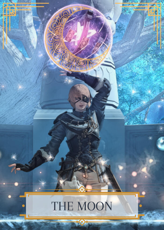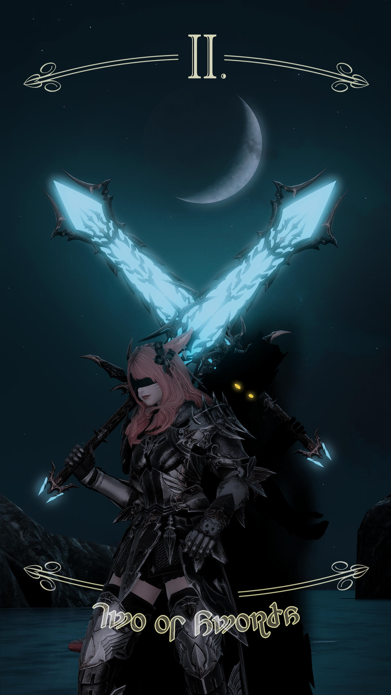 The choice for the card was due to its themes of love and success- as of 6.5- Sappho is happy with a loving girlfriend in Zero and is recovering from Endwalker and all that came before. Her path is looking up, and even reversed has good fortune, and the card also represents femininity, and Sappho is Hyper-Feminine so that matched well.As for the card itself, the elpis blooms and planet behind her representing her triumph over all that was ENW and before. She holds her red mage weapon proudly, and with the focus attached to make a staff as reference to the posing of a lot of other Empress tarot cards. She also has the azem symbol behind her head- its supposed to mimic the holy halos in older christian art while also being related to fourteen and her as a shard of Azem. But the underlying reason to all of this was I just thought it looked really cool.