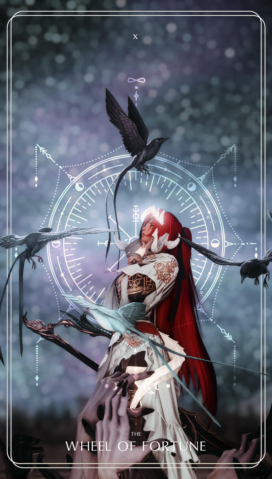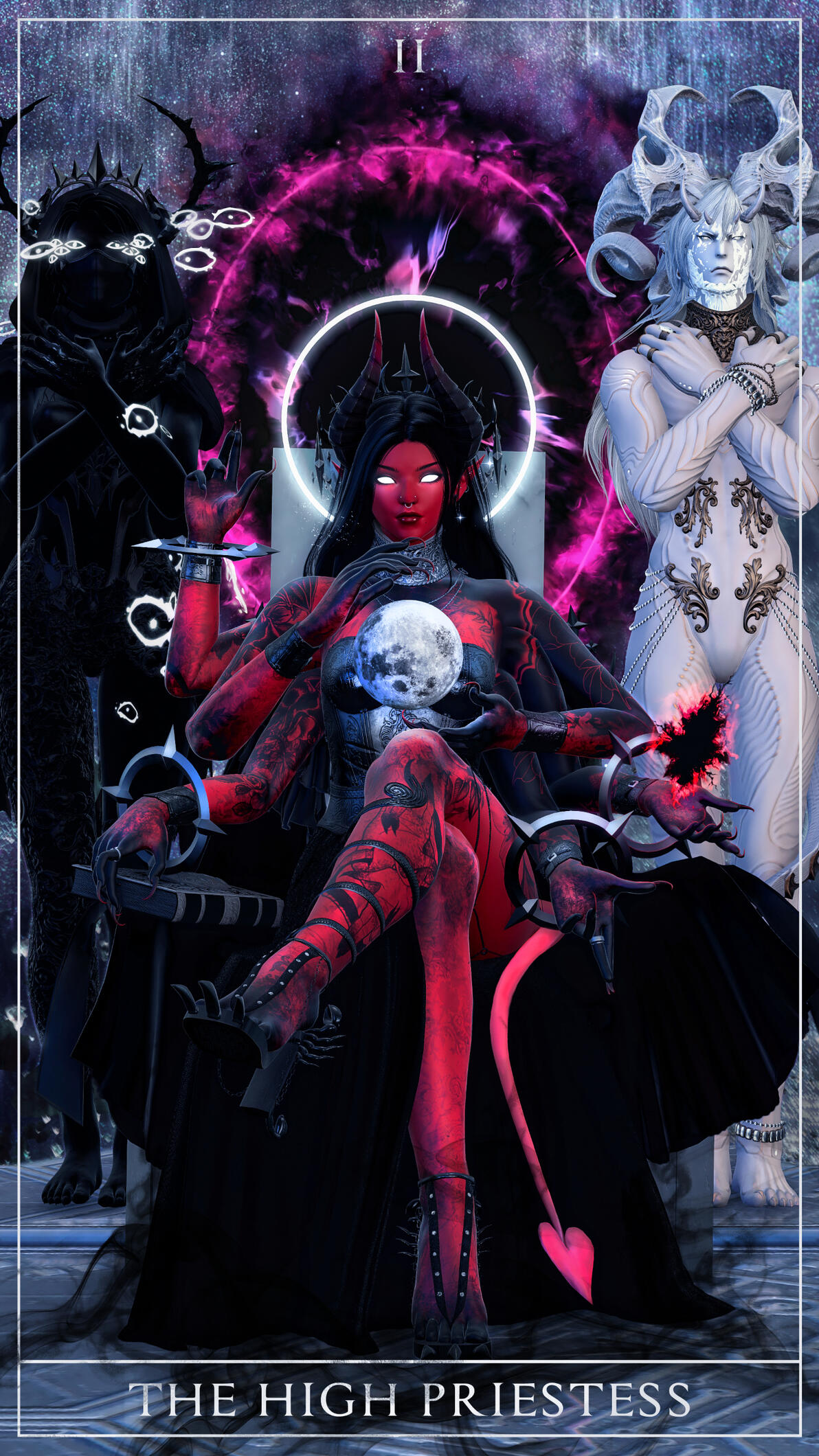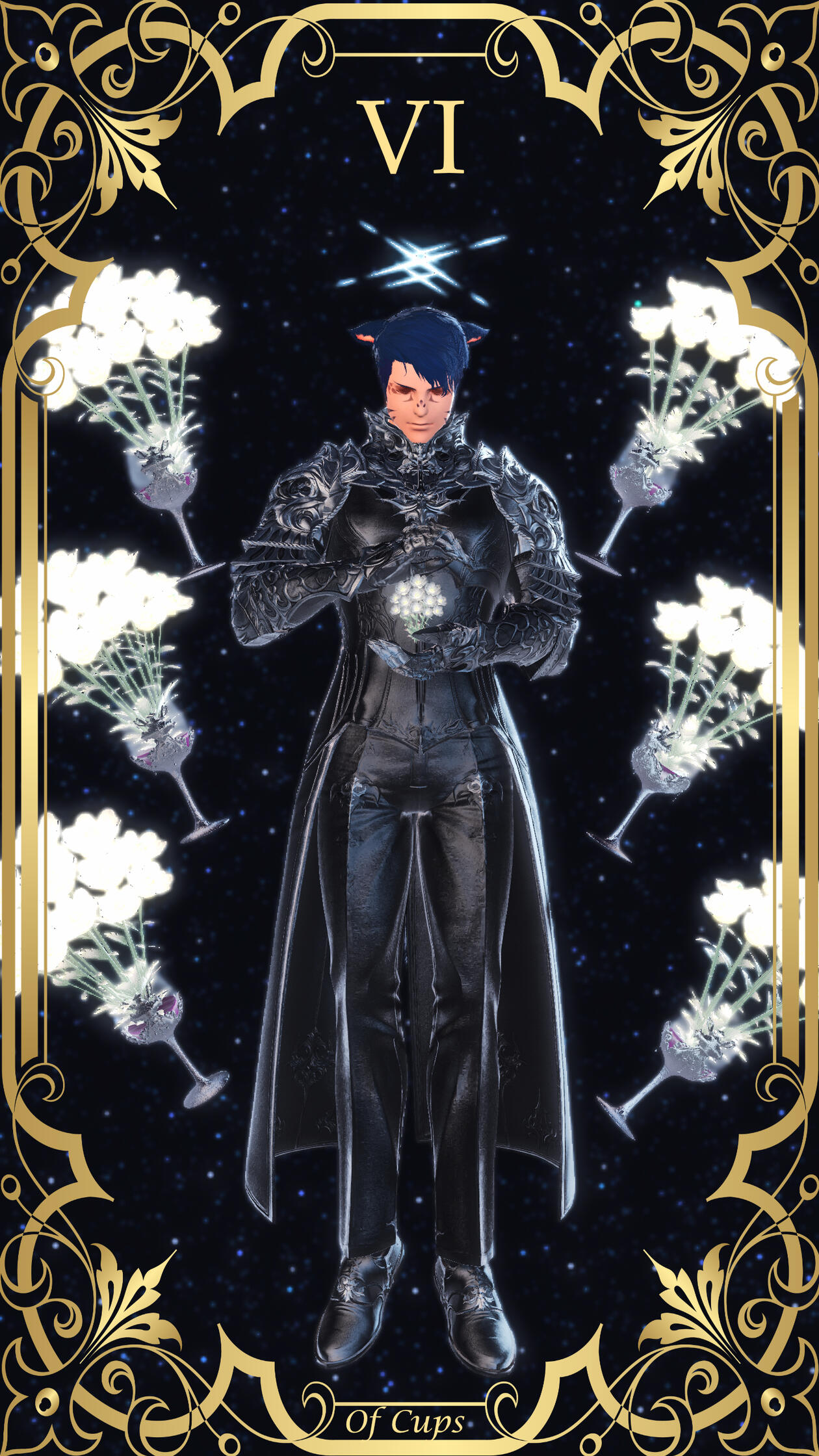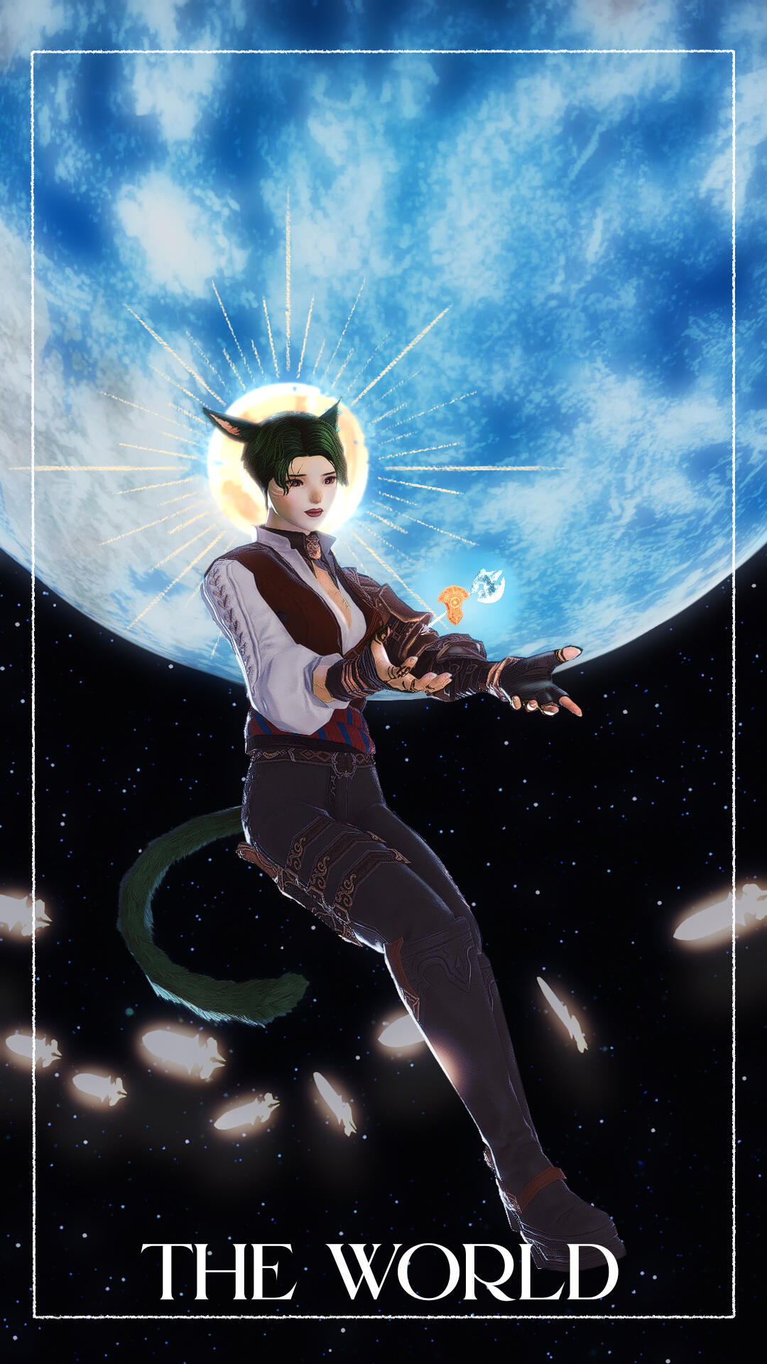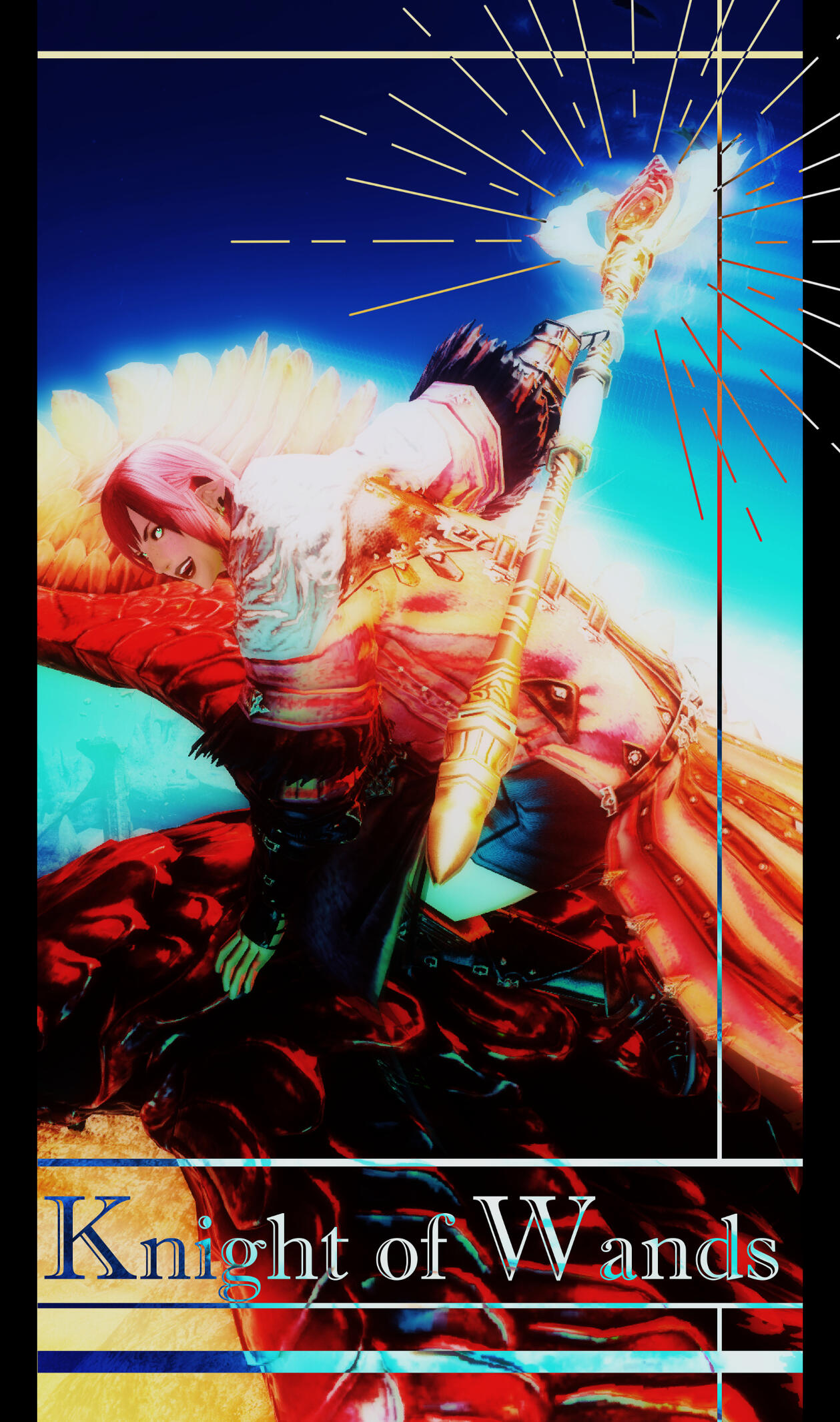 The choice for the card was due to its themes of love and success- as of 6.5- Sappho is happy with a loving girlfriend in Zero and is recovering from Endwalker and all that came before. Her path is looking up, and even reversed has good fortune, and the card also represents femininity, and Sappho is Hyper-Feminine so that matched well.As for the card itself, the elpis blooms and planet behind her representing her triumph over all that was ENW and before. She holds her red mage weapon proudly, and with the focus attached to make a staff as reference to the posing of a lot of other Empress tarot cards. She also has the azem symbol behind her head- its supposed to mimic the holy halos in older christian art while also being related to fourteen and her as a shard of Azem. But the underlying reason to all of this was I just thought it looked really cool.