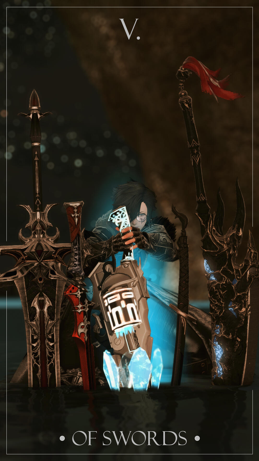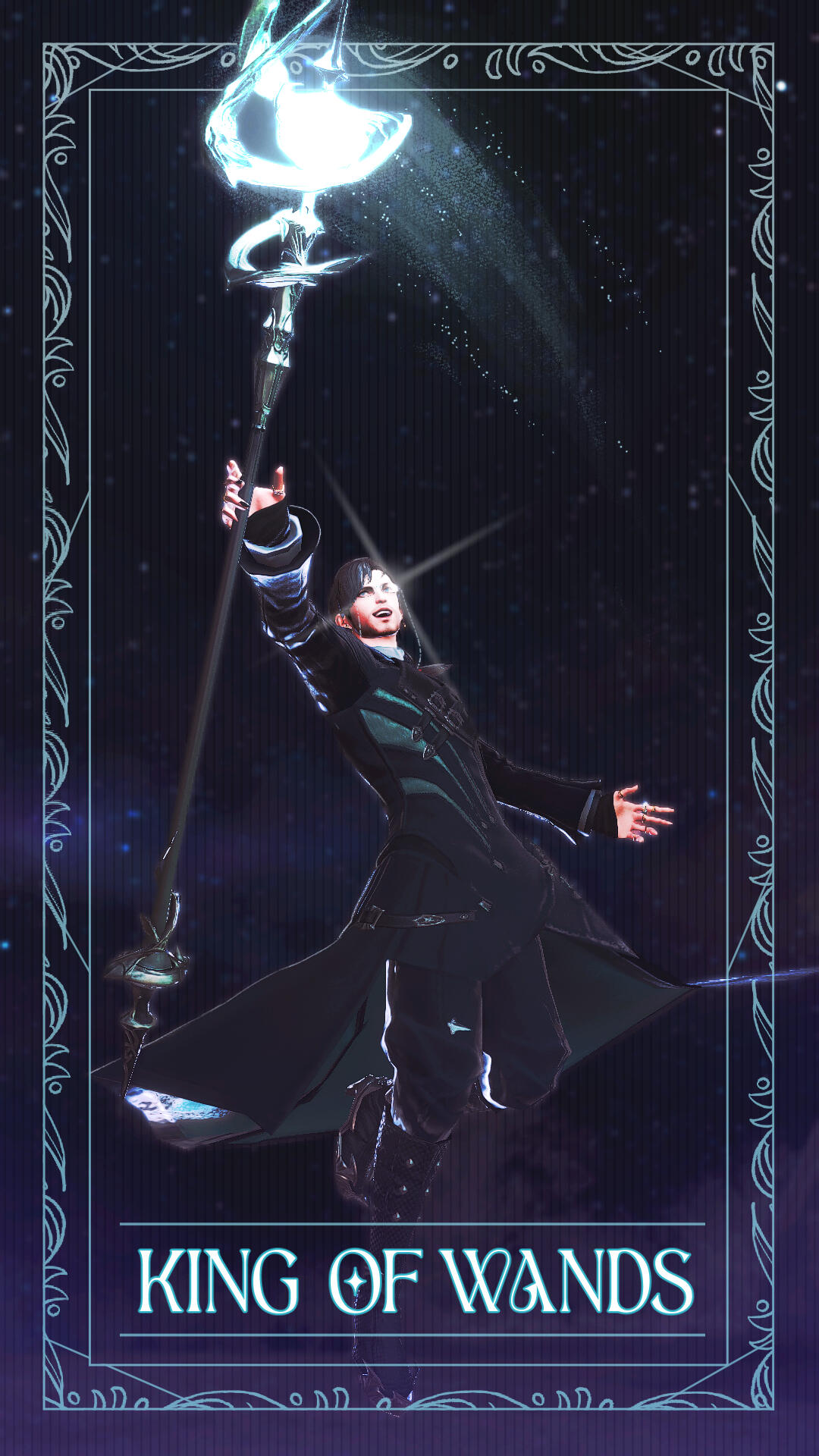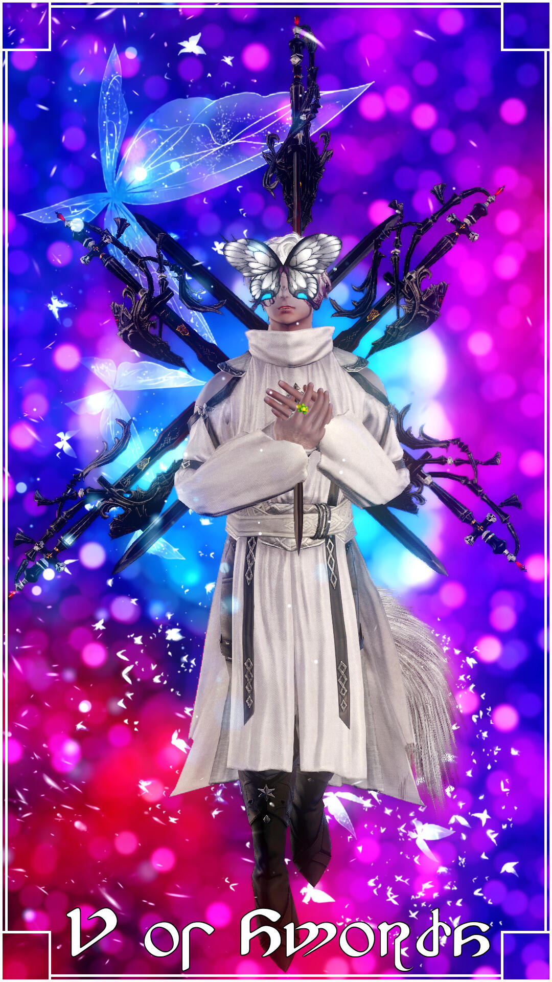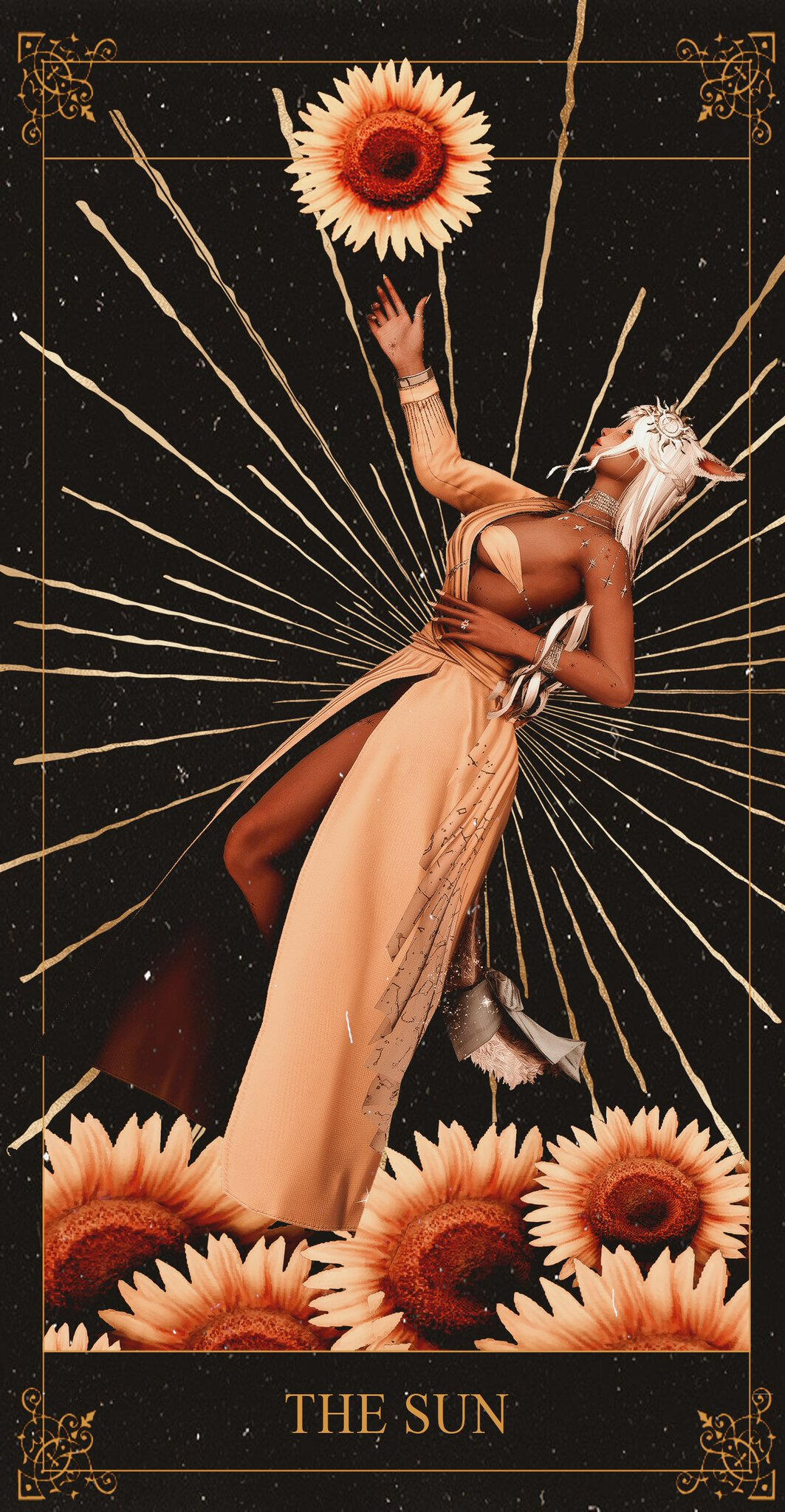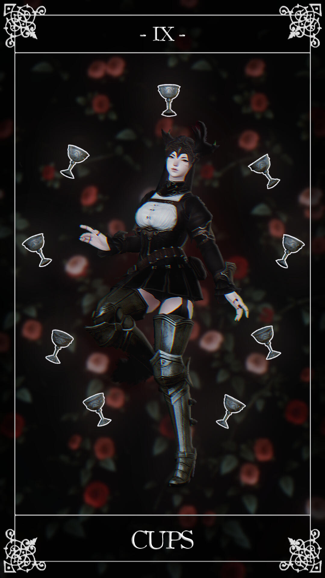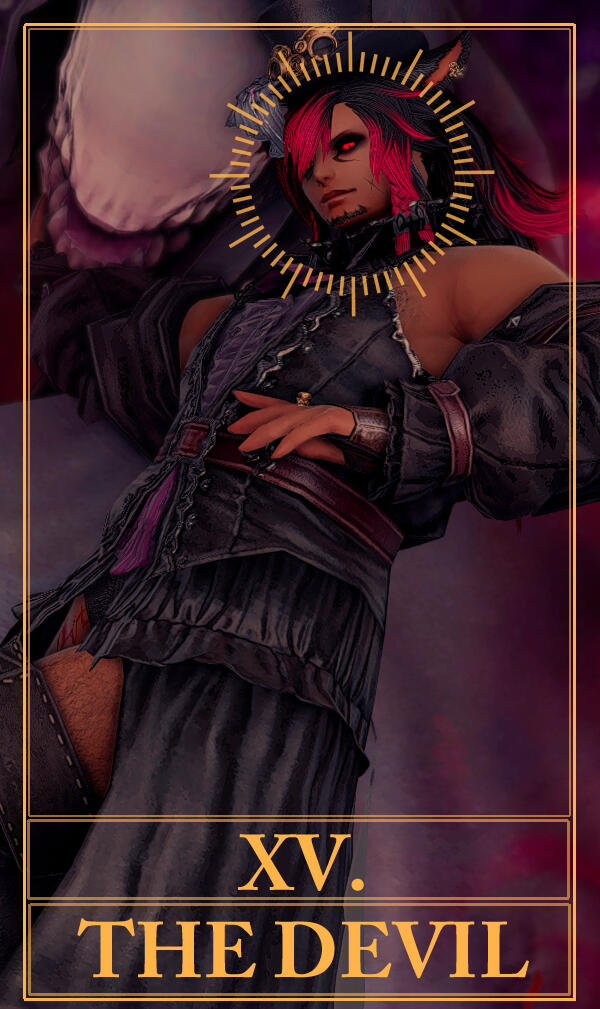 The choice for the card was due to its themes of love and success- as of 6.5- Sappho is happy with a loving girlfriend in Zero and is recovering from Endwalker and all that came before. Her path is looking up, and even reversed has good fortune, and the card also represents femininity, and Sappho is Hyper-Feminine so that matched well.As for the card itself, the elpis blooms and planet behind her representing her triumph over all that was ENW and before. She holds her red mage weapon proudly, and with the focus attached to make a staff as reference to the posing of a lot of other Empress tarot cards. She also has the azem symbol behind her head- its supposed to mimic the holy halos in older christian art while also being related to fourteen and her as a shard of Azem. But the underlying reason to all of this was I just thought it looked really cool.