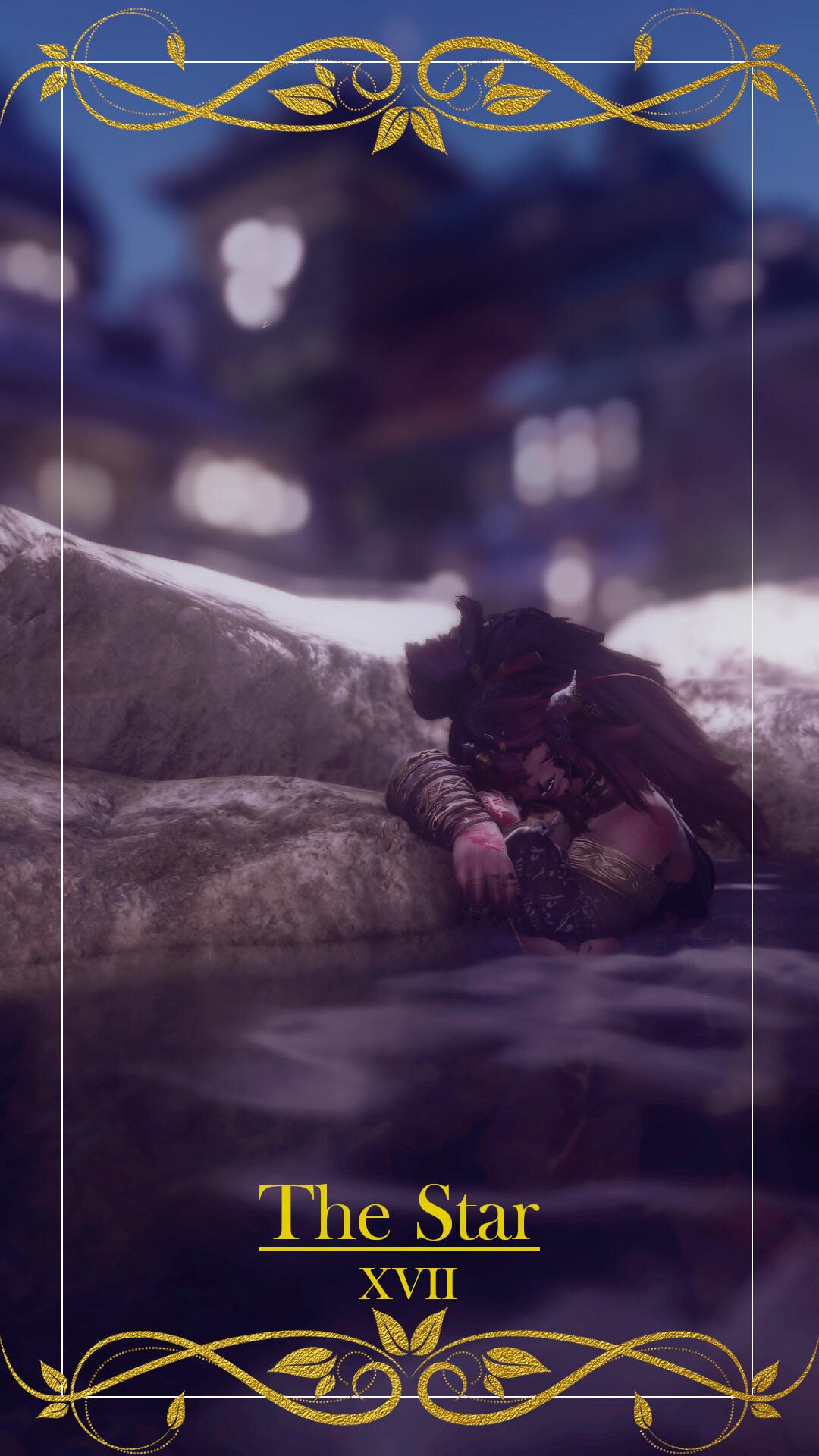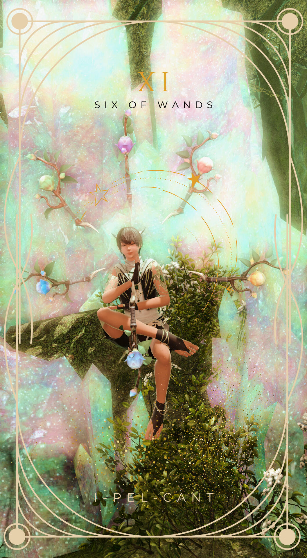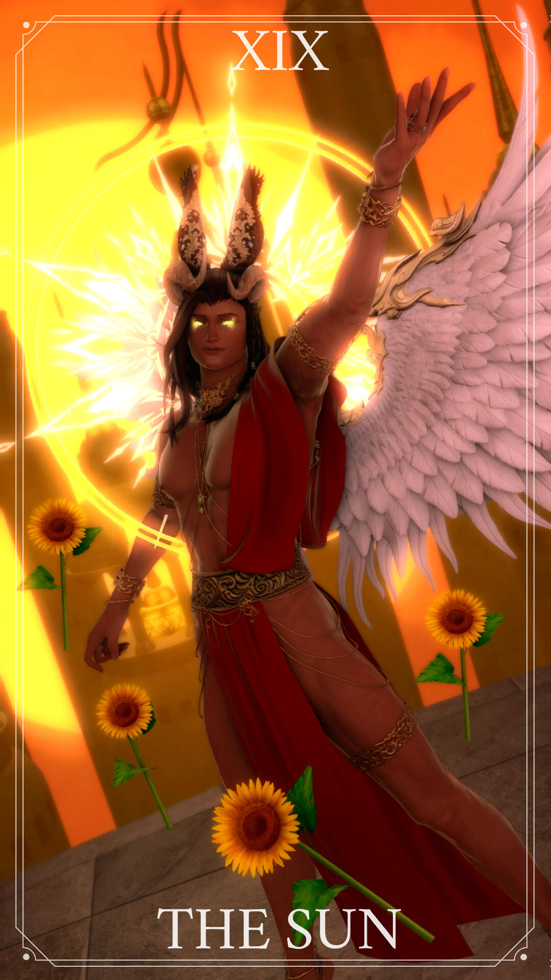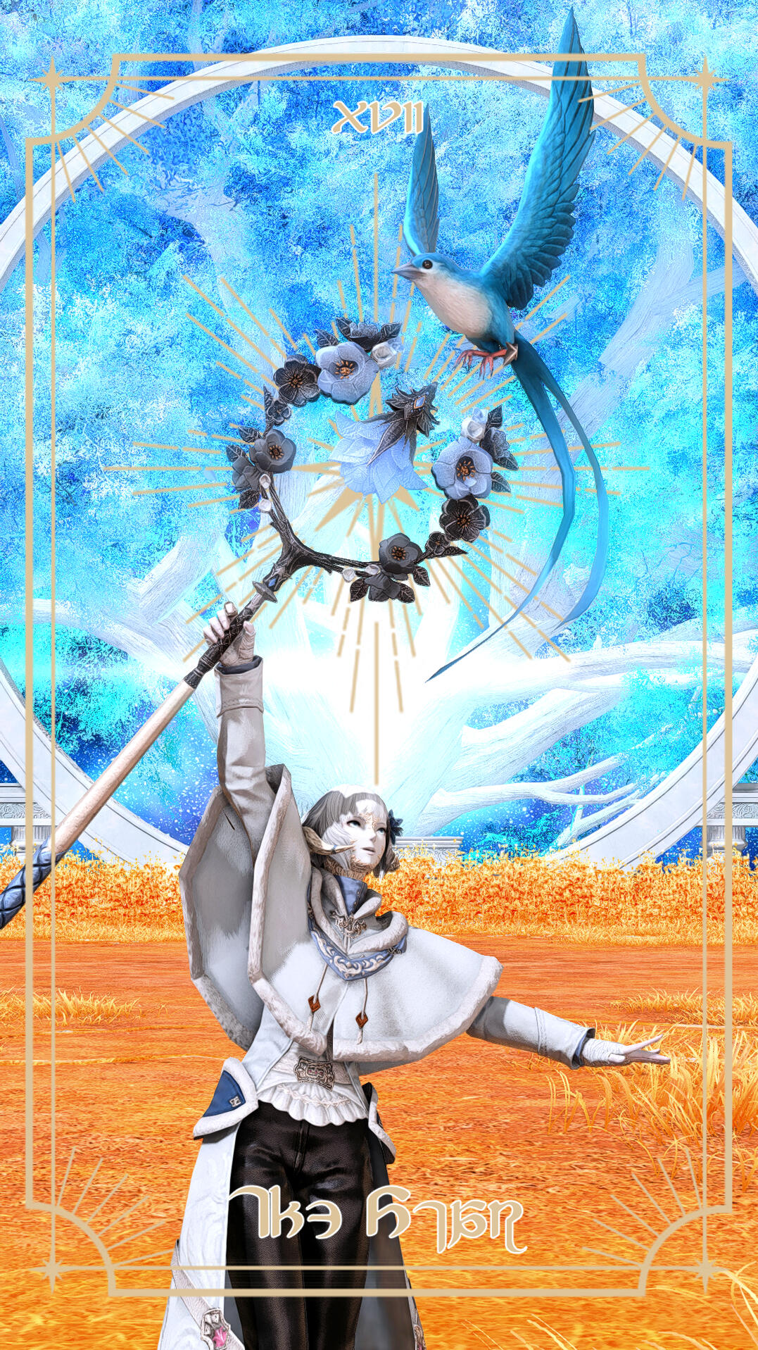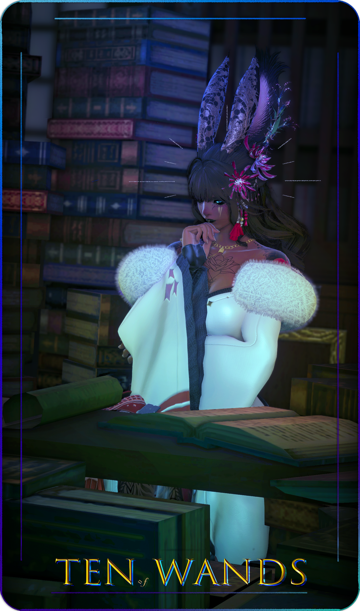 The choice for the card was due to its themes of love and success- as of 6.5- Sappho is happy with a loving girlfriend in Zero and is recovering from Endwalker and all that came before. Her path is looking up, and even reversed has good fortune, and the card also represents femininity, and Sappho is Hyper-Feminine so that matched well.As for the card itself, the elpis blooms and planet behind her representing her triumph over all that was ENW and before. She holds her red mage weapon proudly, and with the focus attached to make a staff as reference to the posing of a lot of other Empress tarot cards. She also has the azem symbol behind her head- its supposed to mimic the holy halos in older christian art while also being related to fourteen and her as a shard of Azem. But the underlying reason to all of this was I just thought it looked really cool.