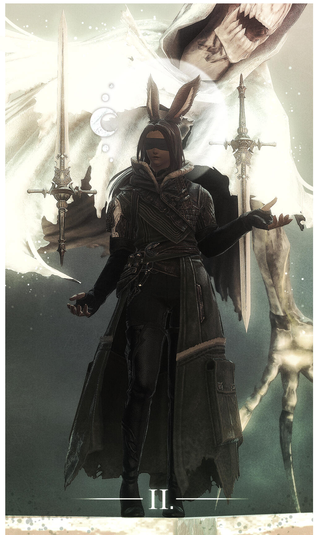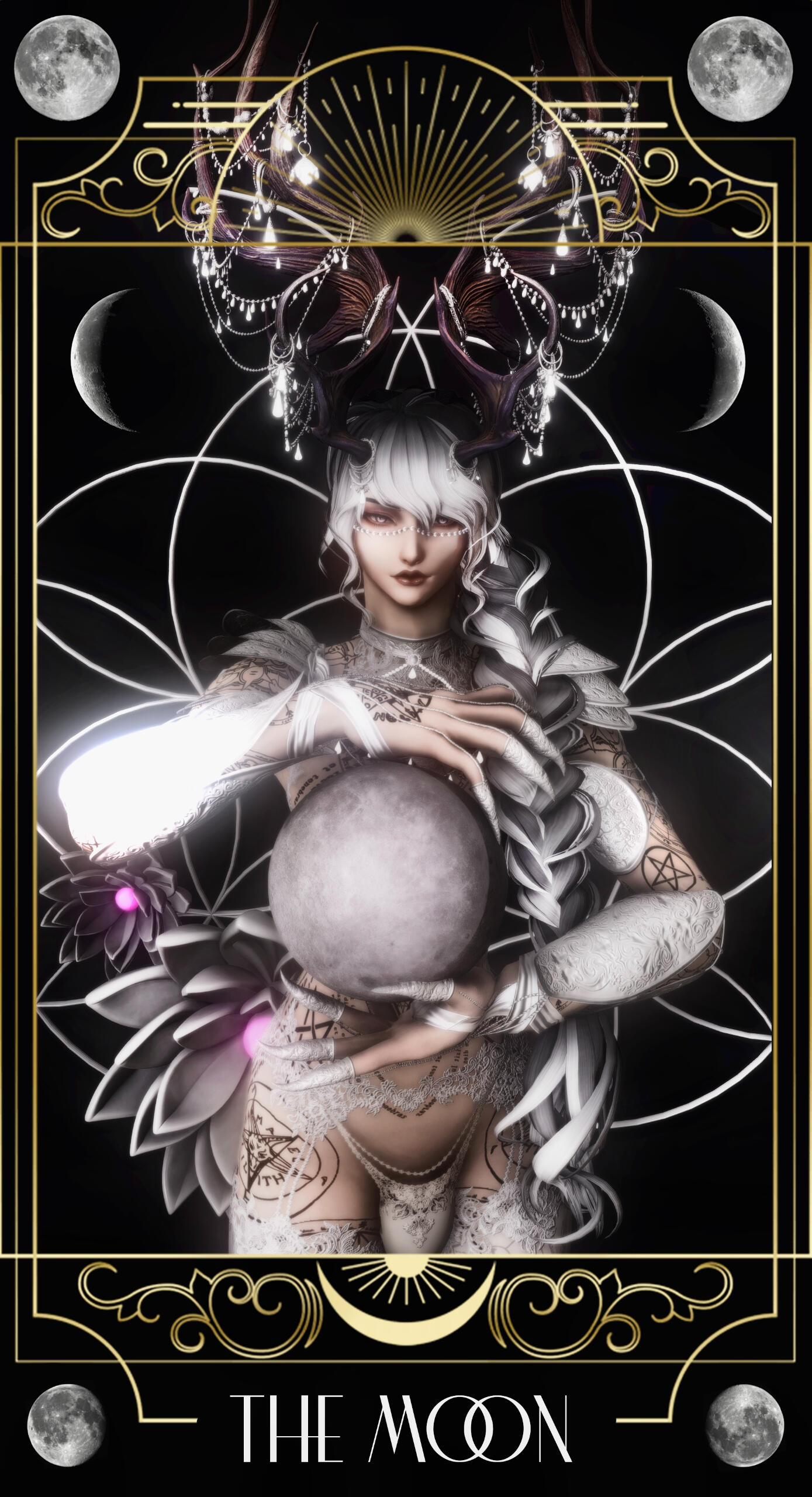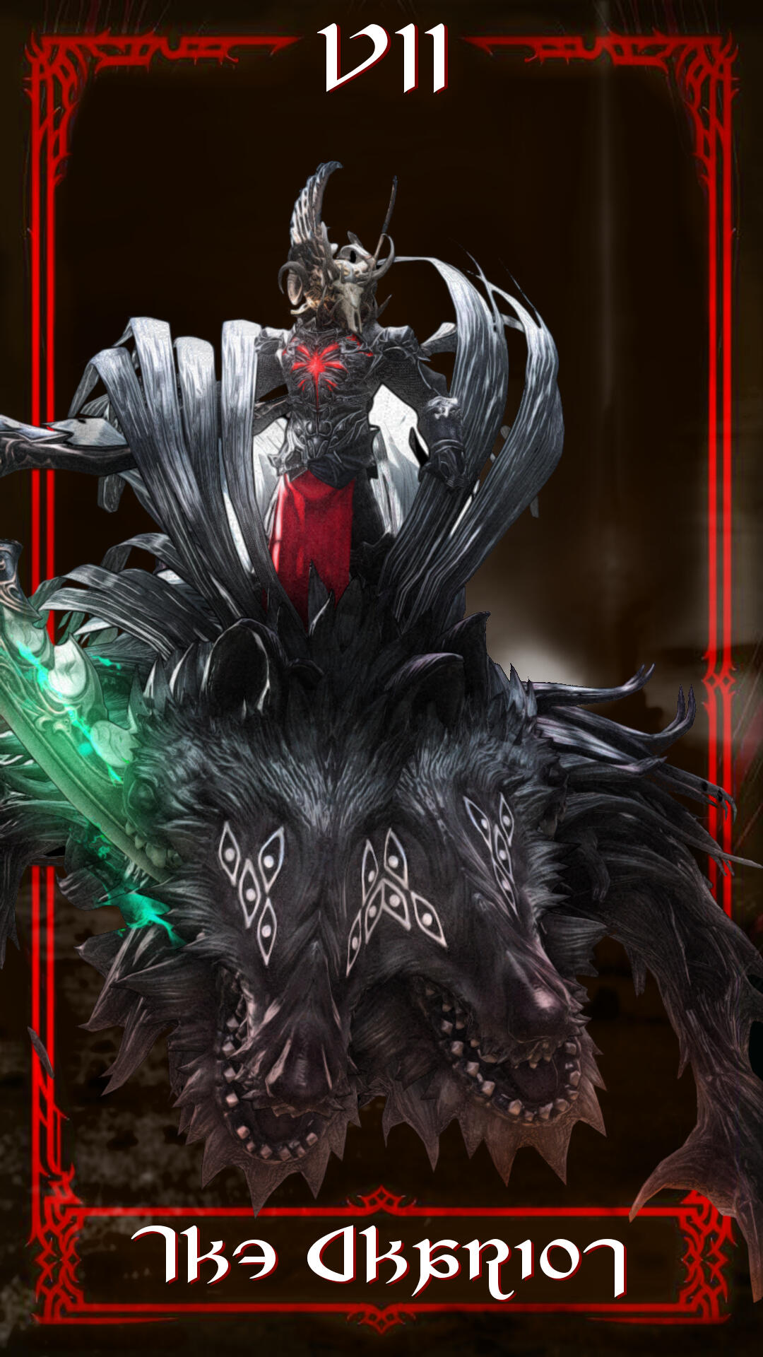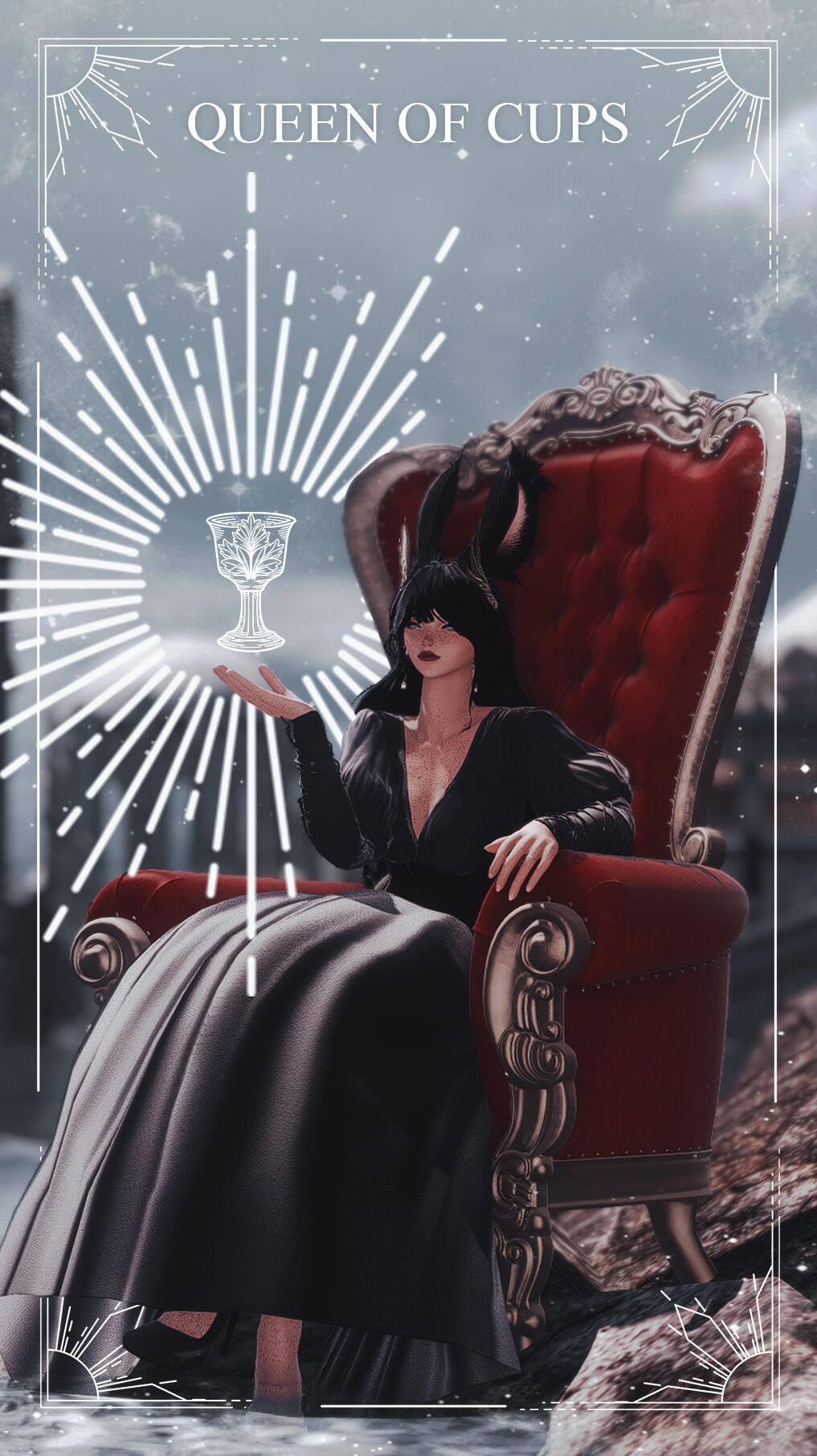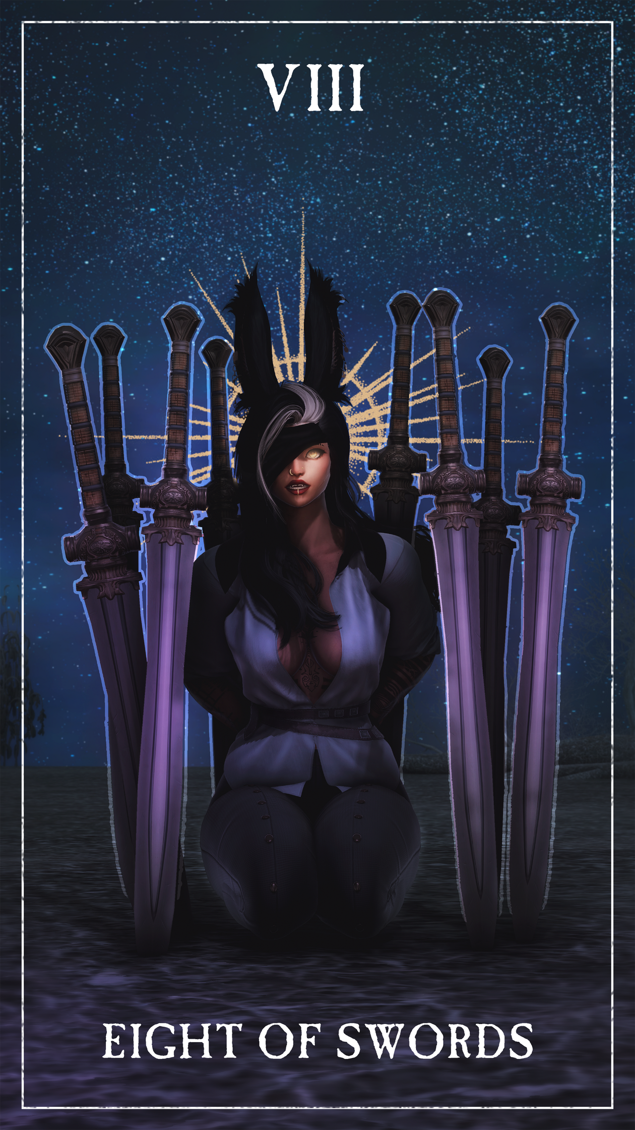 The choice for the card was due to its themes of love and success- as of 6.5- Sappho is happy with a loving girlfriend in Zero and is recovering from Endwalker and all that came before. Her path is looking up, and even reversed has good fortune, and the card also represents femininity, and Sappho is Hyper-Feminine so that matched well.As for the card itself, the elpis blooms and planet behind her representing her triumph over all that was ENW and before. She holds her red mage weapon proudly, and with the focus attached to make a staff as reference to the posing of a lot of other Empress tarot cards. She also has the azem symbol behind her head- its supposed to mimic the holy halos in older christian art while also being related to fourteen and her as a shard of Azem. But the underlying reason to all of this was I just thought it looked really cool.