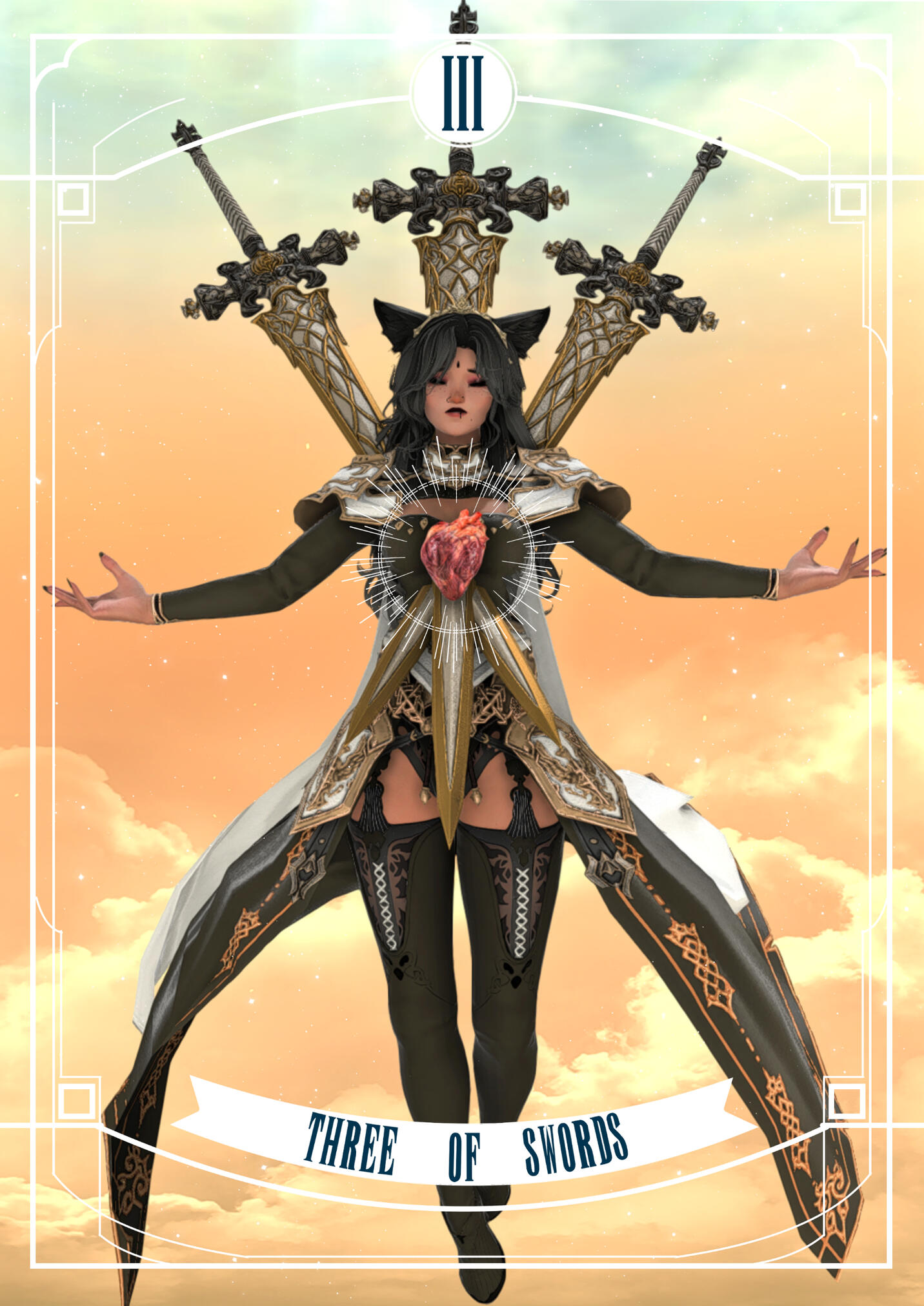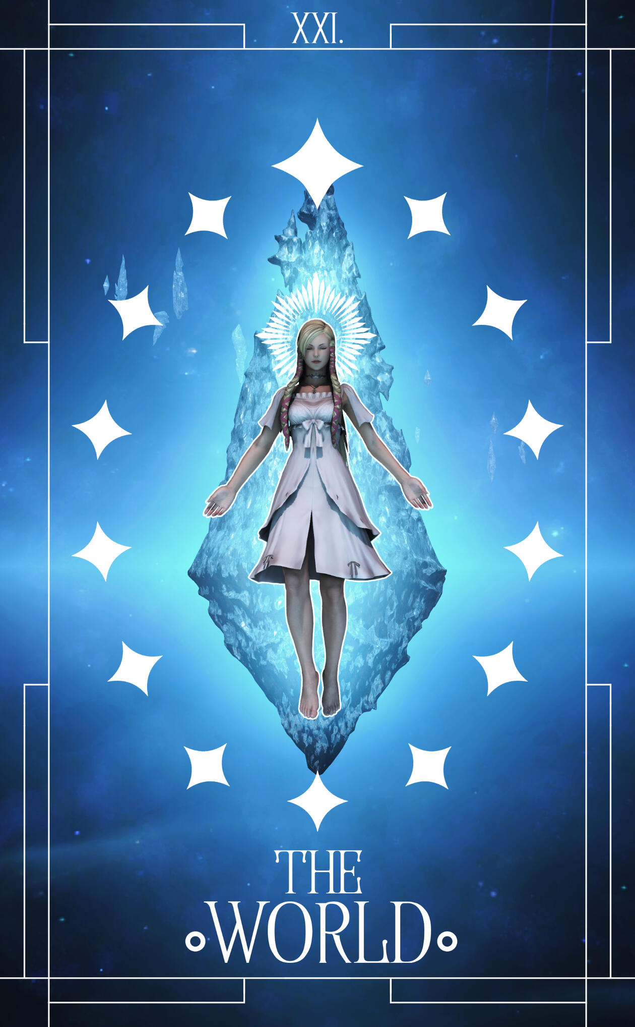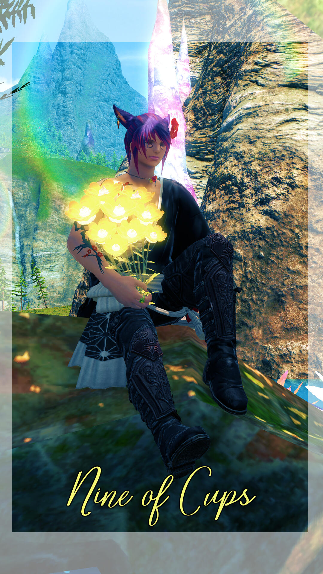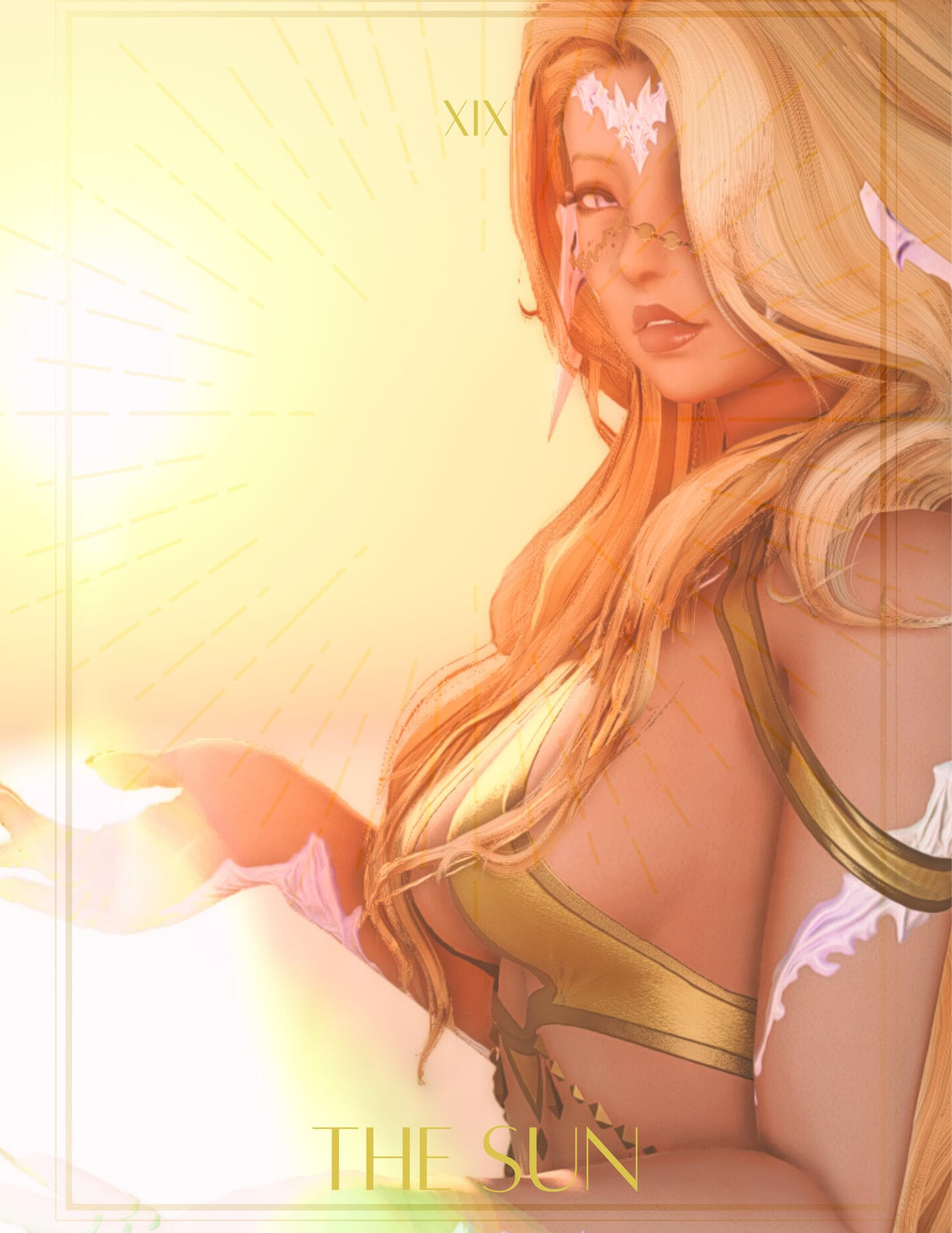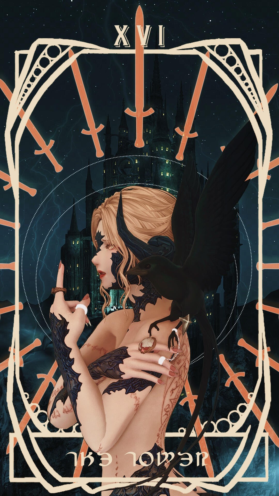 The choice for the card was due to its themes of love and success- as of 6.5- Sappho is happy with a loving girlfriend in Zero and is recovering from Endwalker and all that came before. Her path is looking up, and even reversed has good fortune, and the card also represents femininity, and Sappho is Hyper-Feminine so that matched well.As for the card itself, the elpis blooms and planet behind her representing her triumph over all that was ENW and before. She holds her red mage weapon proudly, and with the focus attached to make a staff as reference to the posing of a lot of other Empress tarot cards. She also has the azem symbol behind her head- its supposed to mimic the holy halos in older christian art while also being related to fourteen and her as a shard of Azem. But the underlying reason to all of this was I just thought it looked really cool.