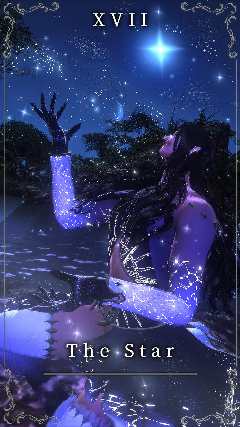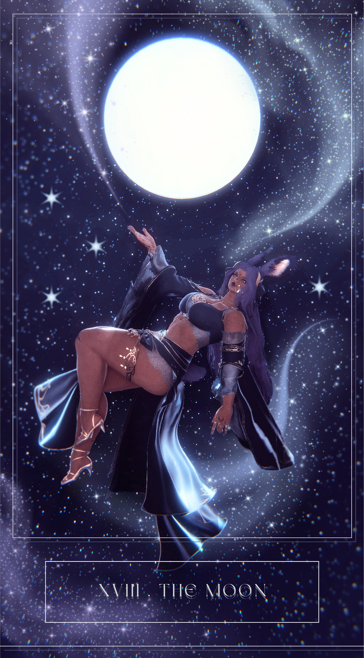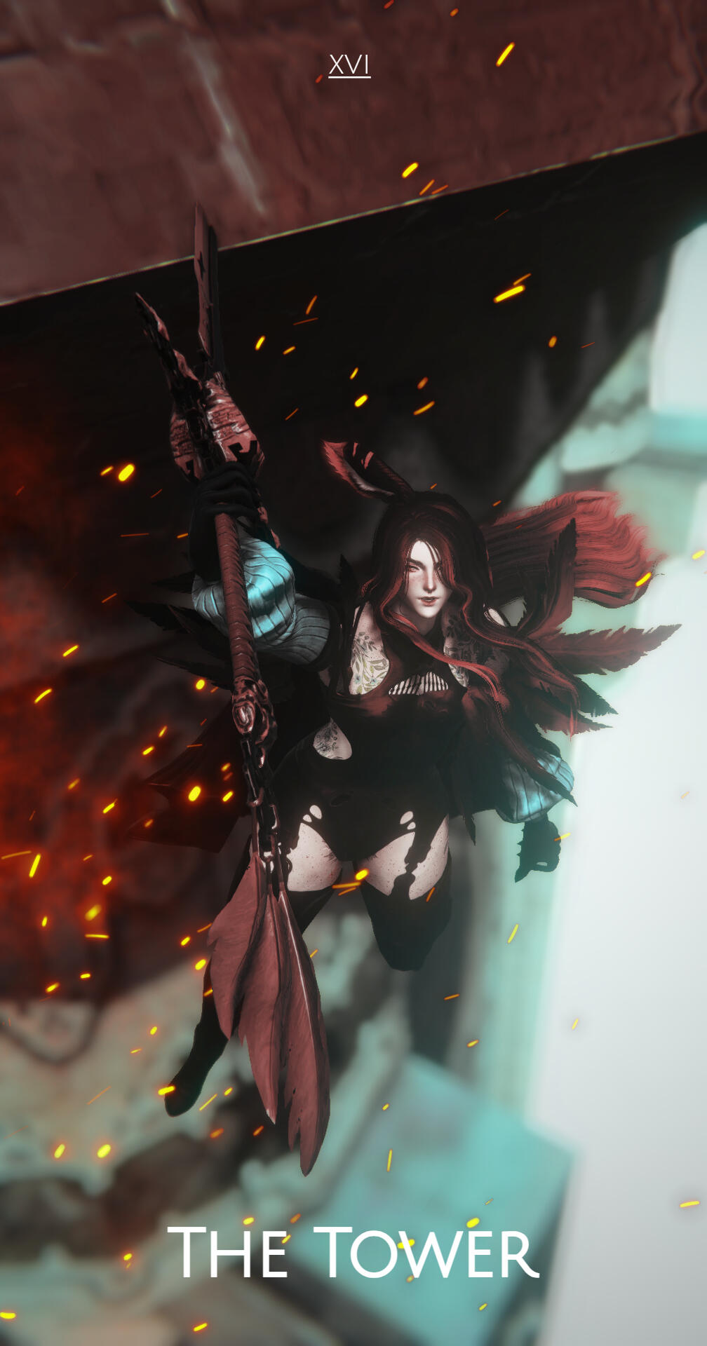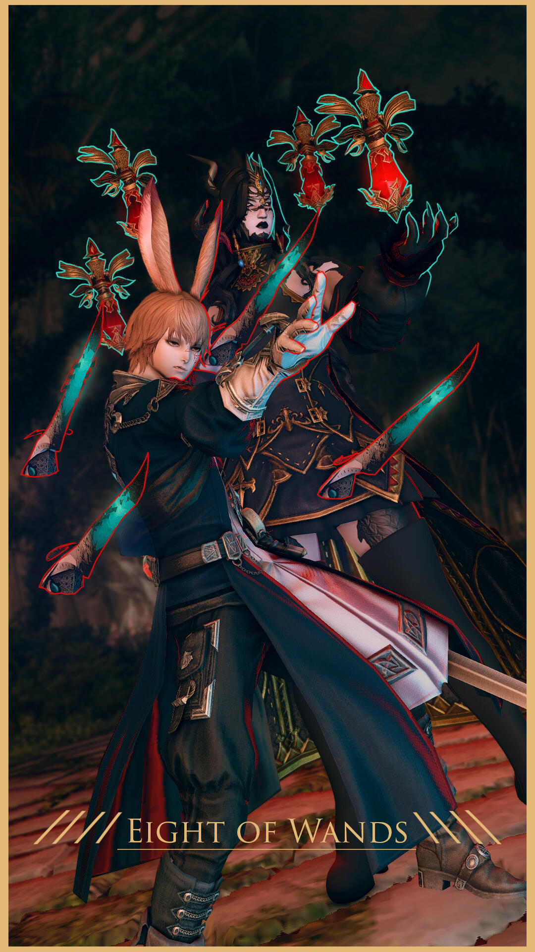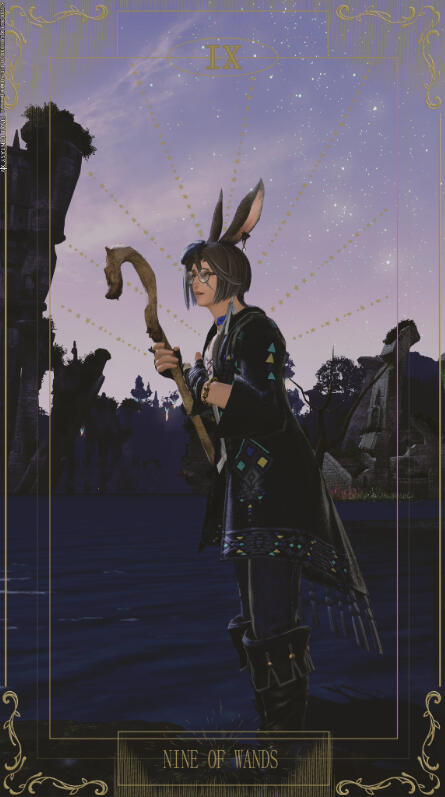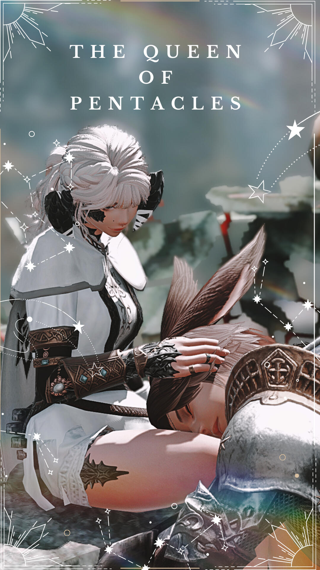 The choice for the card was due to its themes of love and success- as of 6.5- Sappho is happy with a loving girlfriend in Zero and is recovering from Endwalker and all that came before. Her path is looking up, and even reversed has good fortune, and the card also represents femininity, and Sappho is Hyper-Feminine so that matched well.As for the card itself, the elpis blooms and planet behind her representing her triumph over all that was ENW and before. She holds her red mage weapon proudly, and with the focus attached to make a staff as reference to the posing of a lot of other Empress tarot cards. She also has the azem symbol behind her head- its supposed to mimic the holy halos in older christian art while also being related to fourteen and her as a shard of Azem. But the underlying reason to all of this was I just thought it looked really cool.