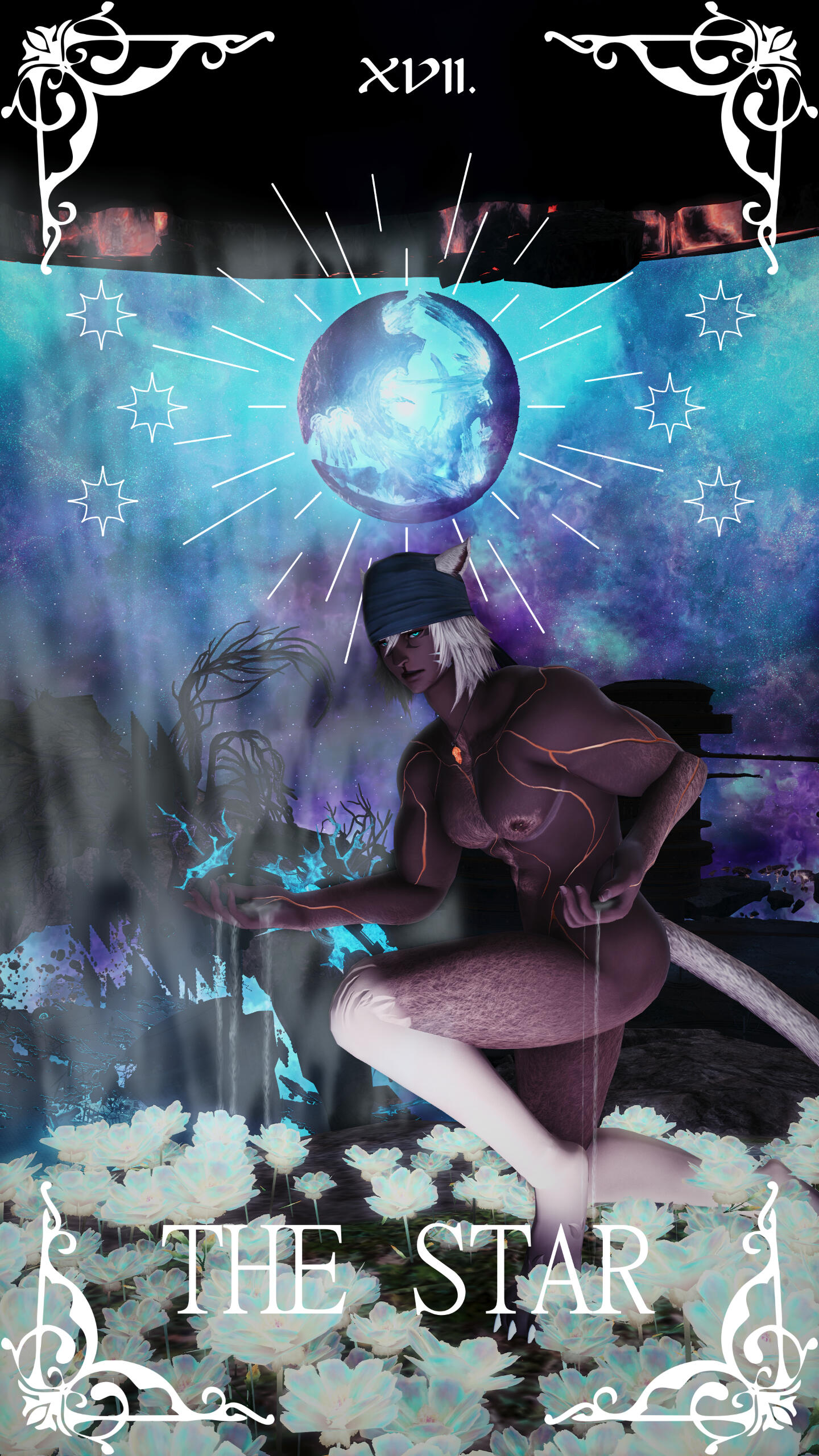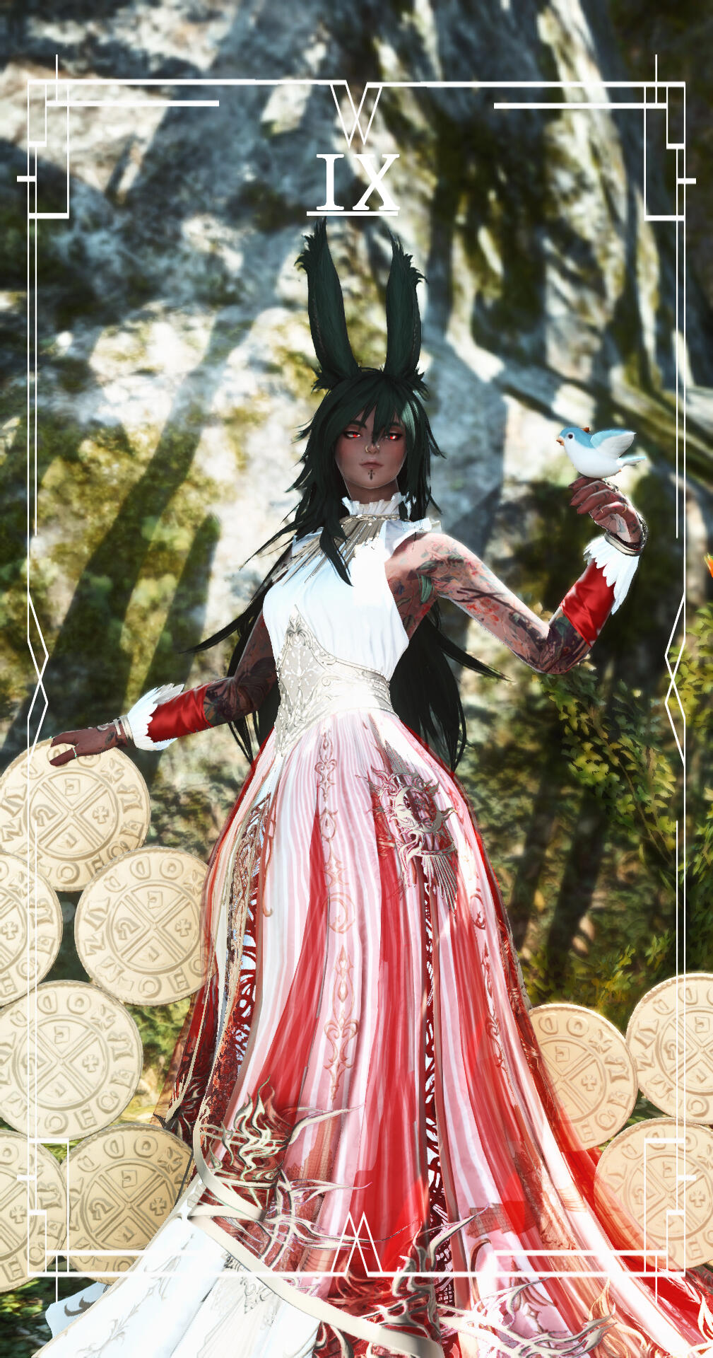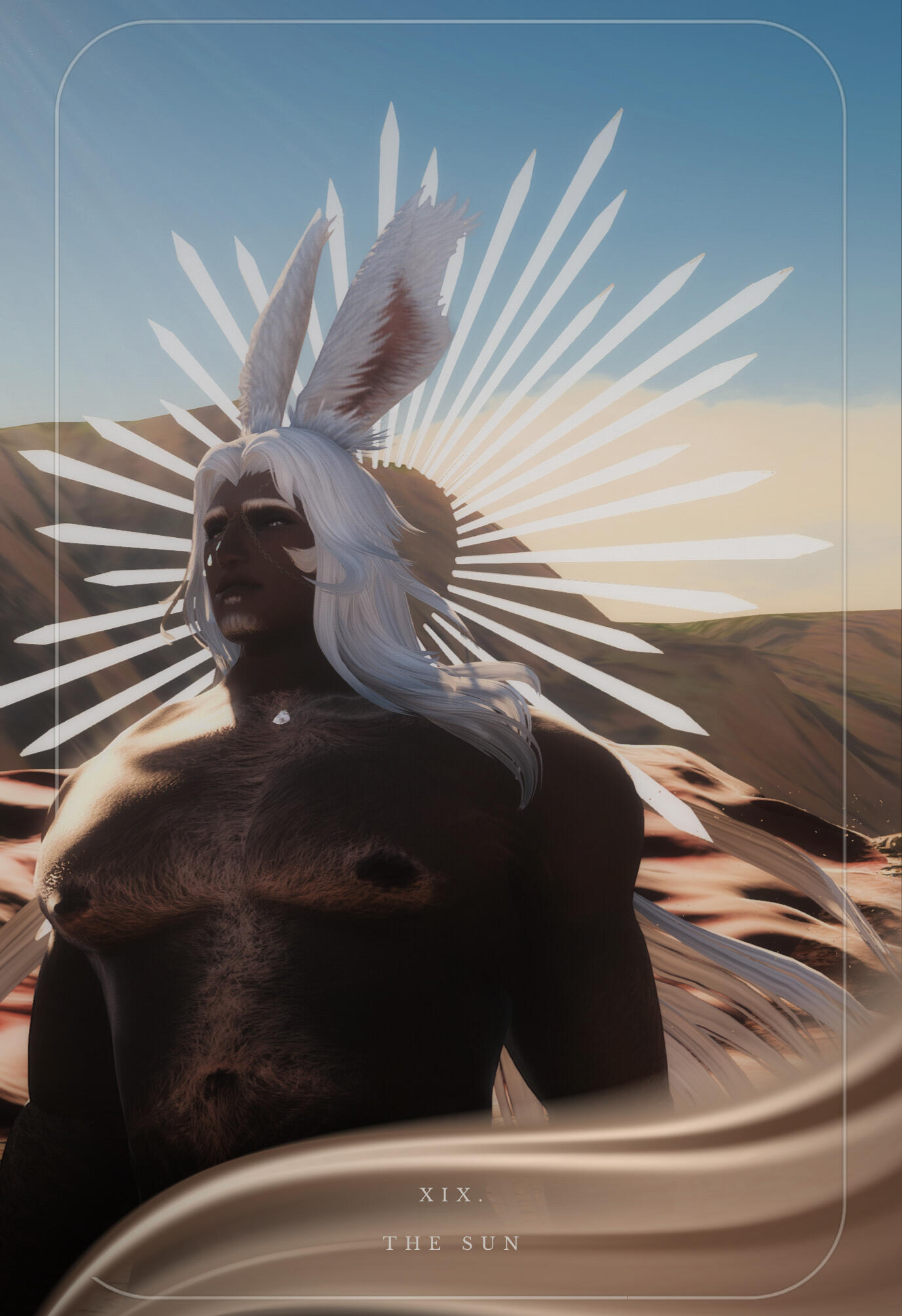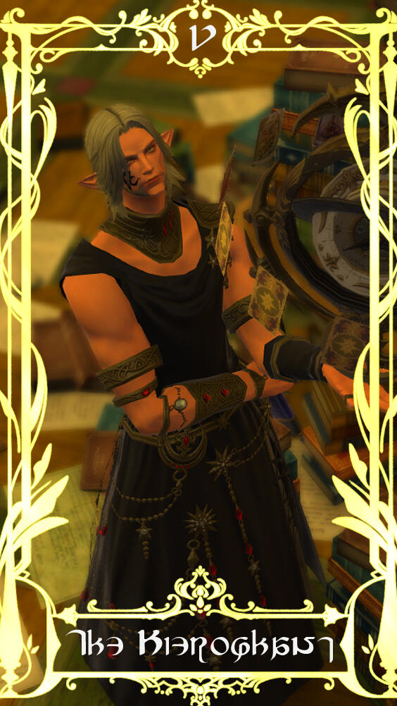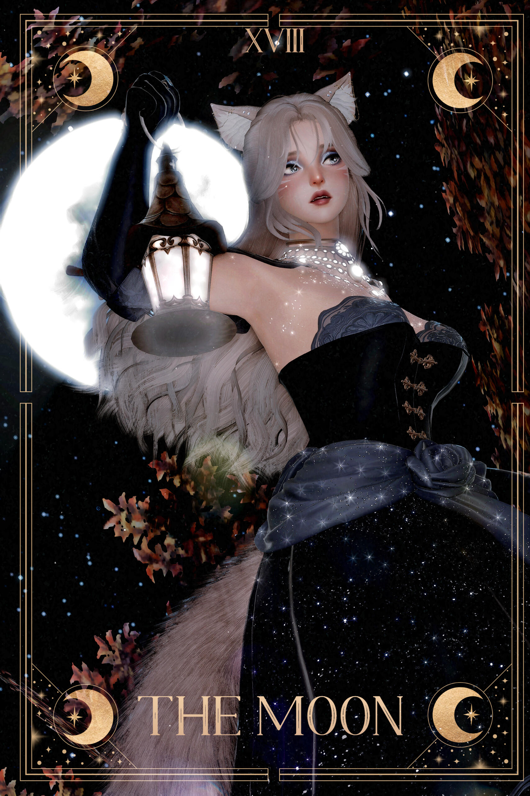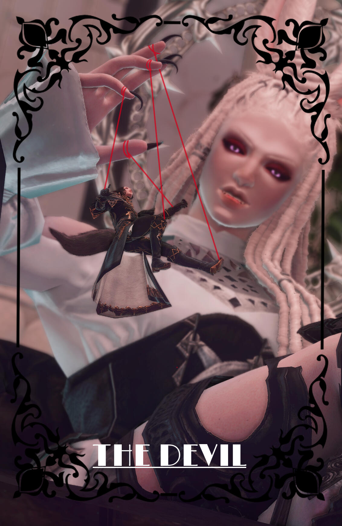 The choice for the card was due to its themes of love and success- as of 6.5- Sappho is happy with a loving girlfriend in Zero and is recovering from Endwalker and all that came before. Her path is looking up, and even reversed has good fortune, and the card also represents femininity, and Sappho is Hyper-Feminine so that matched well.As for the card itself, the elpis blooms and planet behind her representing her triumph over all that was ENW and before. She holds her red mage weapon proudly, and with the focus attached to make a staff as reference to the posing of a lot of other Empress tarot cards. She also has the azem symbol behind her head- its supposed to mimic the holy halos in older christian art while also being related to fourteen and her as a shard of Azem. But the underlying reason to all of this was I just thought it looked really cool.