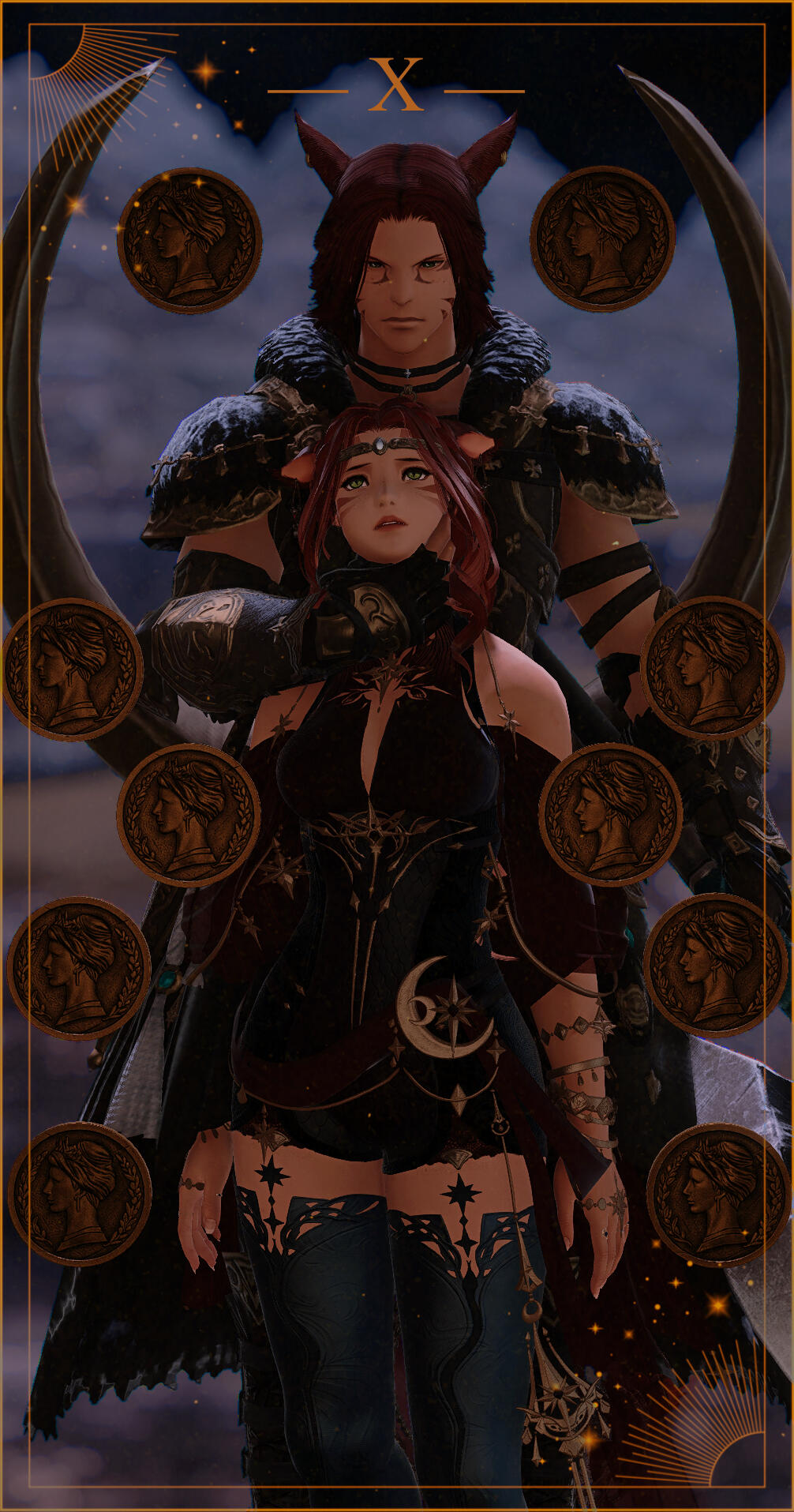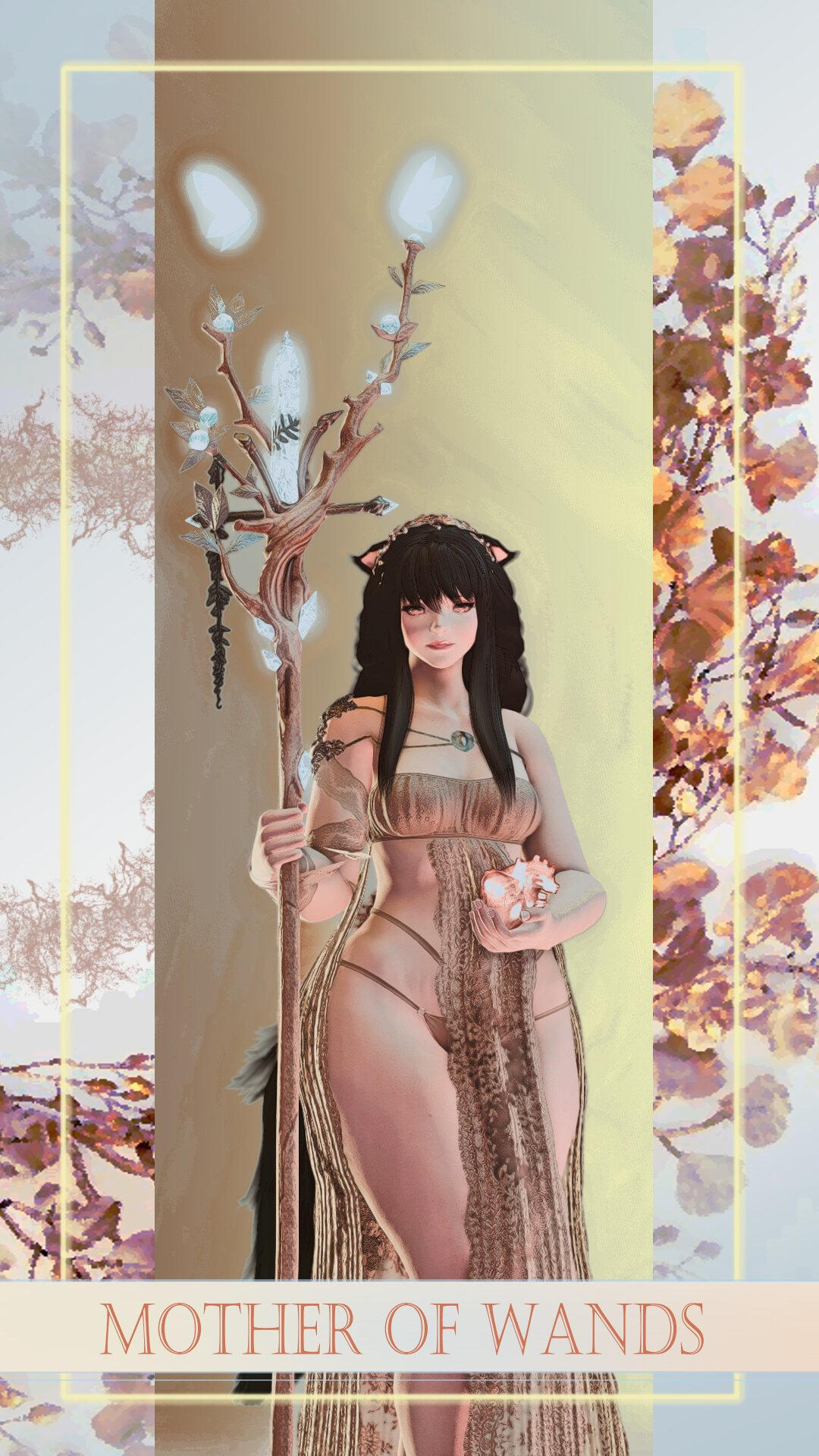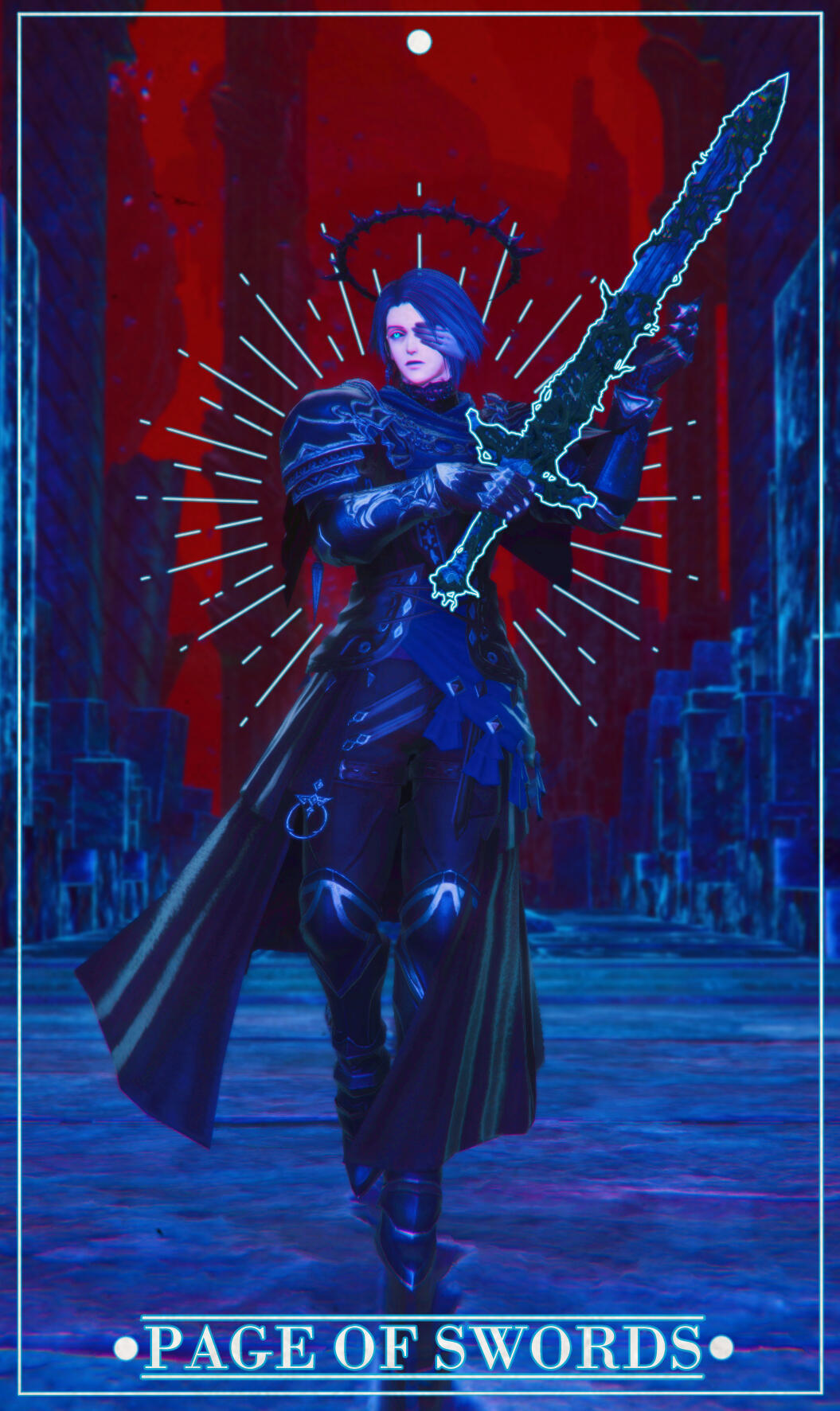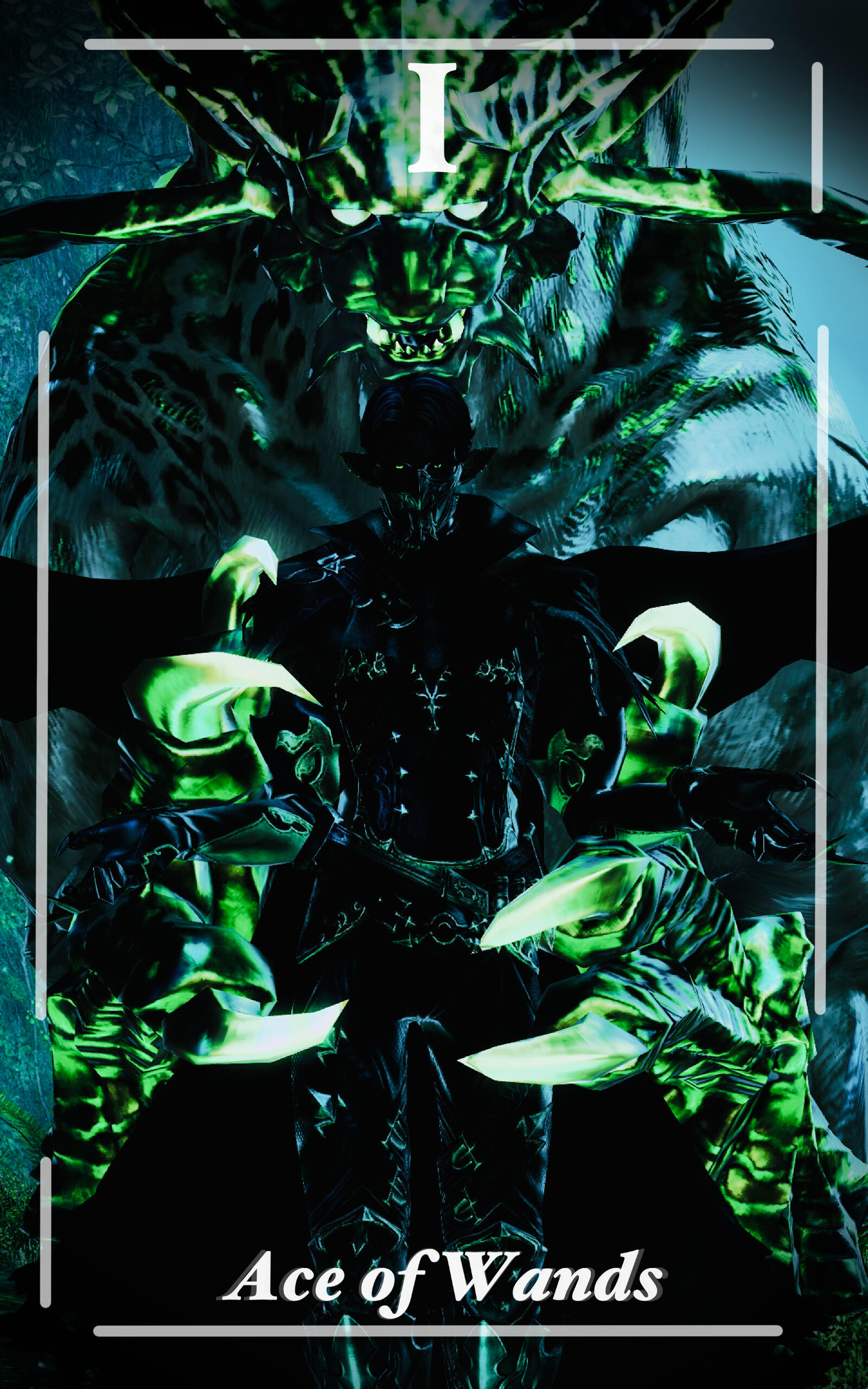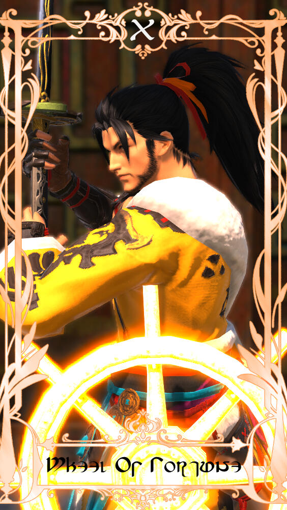The choice for the card was due to its themes of love and success- as of 6.5- Sappho is happy with a loving girlfriend in Zero and is recovering from Endwalker and all that came before. Her path is looking up, and even reversed has good fortune, and the card also represents femininity, and Sappho is Hyper-Feminine so that matched well.As for the card itself, the elpis blooms and planet behind her representing her triumph over all that was ENW and before. She holds her red mage weapon proudly, and with the focus attached to make a staff as reference to the posing of a lot of other Empress tarot cards. She also has the azem symbol behind her head- its supposed to mimic the holy halos in older christian art while also being related to fourteen and her as a shard of Azem. But the underlying reason to all of this was I just thought it looked really cool.