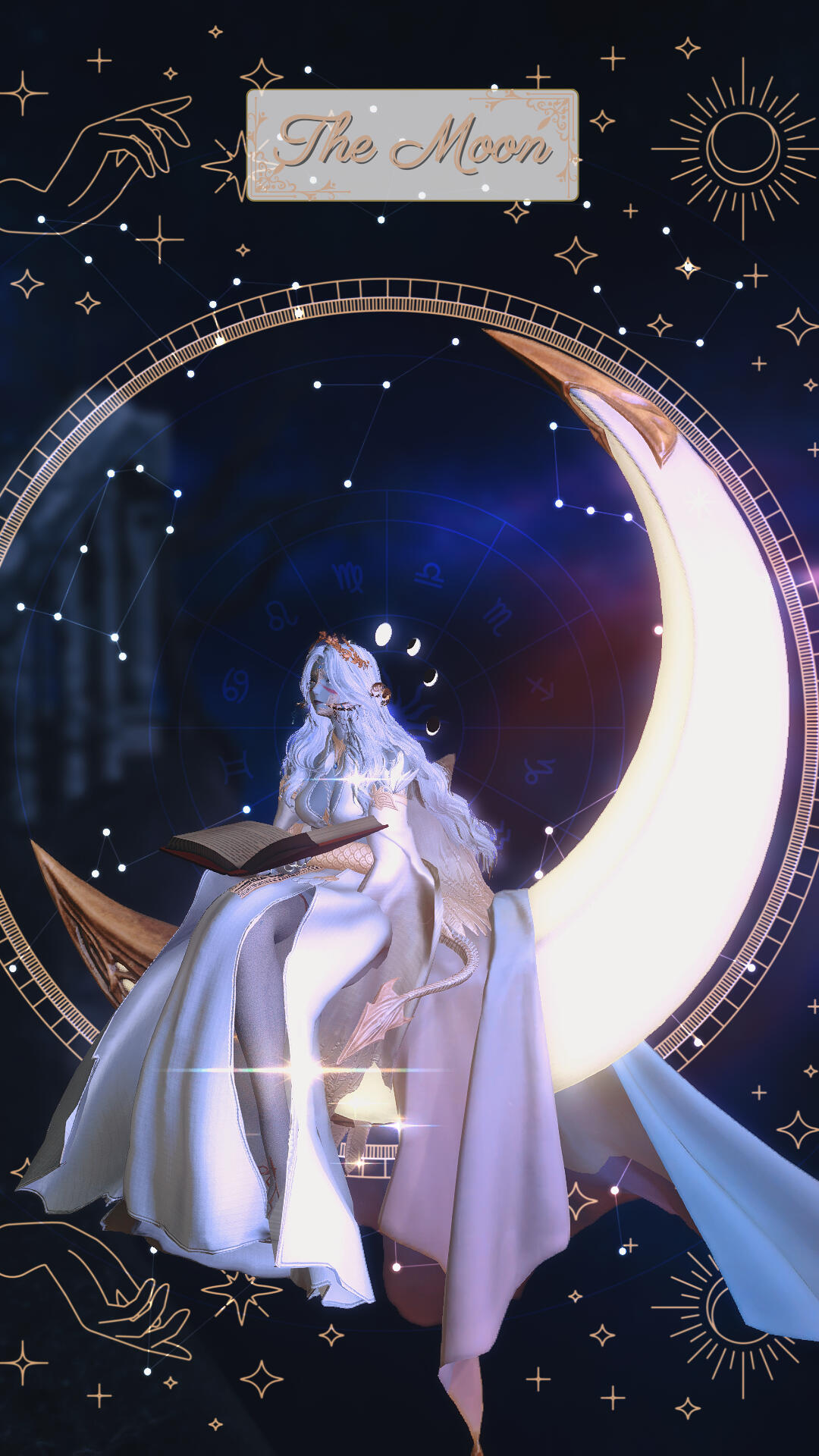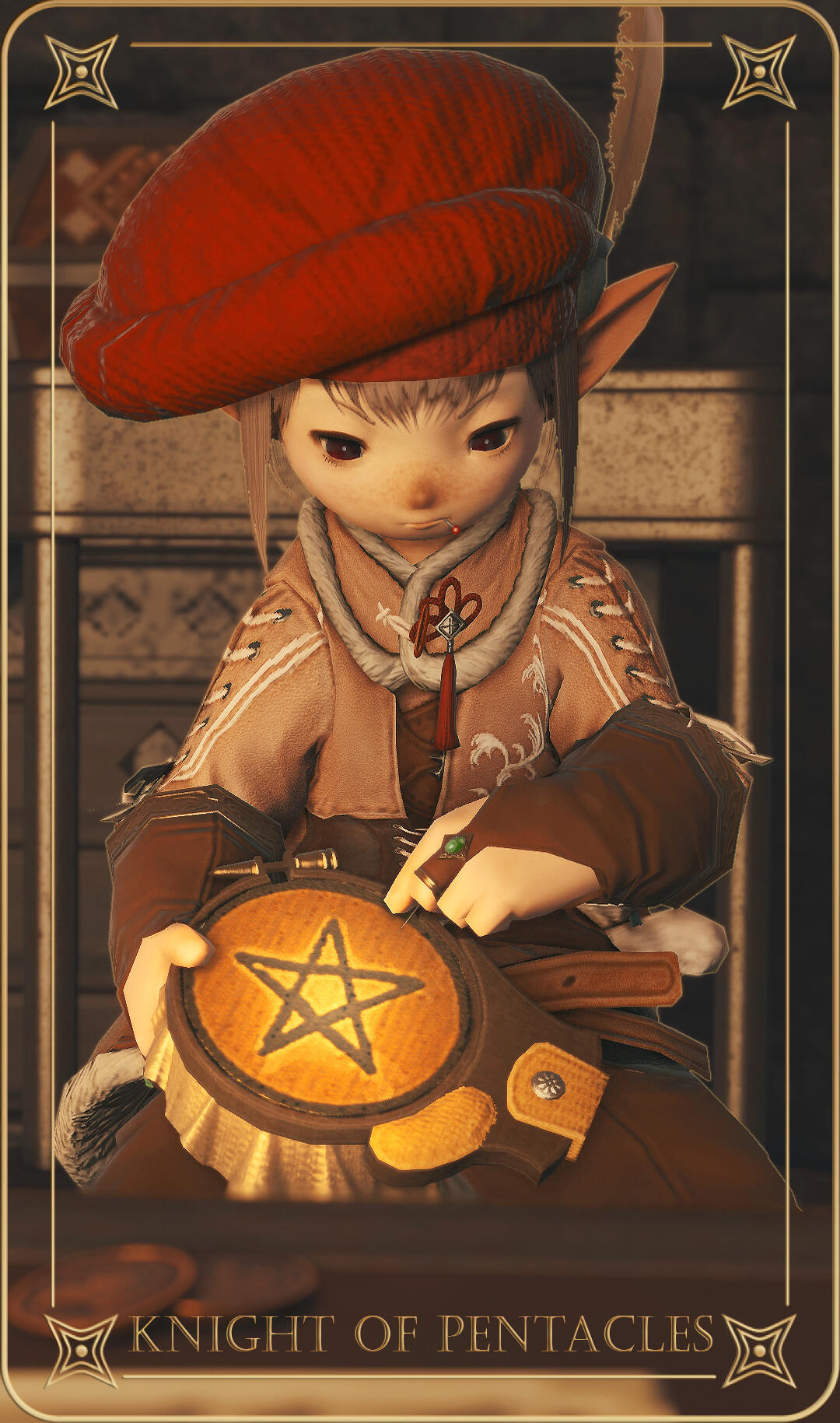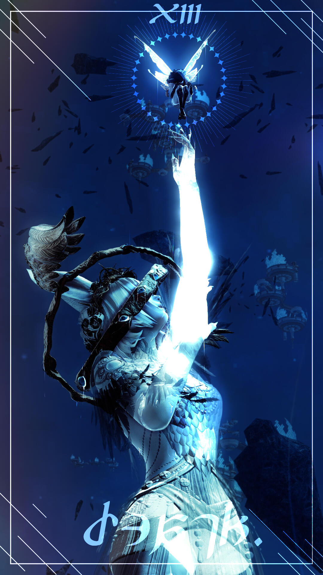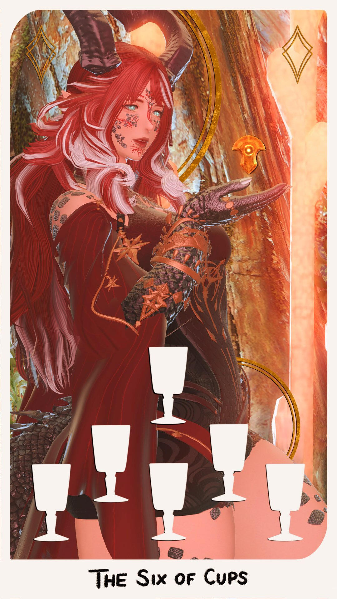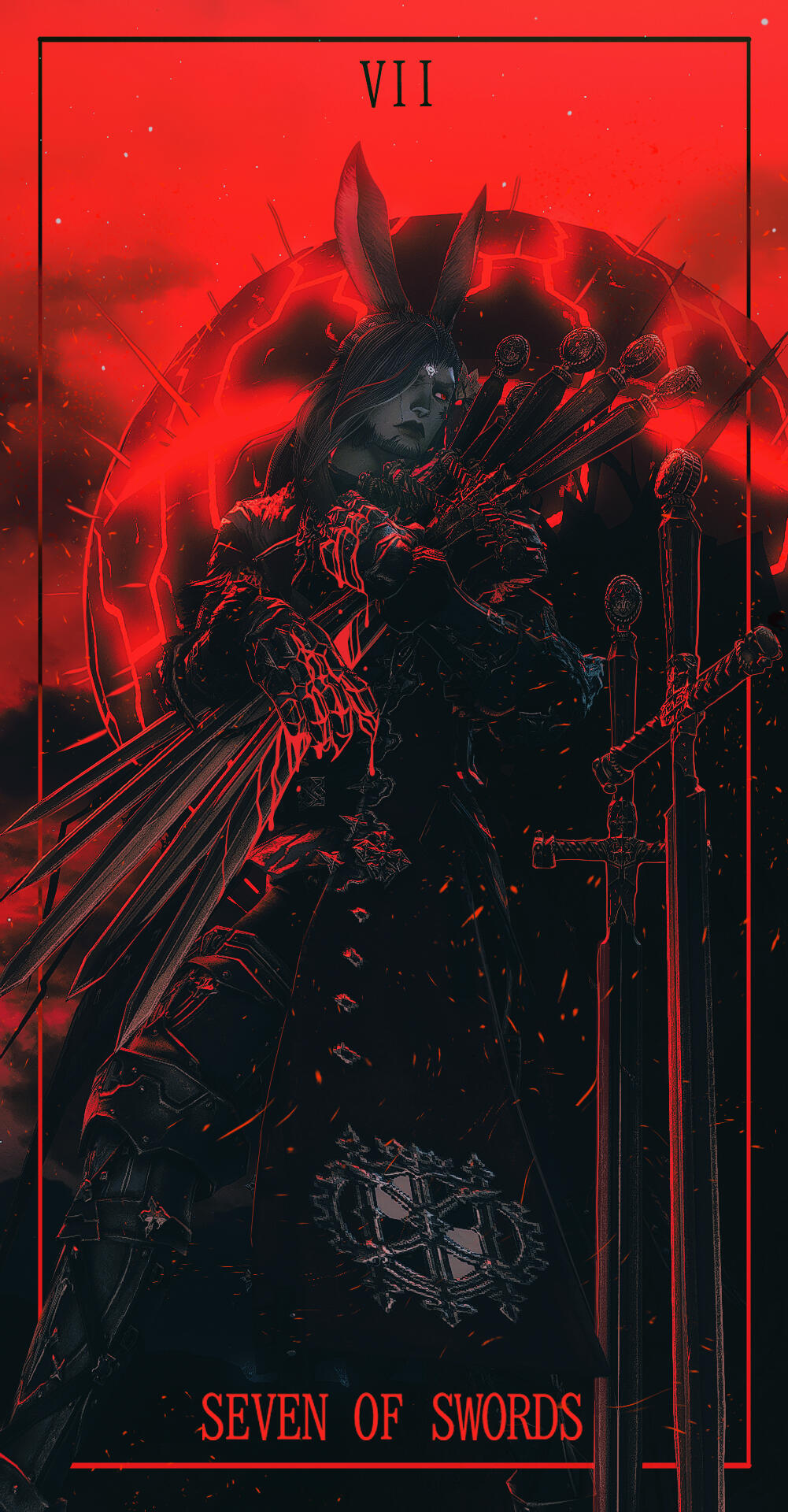 The choice for the card was due to its themes of love and success- as of 6.5- Sappho is happy with a loving girlfriend in Zero and is recovering from Endwalker and all that came before. Her path is looking up, and even reversed has good fortune, and the card also represents femininity, and Sappho is Hyper-Feminine so that matched well.As for the card itself, the elpis blooms and planet behind her representing her triumph over all that was ENW and before. She holds her red mage weapon proudly, and with the focus attached to make a staff as reference to the posing of a lot of other Empress tarot cards. She also has the azem symbol behind her head- its supposed to mimic the holy halos in older christian art while also being related to fourteen and her as a shard of Azem. But the underlying reason to all of this was I just thought it looked really cool.