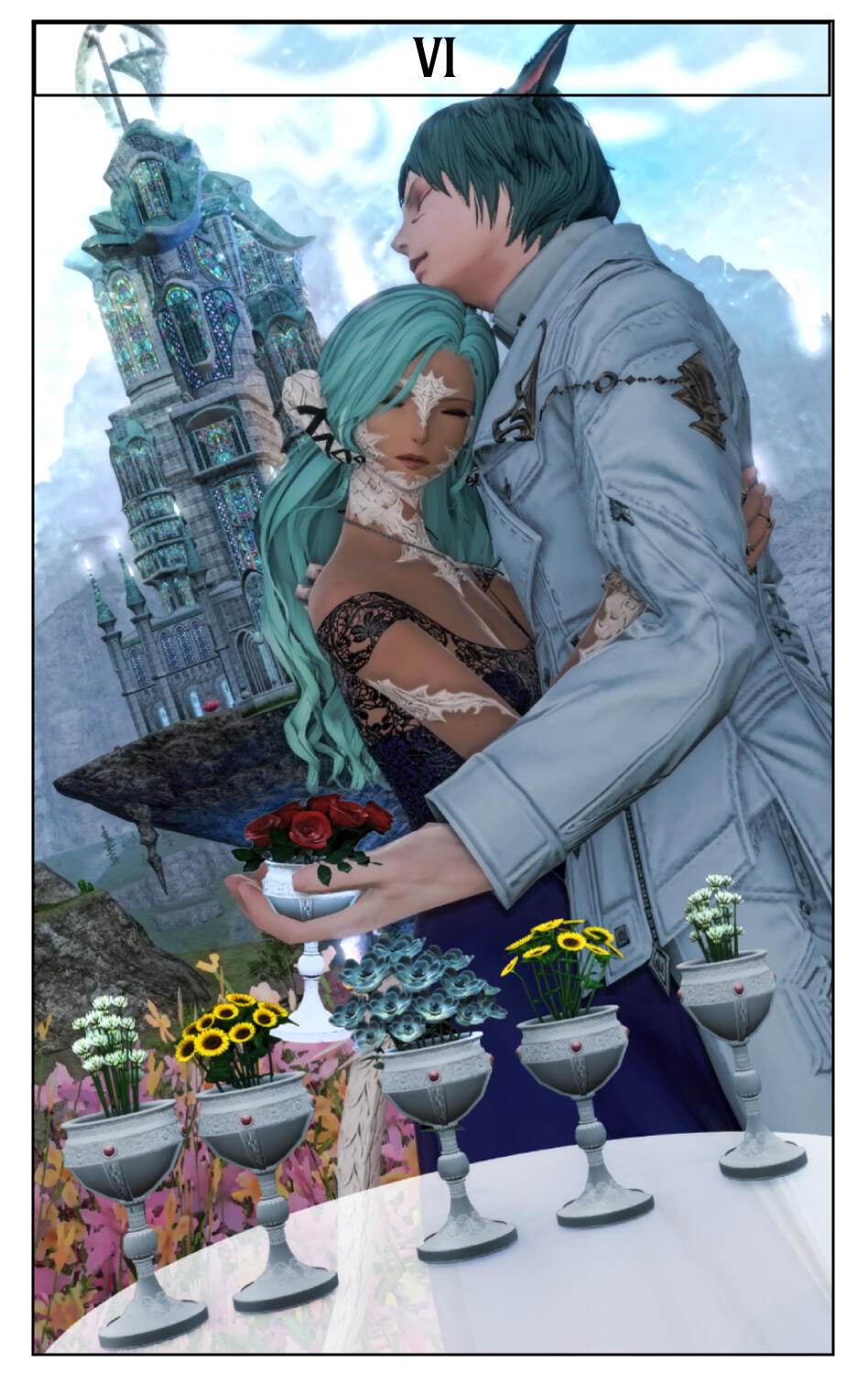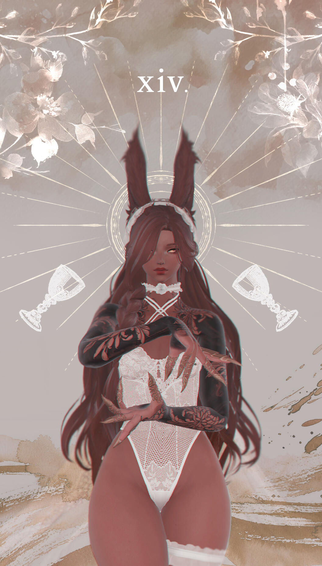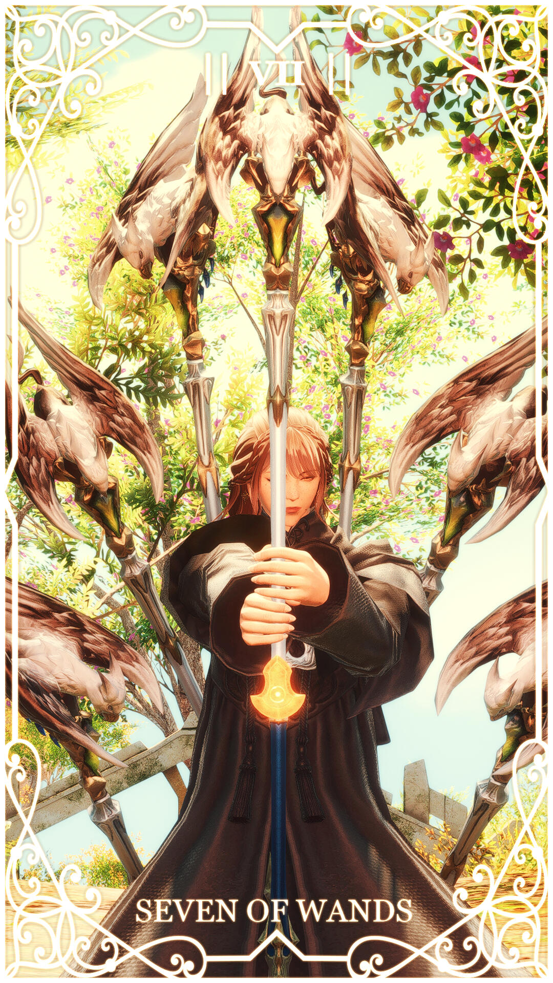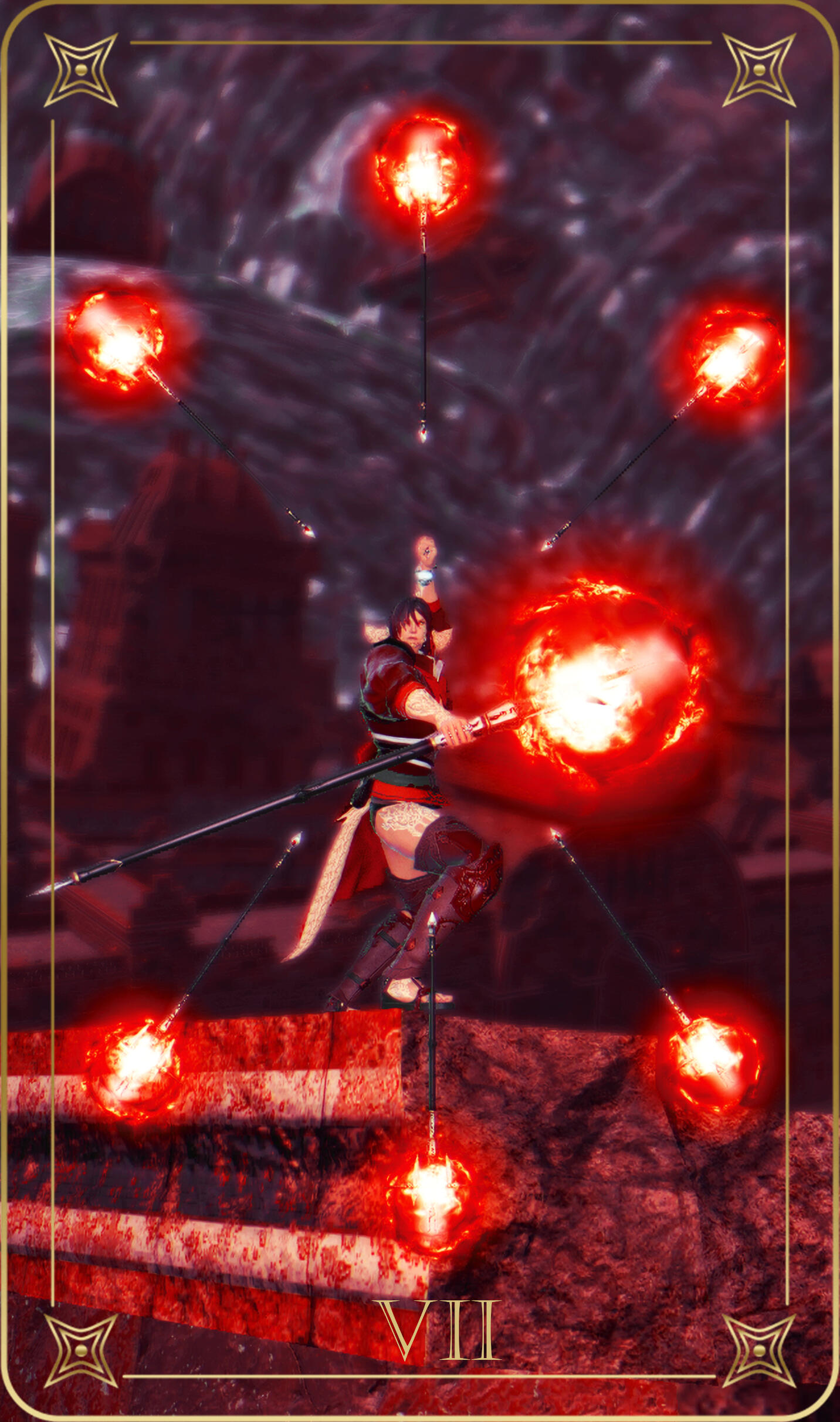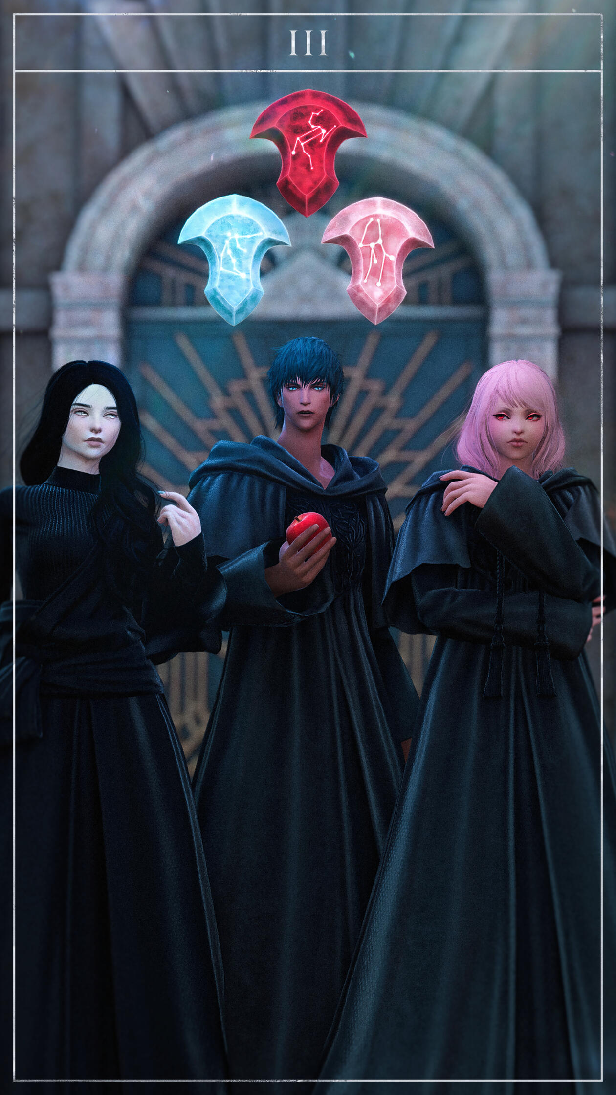The choice for the card was due to its themes of love and success- as of 6.5- Sappho is happy with a loving girlfriend in Zero and is recovering from Endwalker and all that came before. Her path is looking up, and even reversed has good fortune, and the card also represents femininity, and Sappho is Hyper-Feminine so that matched well.As for the card itself, the elpis blooms and planet behind her representing her triumph over all that was ENW and before. She holds her red mage weapon proudly, and with the focus attached to make a staff as reference to the posing of a lot of other Empress tarot cards. She also has the azem symbol behind her head- its supposed to mimic the holy halos in older christian art while also being related to fourteen and her as a shard of Azem. But the underlying reason to all of this was I just thought it looked really cool.