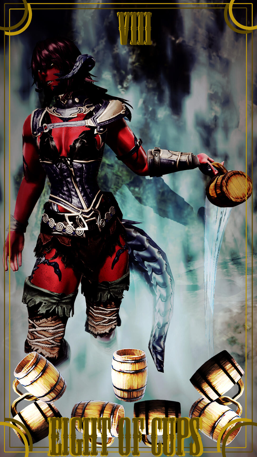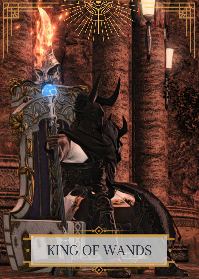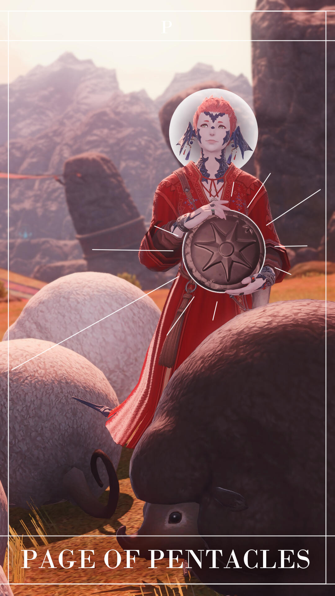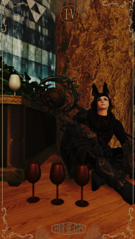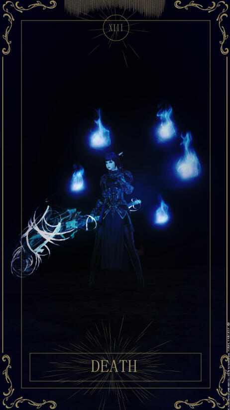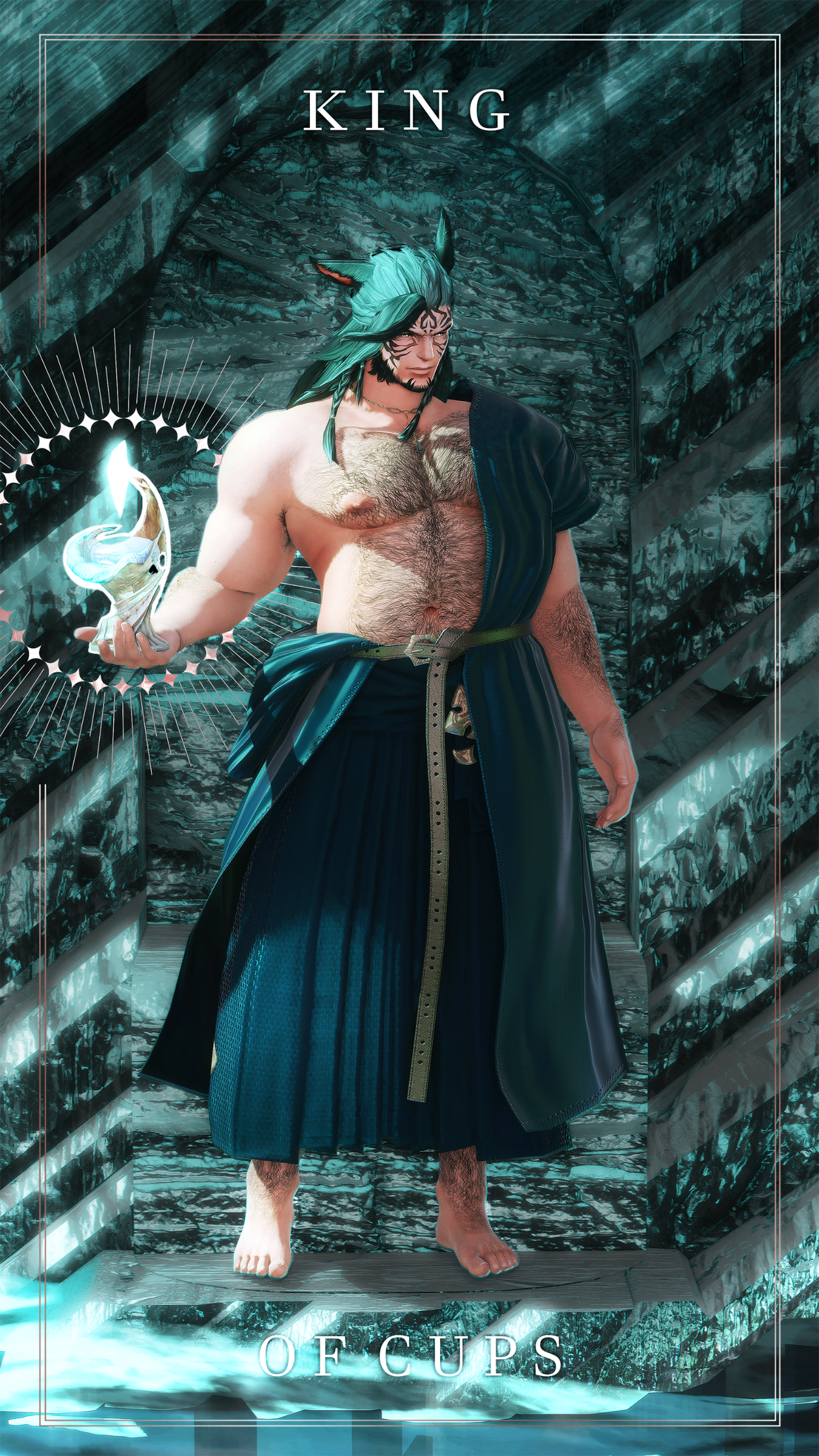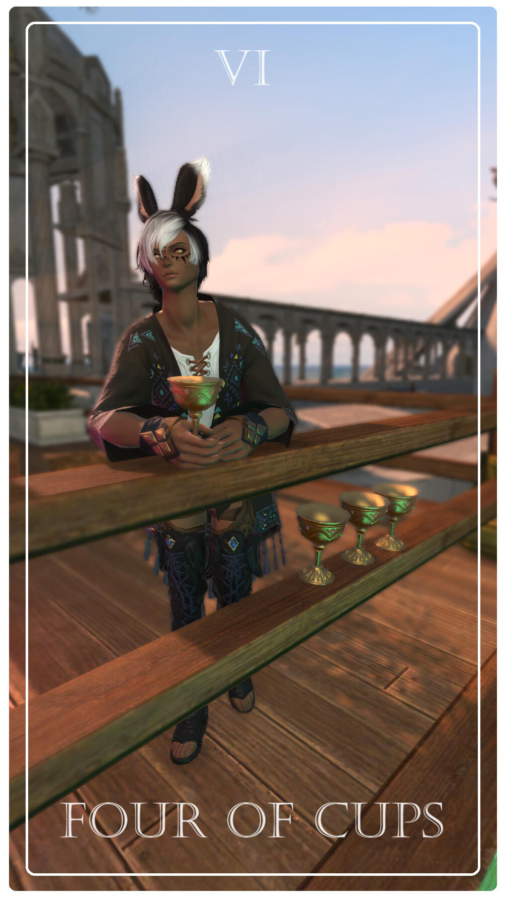 The choice for the card was due to its themes of love and success- as of 6.5- Sappho is happy with a loving girlfriend in Zero and is recovering from Endwalker and all that came before. Her path is looking up, and even reversed has good fortune, and the card also represents femininity, and Sappho is Hyper-Feminine so that matched well.As for the card itself, the elpis blooms and planet behind her representing her triumph over all that was ENW and before. She holds her red mage weapon proudly, and with the focus attached to make a staff as reference to the posing of a lot of other Empress tarot cards. She also has the azem symbol behind her head- its supposed to mimic the holy halos in older christian art while also being related to fourteen and her as a shard of Azem. But the underlying reason to all of this was I just thought it looked really cool.