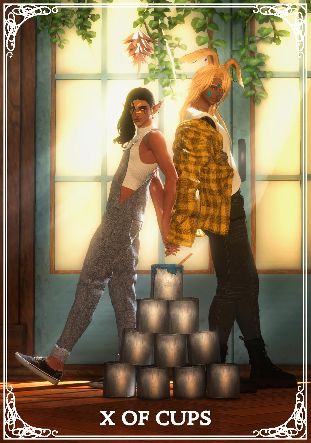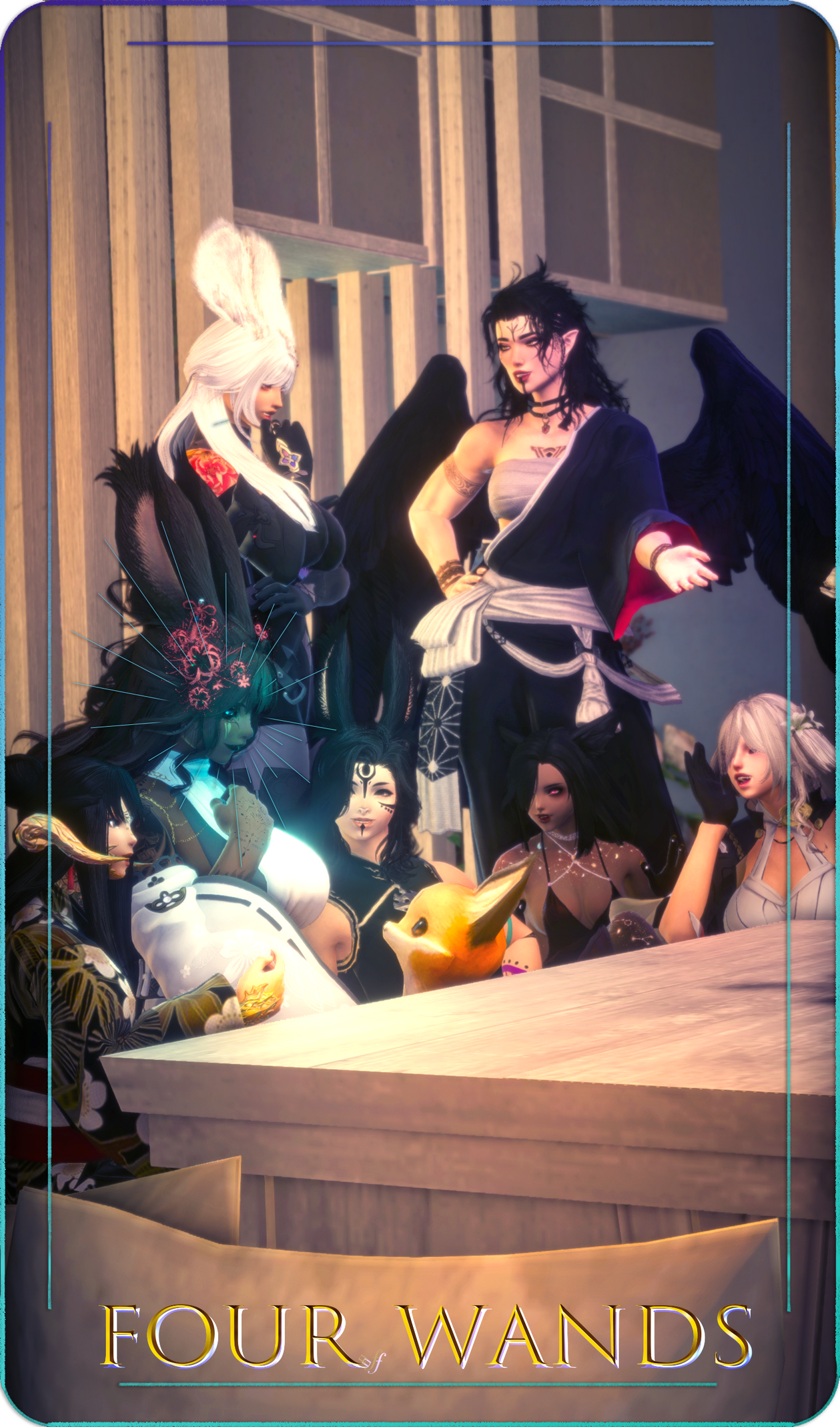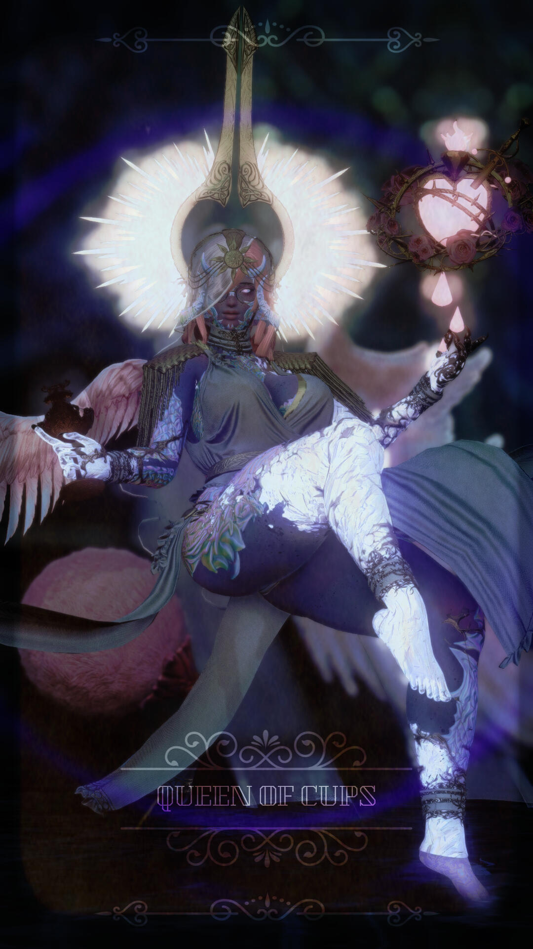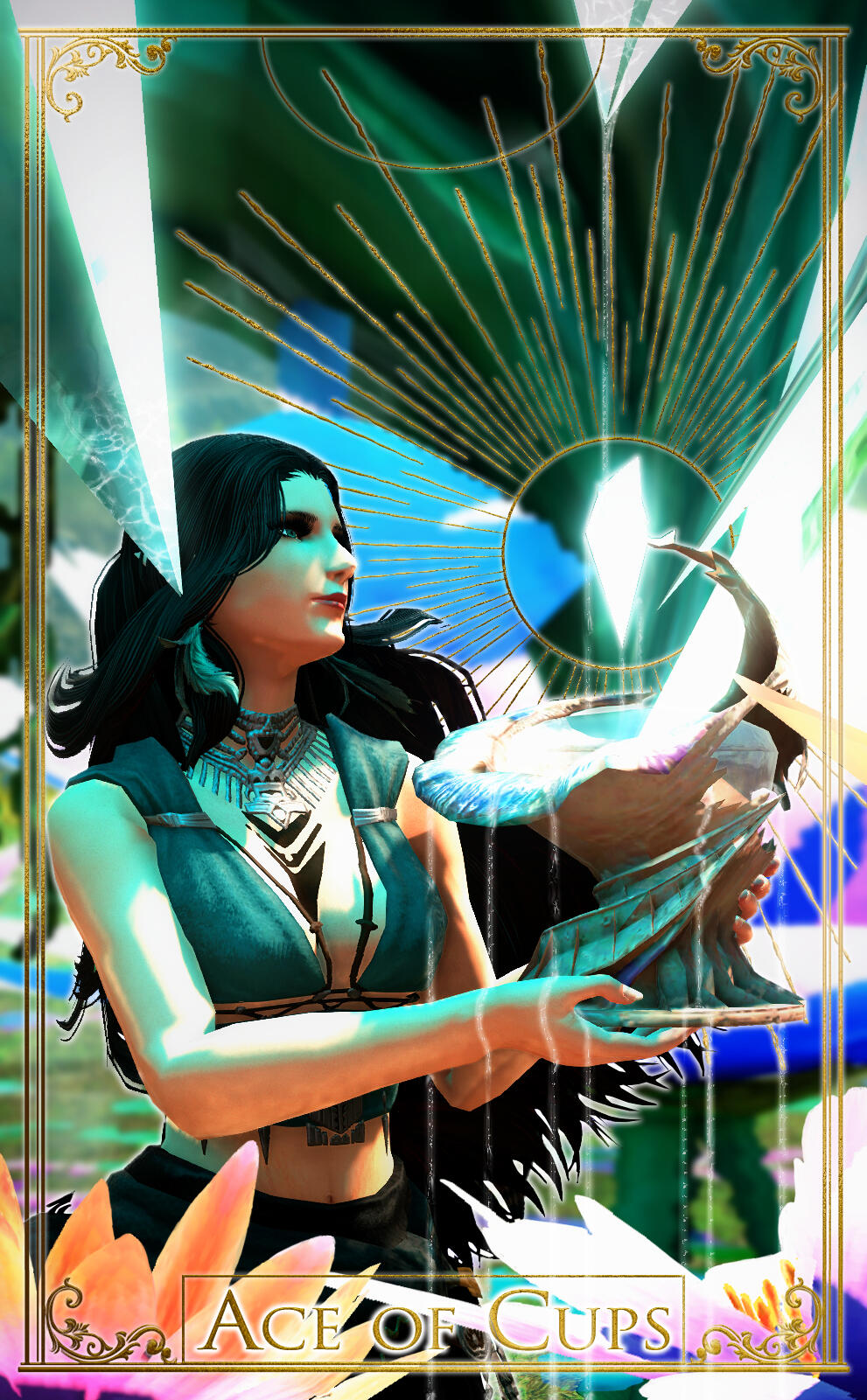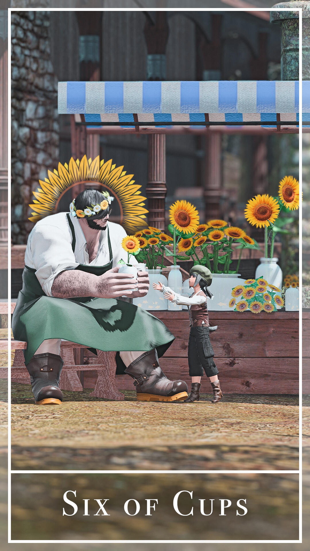 The choice for the card was due to its themes of love and success- as of 6.5- Sappho is happy with a loving girlfriend in Zero and is recovering from Endwalker and all that came before. Her path is looking up, and even reversed has good fortune, and the card also represents femininity, and Sappho is Hyper-Feminine so that matched well.As for the card itself, the elpis blooms and planet behind her representing her triumph over all that was ENW and before. She holds her red mage weapon proudly, and with the focus attached to make a staff as reference to the posing of a lot of other Empress tarot cards. She also has the azem symbol behind her head- its supposed to mimic the holy halos in older christian art while also being related to fourteen and her as a shard of Azem. But the underlying reason to all of this was I just thought it looked really cool.
