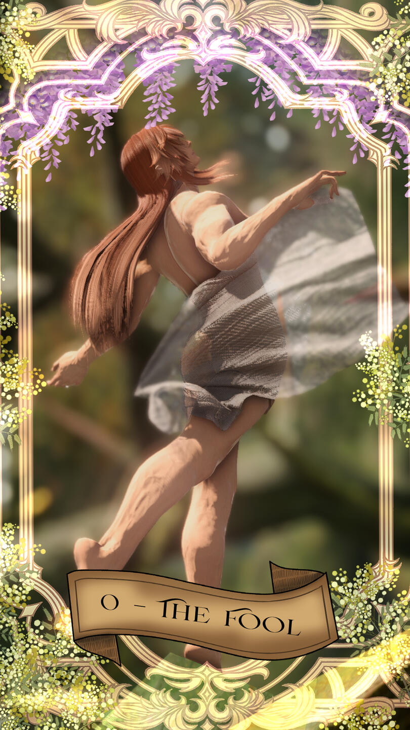 My character, Ephraim, is very much symbolized by the fool. Specifically, he's got that almost reckless sense of wonder and curiosity about the world, despite its hardships, he's blind to seeing the harsh reality of it all. The Fool is typically represented as a sort of jester-esque figure walking with nothing but a satchel about to fall off a cliff, but in my interpretation (inspired by a beautiful tarot card design on dA) The Fool is nude, covered by a sheer drape, walking among nature. The nudity (which, in my gpose, he's wearing safety shorts) is a metaphor for baring one's heart in the open and for being unguarded from the harshness of the world. Above him are plants, and dappled sunlight shines on his bare skin, yet he remains unaware that the branches he walks on are brambles and thorns. One small misstep means pain is sure to be present. On a personal level, I love that the Fool both represents the start and the end of a journey, if you see it from both sides.