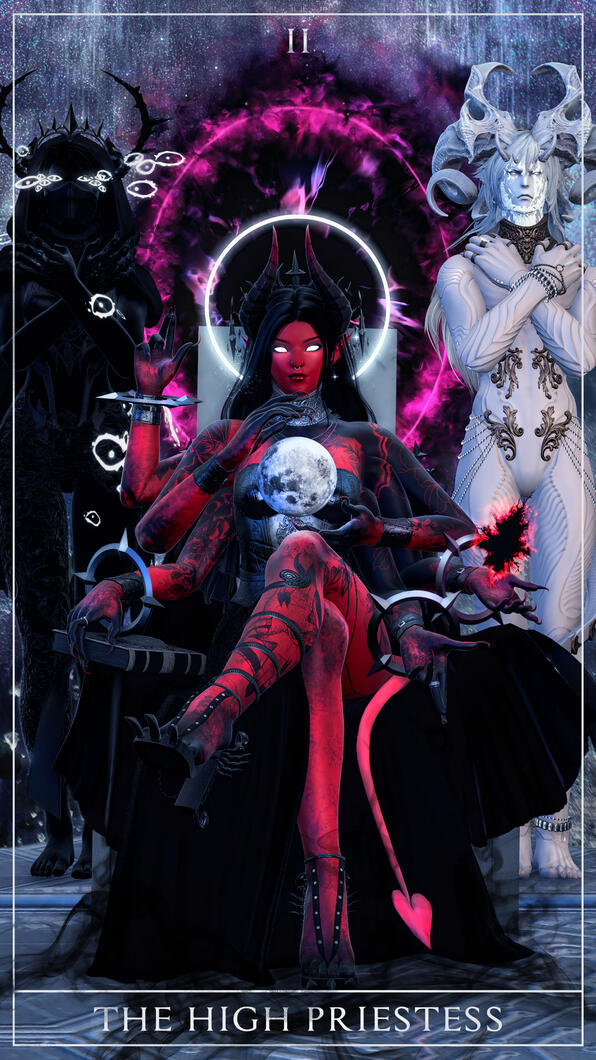 The High Priestess traditionally sits between two pillars: one black and one white. The two pillars symbolize duality— masculine and feminine, darkness and light. Between them is a veiled space, separating the conscious and subconscious realms, the seen and unseen. The High Priestess is the keeper of these dualities, and the path between.In this depiction, Zlayer serves as the High Priestess in her unfettered, unbound form. The top-rung voidsent situates herself on a throne between an Avatar and a Sineater, polarities of dark and light given flesh. She is in tune with both modes, and occupies the space between with her knowing. Behind them, a void portal looms as a reminder of other worlds and her ability to traverse between shards. Her power is implicit— in the dark mist seething from her robe, in the ability to suspend a moon in her hands, in the conjured aetherial tear, in the safeguarded tome— one need not ask for an explicit demonstration of her power.