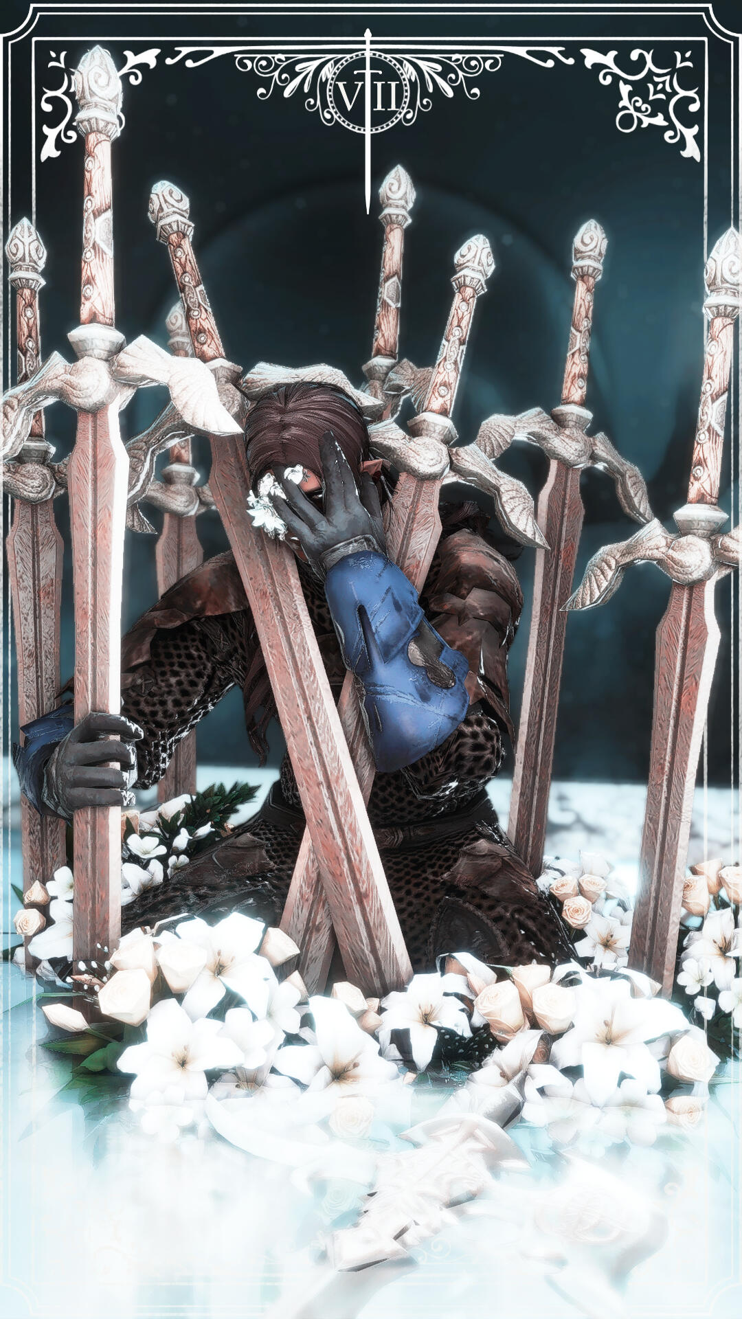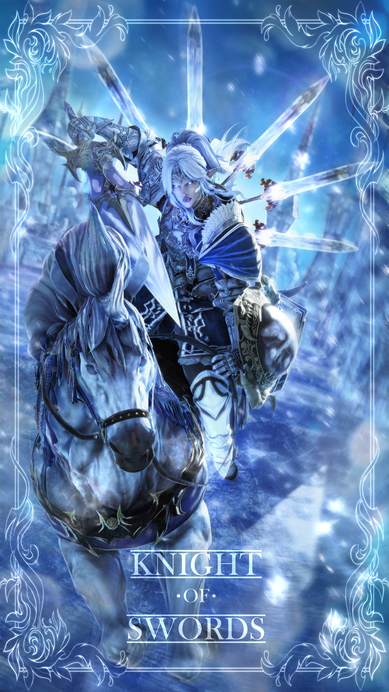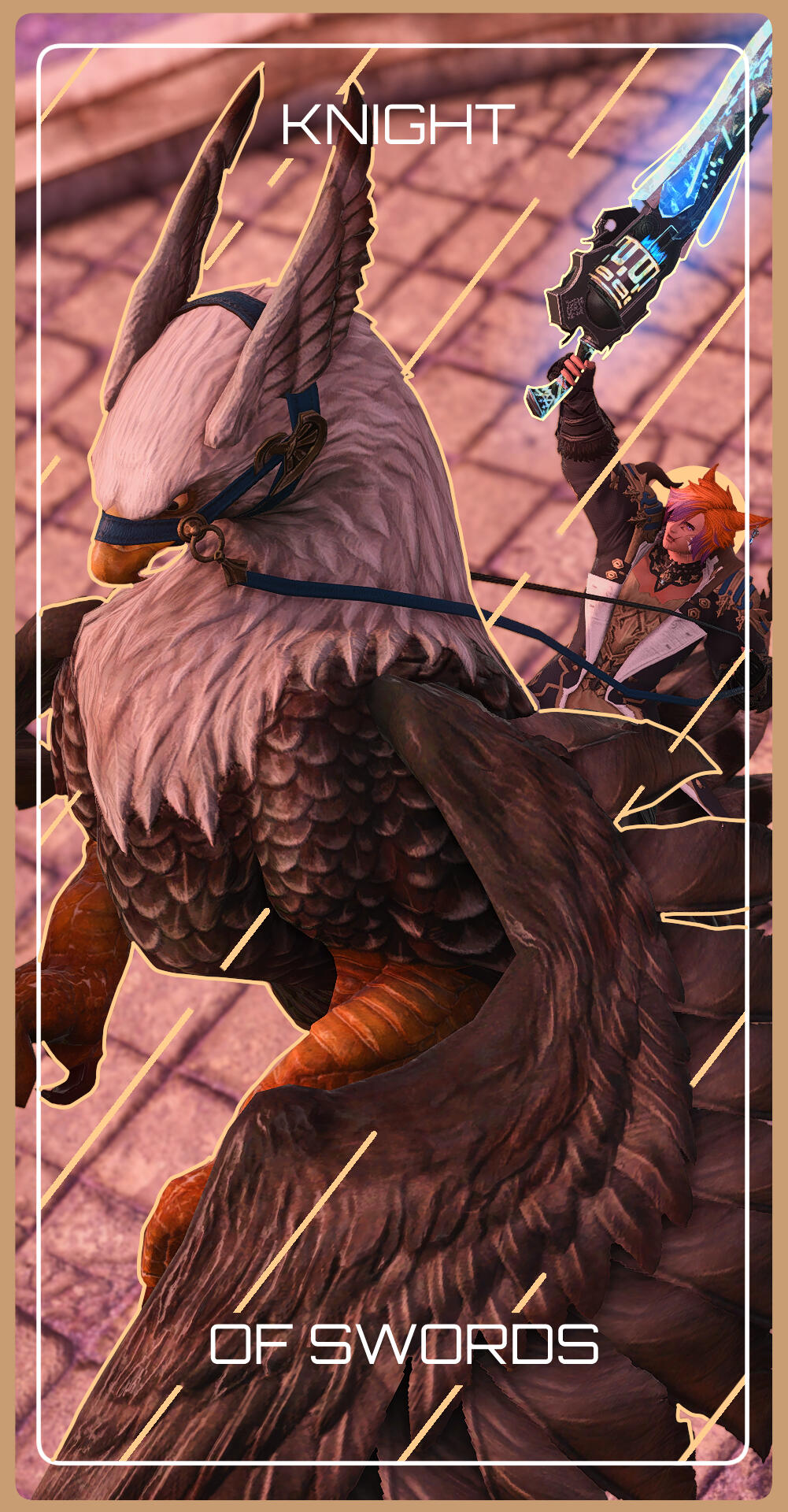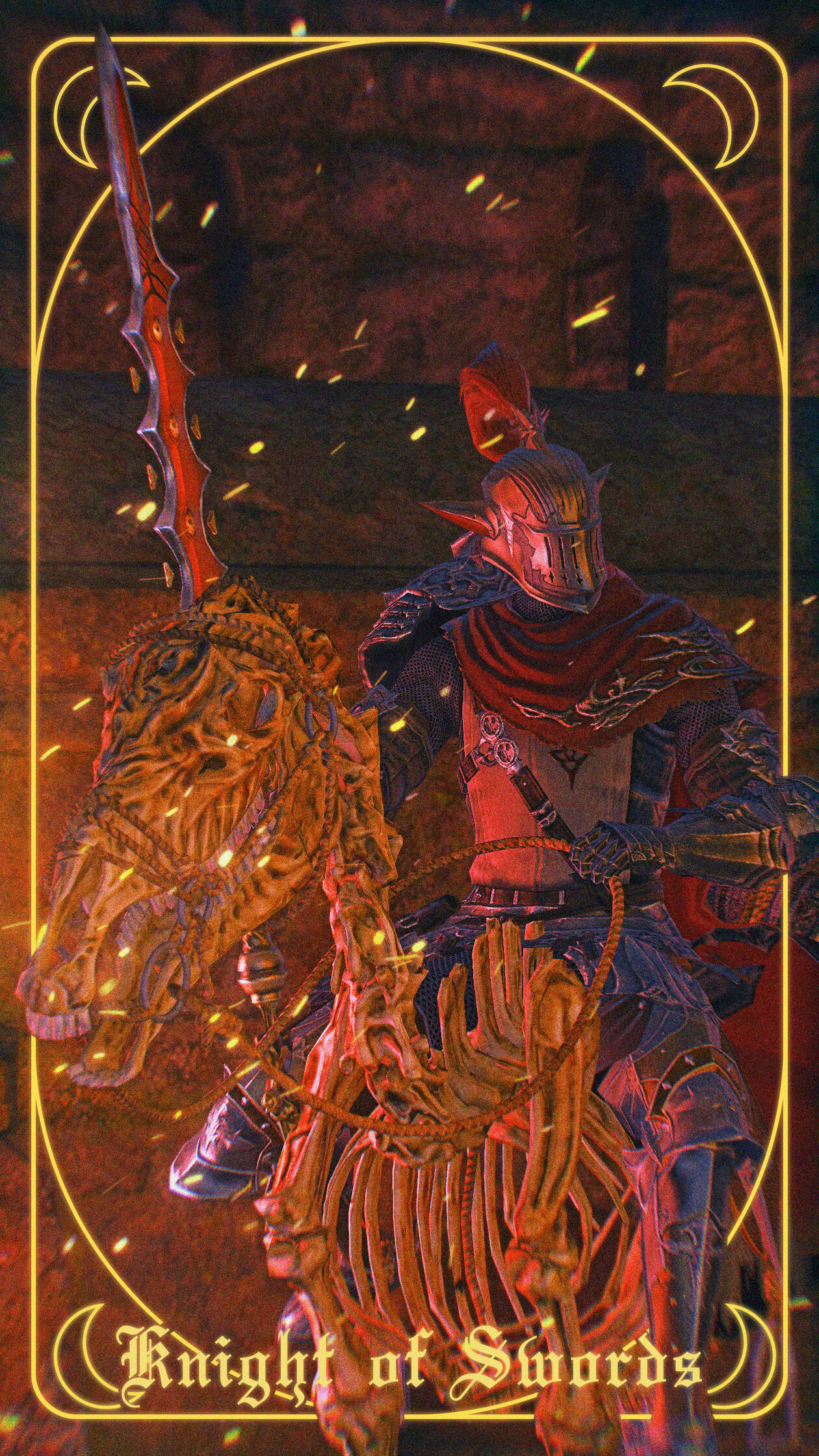 In all honesty, I drew the Kight of Swords from my own deck, and it made sense for my current lore for my OC.As for making the gpose, I kept to what I know and am familiar with, and the props used have been my favorites these past couple months.