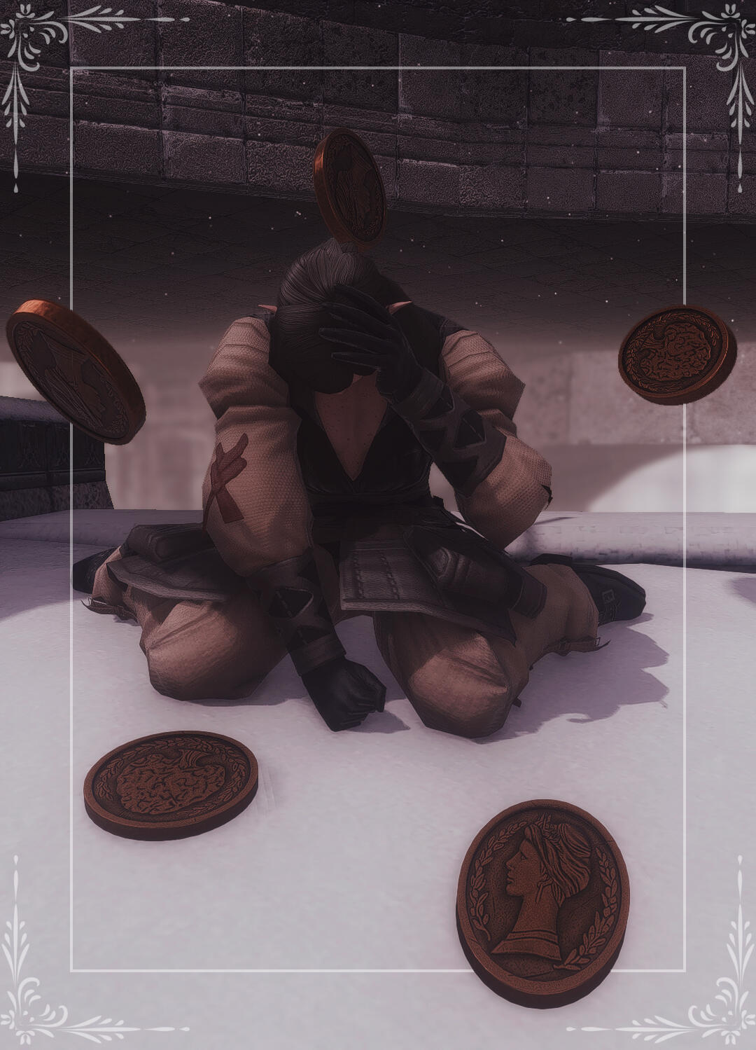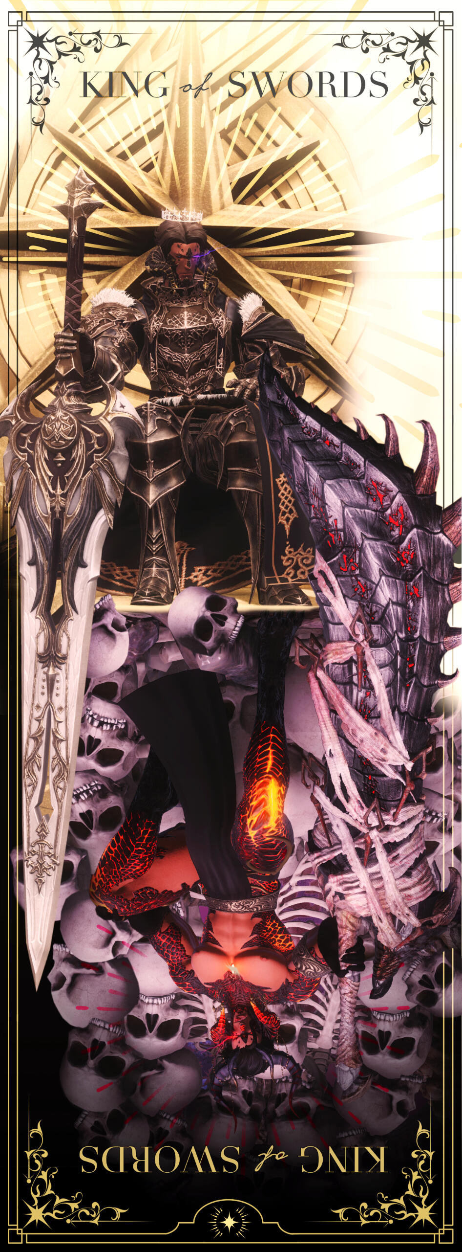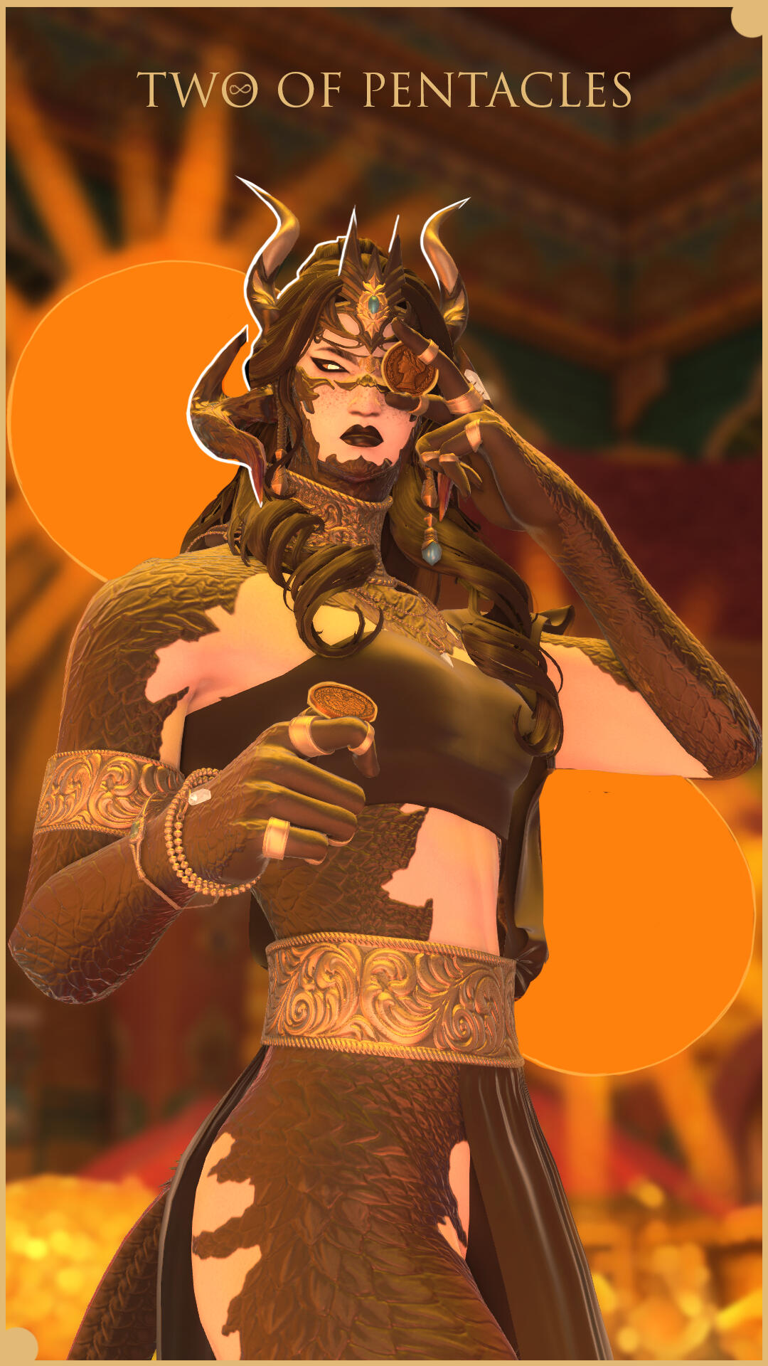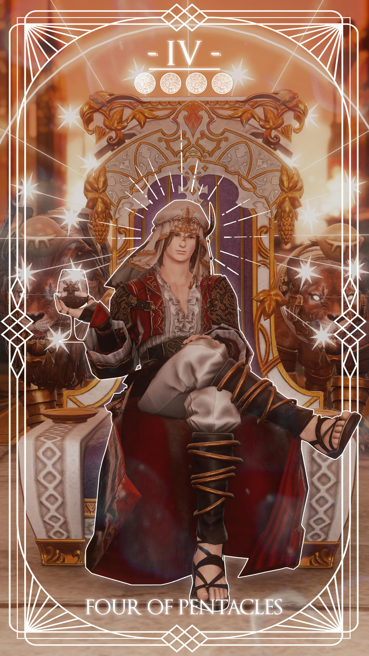 Four hands our fortunes mend, that want we may not knowThe original Four of Pentacles card features a king amidst a city backdrop holding onto a large coin. I wanted to recreate that using the final area in Aglaia where you fight Nald'thal, both as a visual parallel and as a nod to the lore of the Traders being seen as twin gods of mercantile affairs and death. Arcade (the character being featured) is dressed lavishly in finery befitting a ruler, as he sits on a throne of avarice holding a wine goblet. Behind him are two lions, signifying protection from any would-be thieves of his wealth. As Nald'thal is his patron, I wanted to utilize elements showing off a love for money and a warm desert theme.