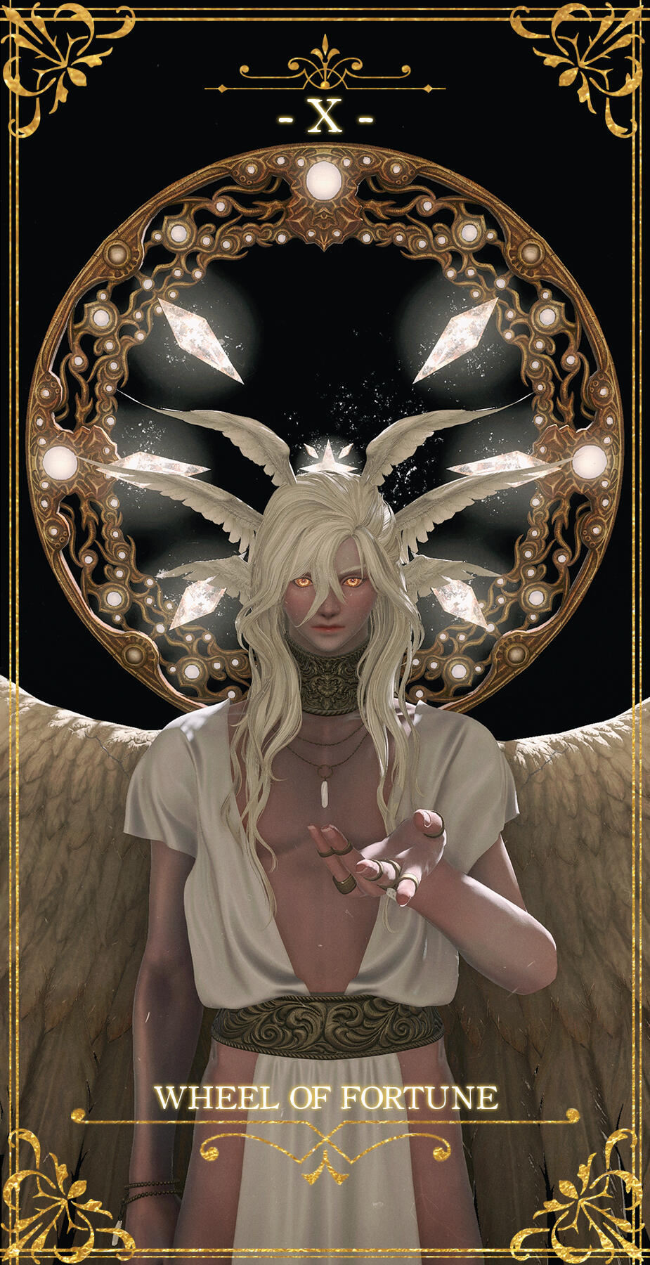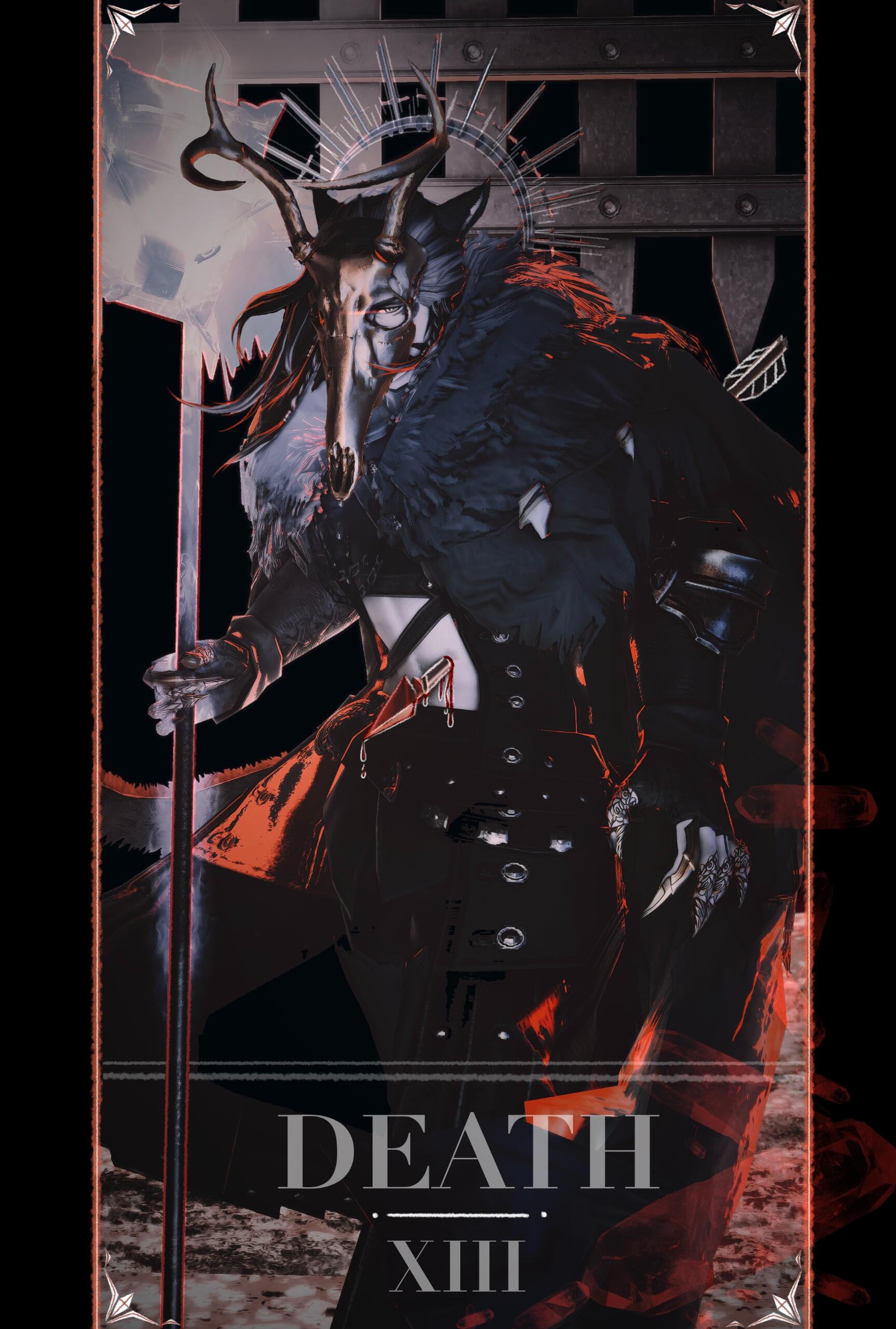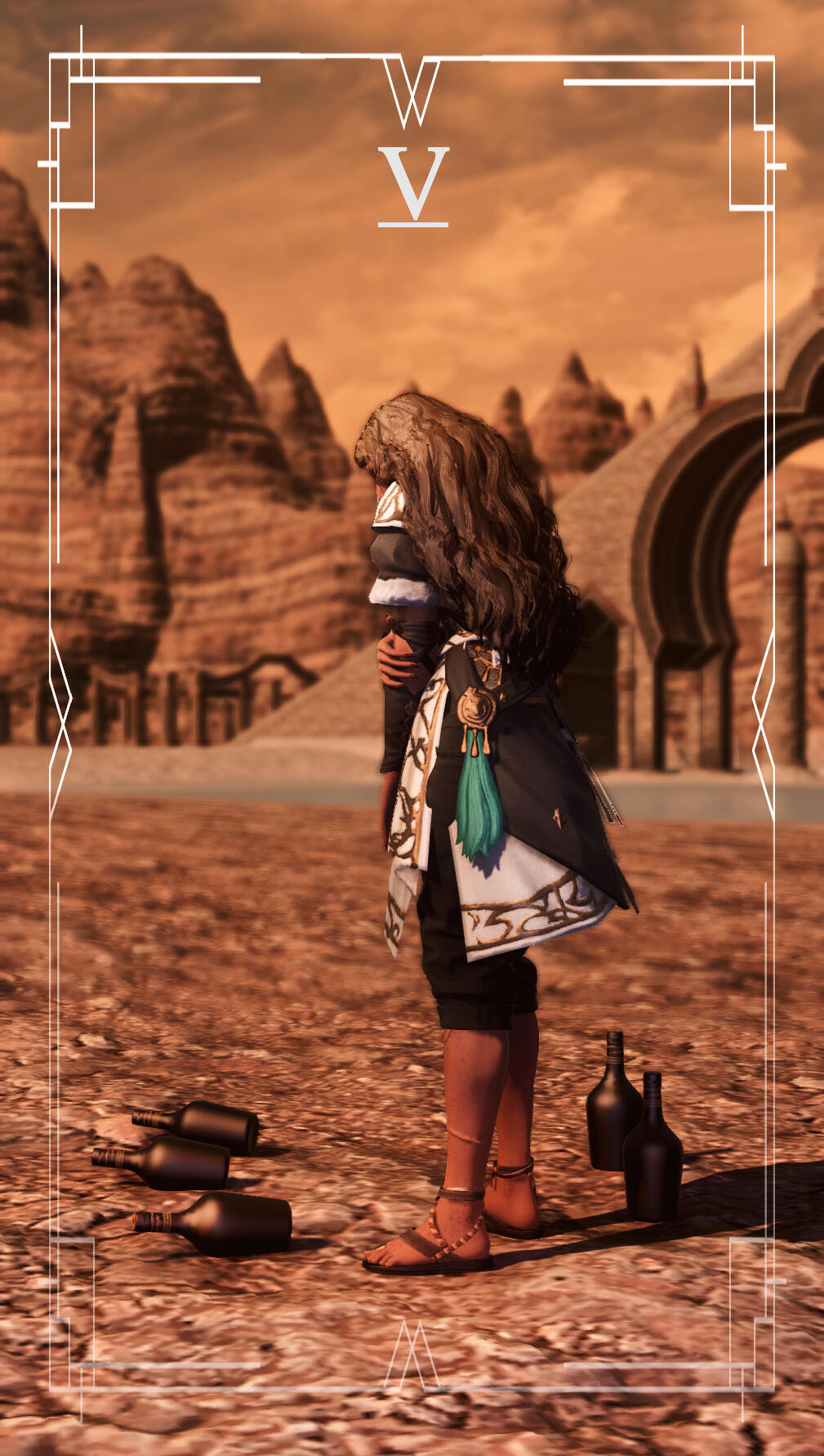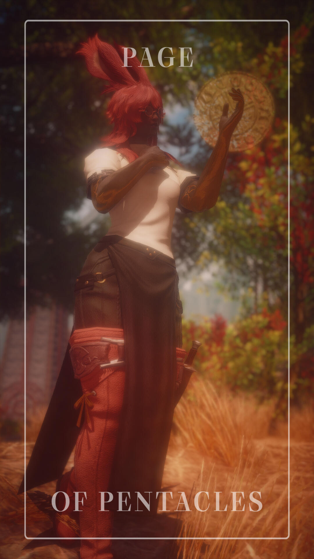 Four hands our fortunes mend, that want we may not knowThe original Four of Pentacles card features a king amidst a city backdrop holding onto a large coin. I wanted to recreate that using the final area in Aglaia where you fight Nald'thal, both as a visual parallel and as a nod to the lore of the Traders being seen as twin gods of mercantile affairs and death. Arcade (the character being featured) is dressed lavishly in finery befitting a ruler, as he sits on a throne of avarice holding a wine goblet. Behind him are two lions, signifying protection from any would-be thieves of his wealth. As Nald'thal is his patron, I wanted to utilize elements showing off a love for money and a warm desert theme.