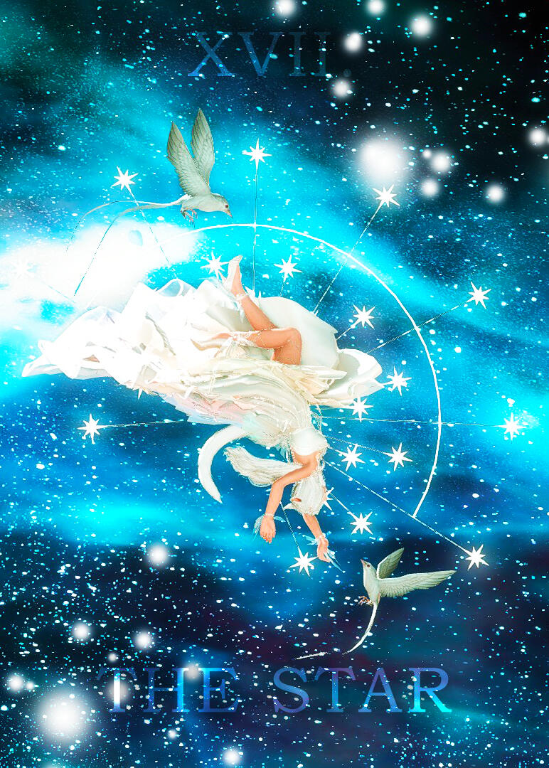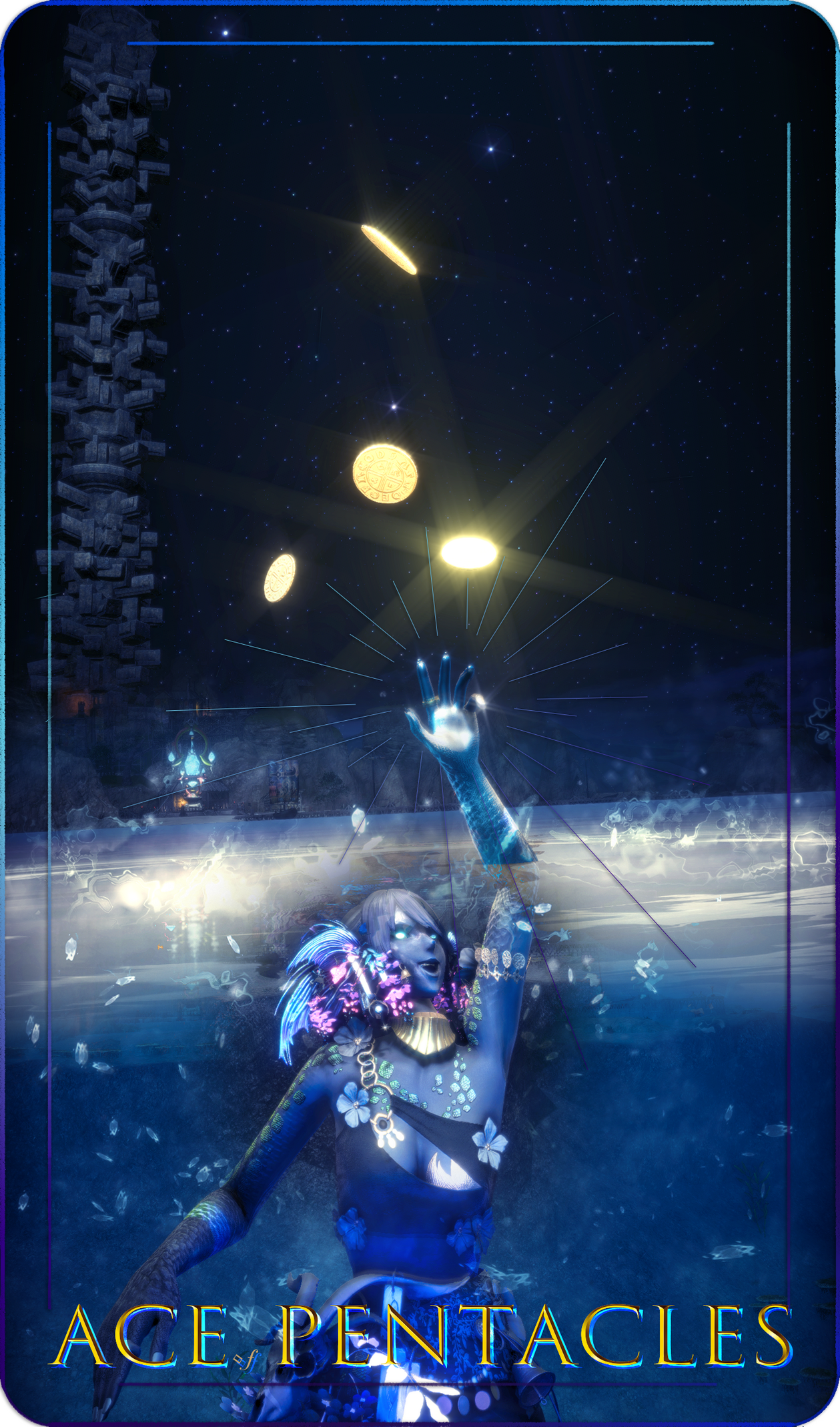 "The aces in the tarot are all indicative of new beginnings. It means that you are at a point in your life where a new cycle is beginning - you are about to start afresh. Because the suit of pentacles is primarily concerned with all things material (not just financial, but also with the sensual), this reset could manifest itself as the undertaking of a new venture. Wherever this beginning takes place, the Ace of Pentacles assures that what is to come will bring great abundance and opportunity."Holuikhan, emerging from the depths of the Ruby Sea, has always enjoyed shiny things. With the lack of light in the deep sea, she finds joy in reflective items, coins and metal pieces fallen from ships. Coming out of the water, she finds so much more to look forward to, rising into a sea of stars.
