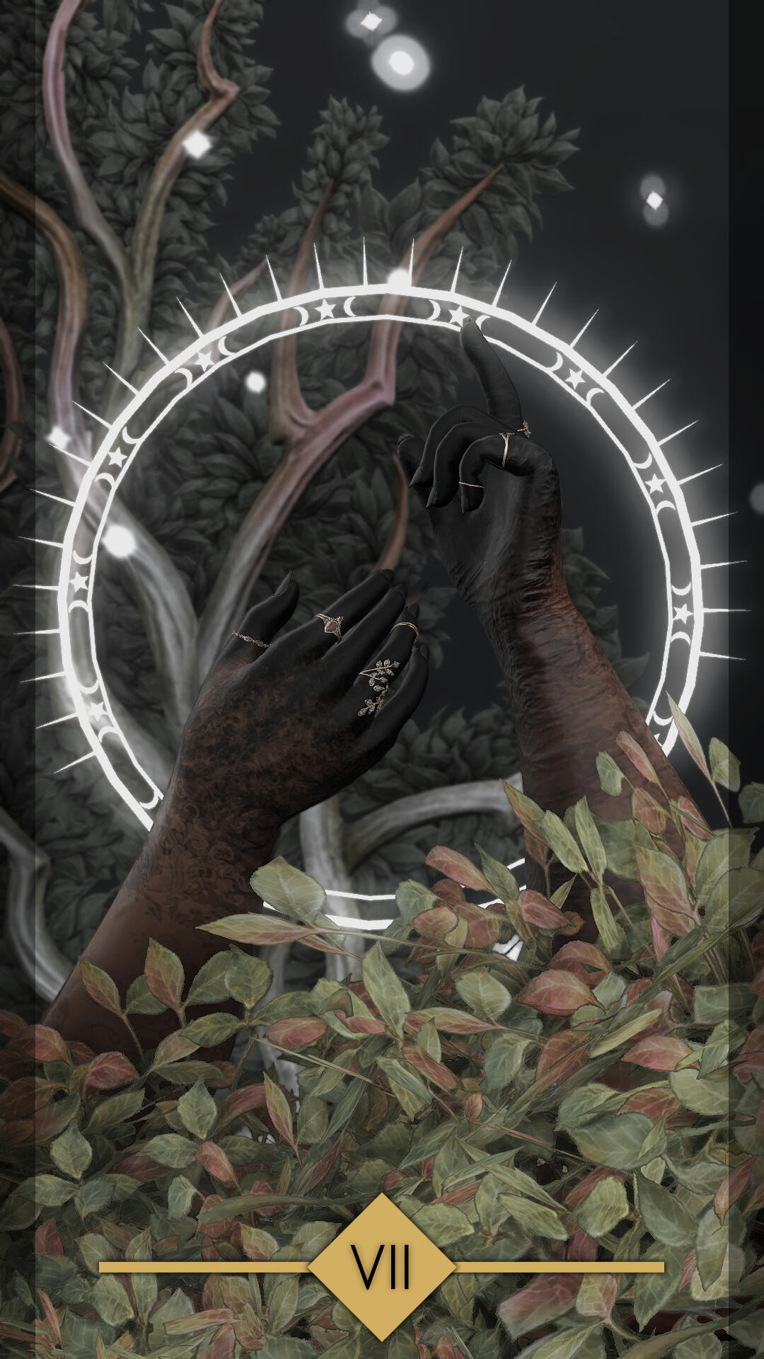 for the character pictured (or her hands, at least) seven of pentacles points towards her struggles to be a better person, the setbacks in that process, and the frustrations & impulses that often lead to them.the pose and composition are heavily referenced from the seven of rings card from Amrit Brar's marigold tarot deck.