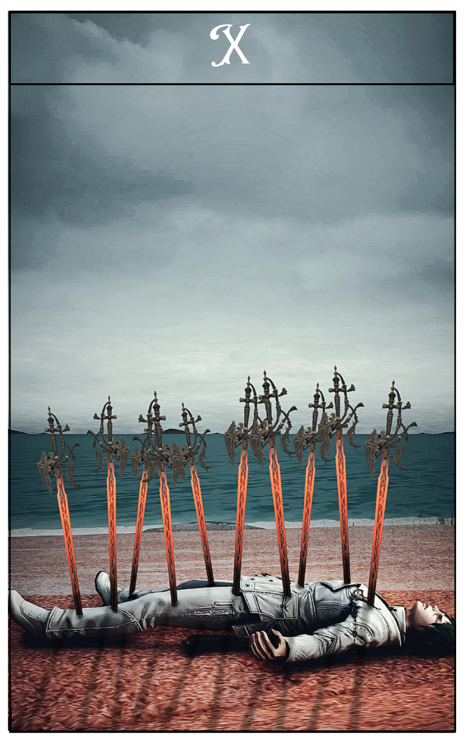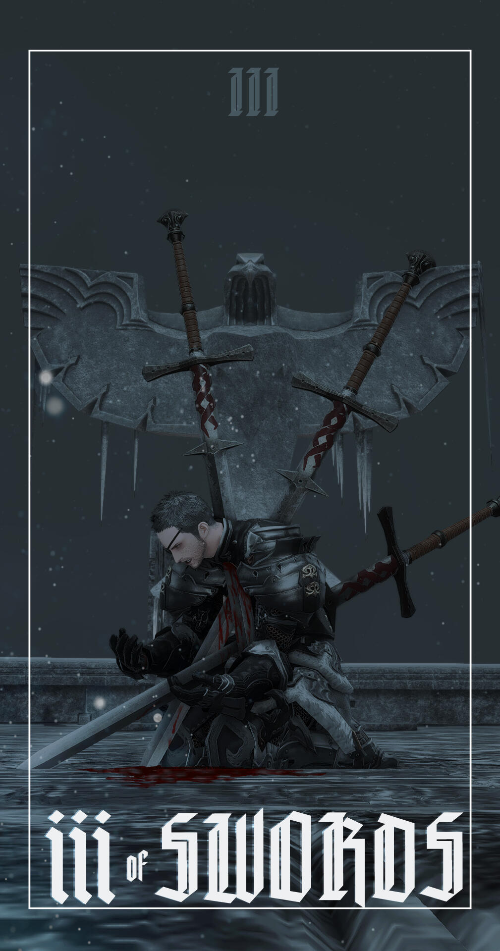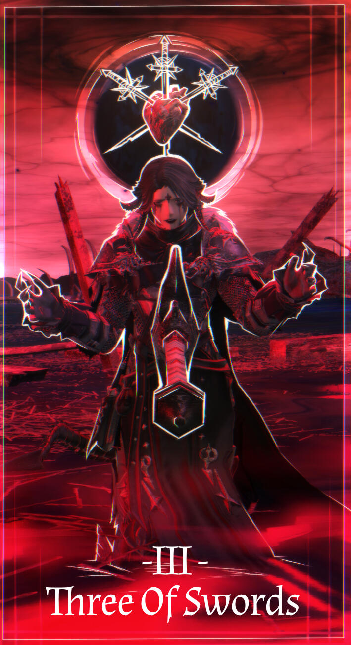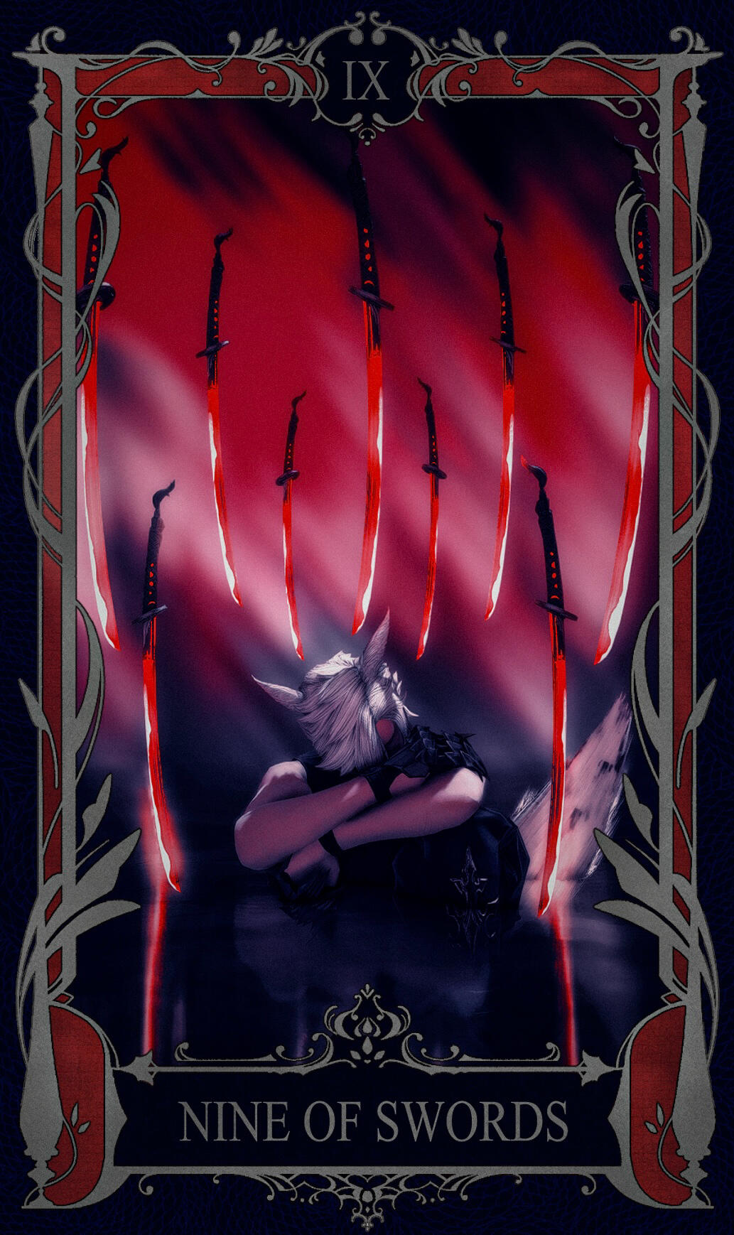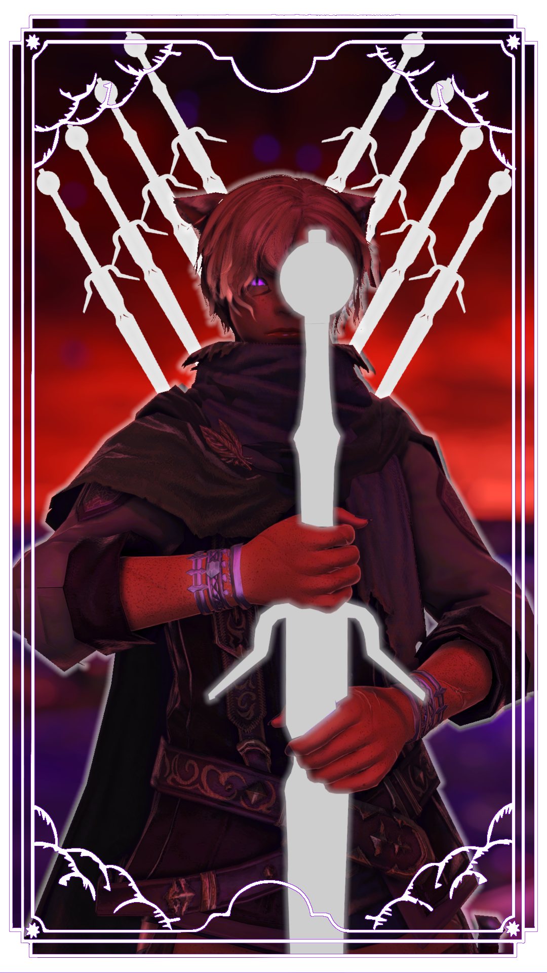 Mainly related to the nature of the card itself; the following.'The Ten of Swords indicate a major disaster of some sort. It shows that a certain force of extreme magnitude has come to hit you in your life - one that you may have not foreseen. There is a sense of betrayal that is indicated here, for the character is stabbed in the back.'Character is Garlean so I thought it fit.
