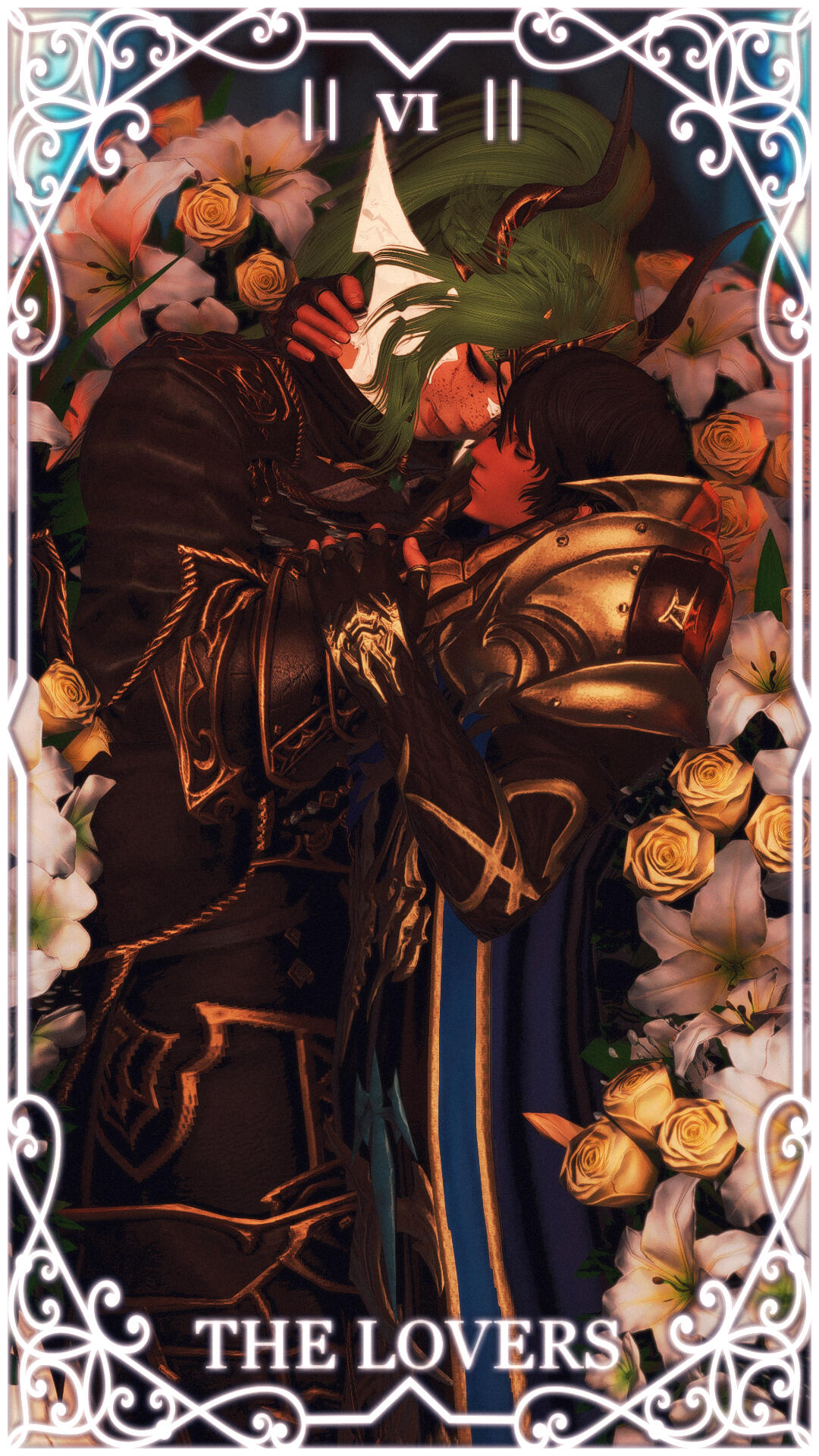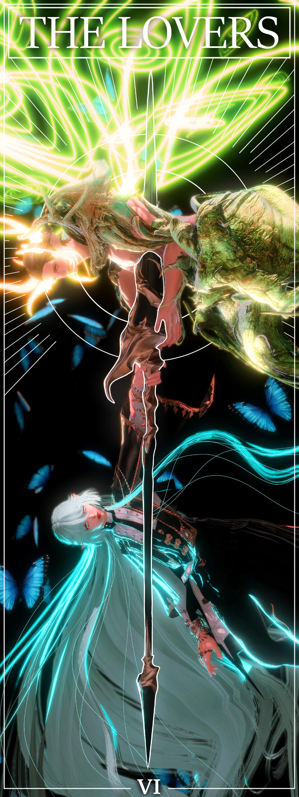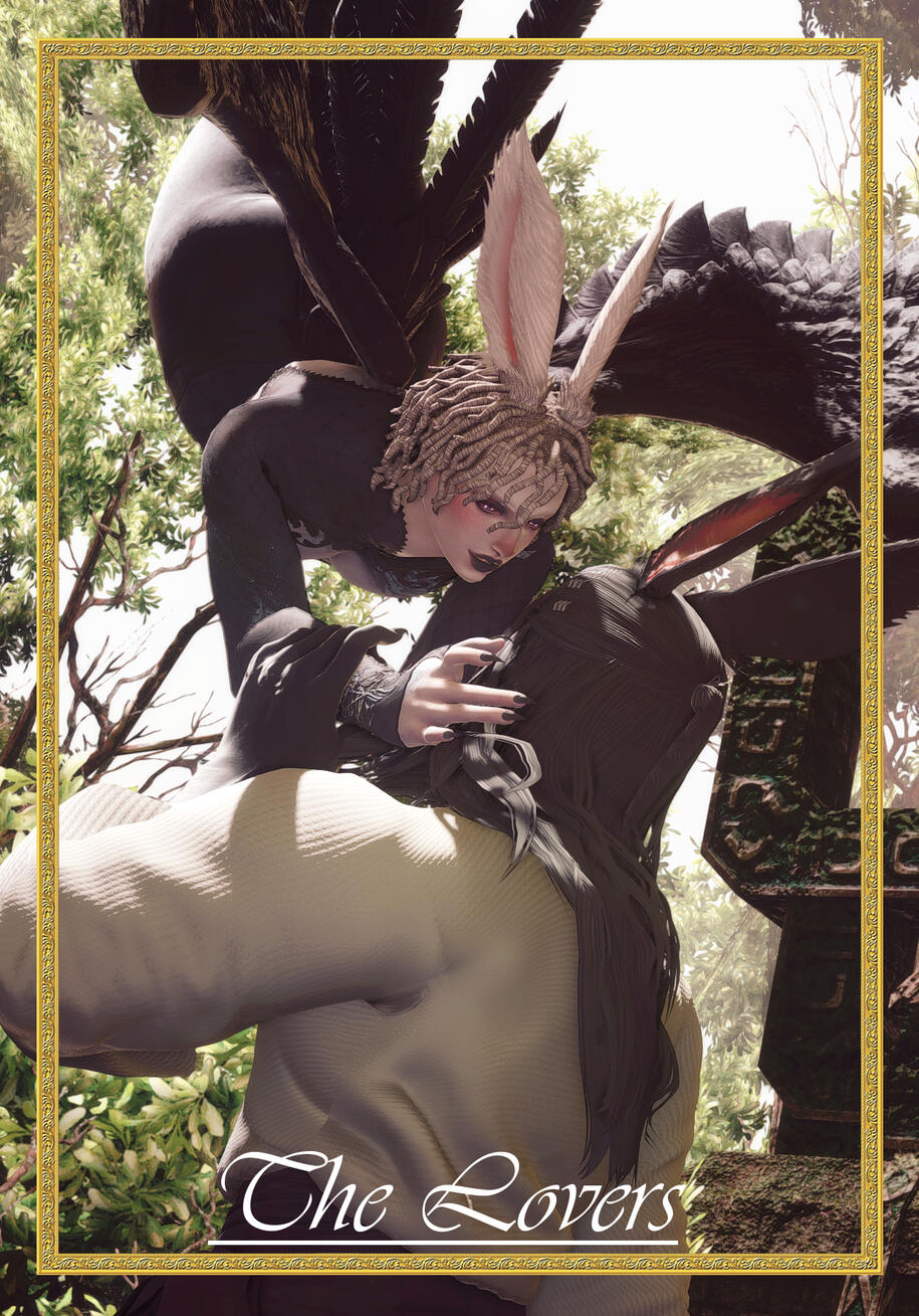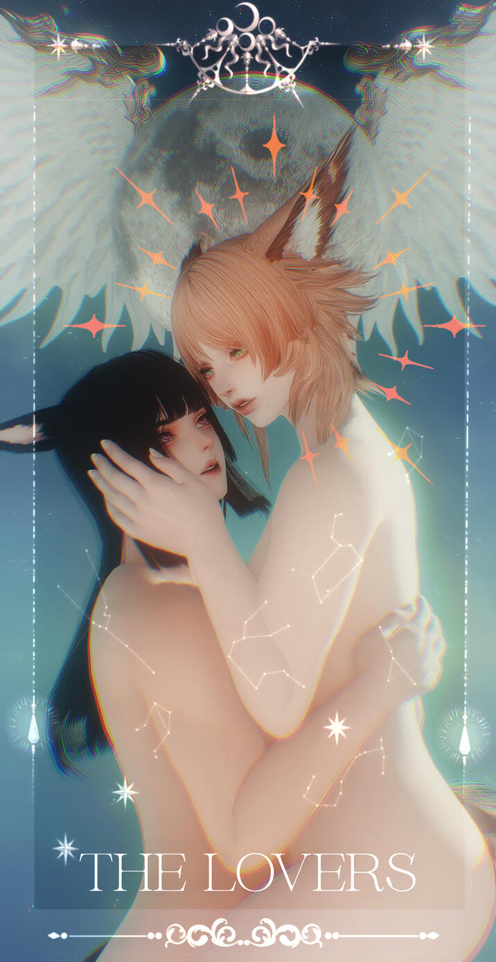 like harmony, like heart — yours and mine, as one.the lovers card depicts a deep connection & understanding between people. in my card, you can see my wol (nouri) and venat touching one another’s faces in understanding while nouri clutches a dagger in hand that venat tenderly holds. nouri & venat are deeply aware of their place with one another and within the cycle and their promise to one another, to wait for one another through the millennia and meet again. they have a clear, holy, absolute trust and love towards one another and their purpose.