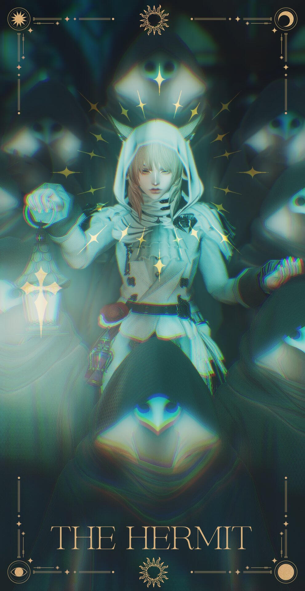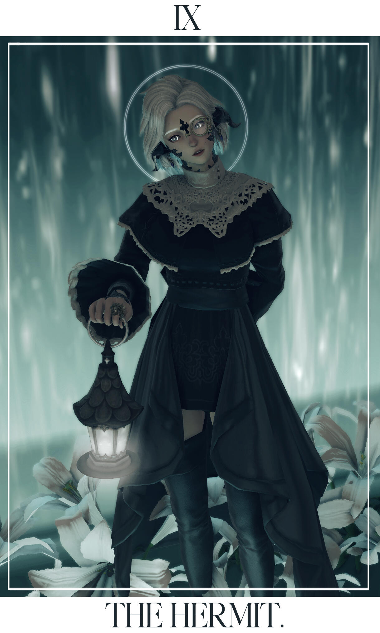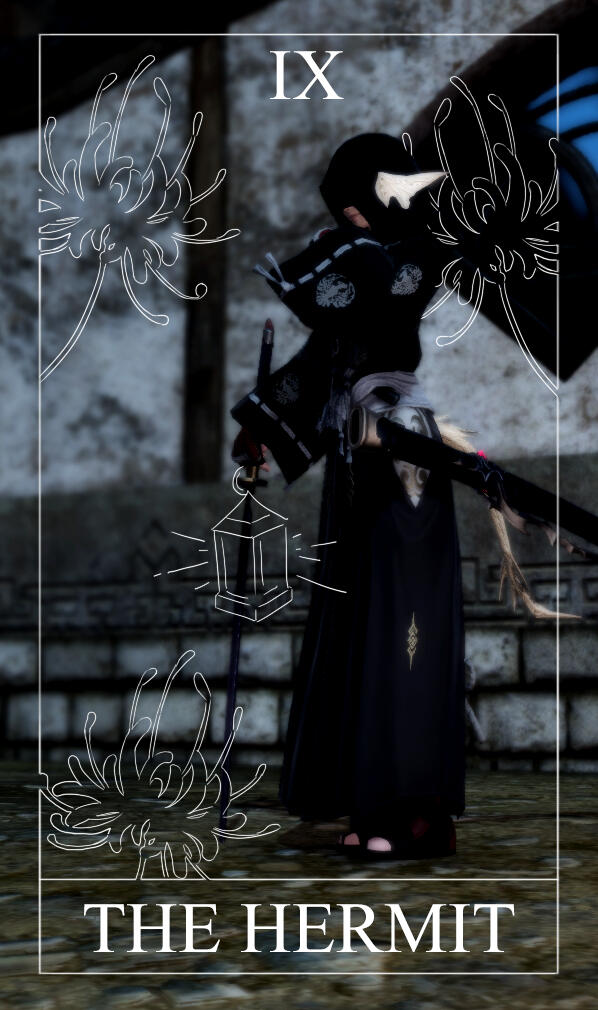 “A lonely wanderer, seeking to learn what could be gained from solitude. Someone led astray after so many losses, disconnecting from the world’s noises to hear their inner voice. Walking through dark nights, The Hermit is guided by a dim light. Their destination is their home; their own self. Upright Hermit is surrounded by reflection, contemplation and inner guidance. Reversed Hermit deals with fear, anxiety, isolation and the dangers of the path they chose.”A rolling stone gathers no moss, that’s what Minamoto no Rin thinks. After leaving Doma, the young auri woman got used to walking and traveling. Often, to work by the side of the scions. Sometimes, to seclude herself and learn from inner quiet. Just like her former teacher, Gosetsu, that became a wandering monk. Rin’s samurai’s sword is her guiding light, the lantern to her Hermit.