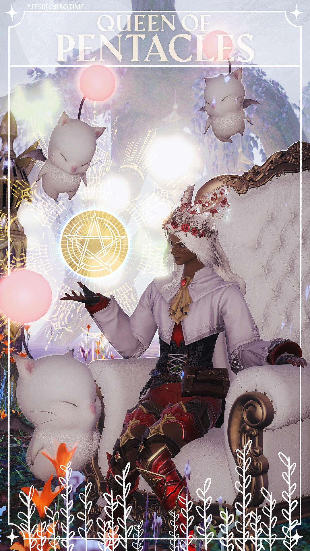 I wanted to put Valentine in the Shroud, which is the closest place he's ever found to Golmore, where he grew up, and to which he can never return. Of course, the moogles wanted to help. He's depicted in the role of Queen of Pentacles -- symbolic when upright of nurturing, compassion, comfort, and a desire to spread prosperity -- as a White Mage, keeper of the art of Succor as gifted to mankind by the elementals.
