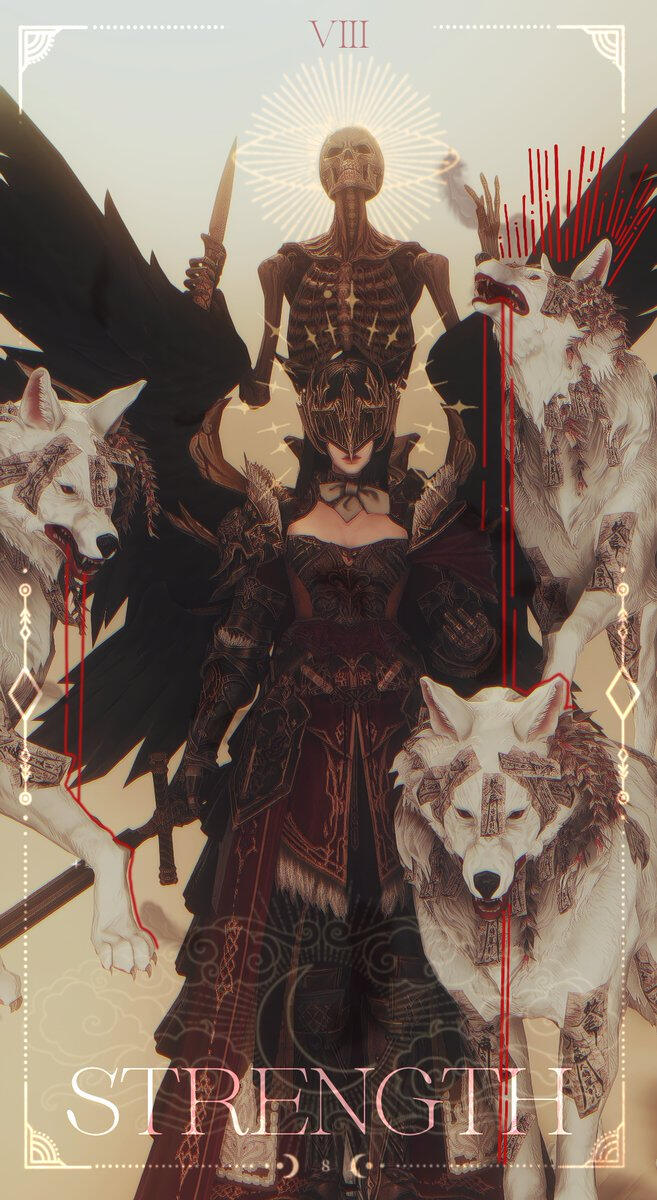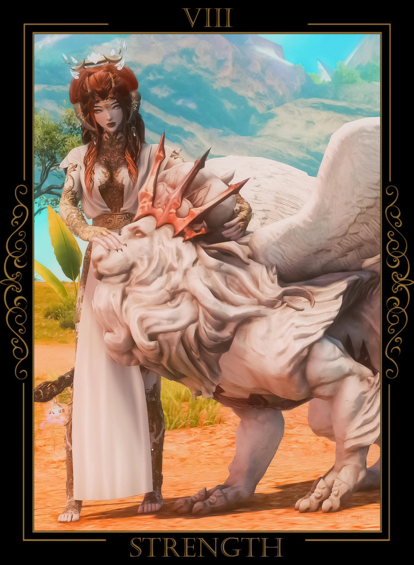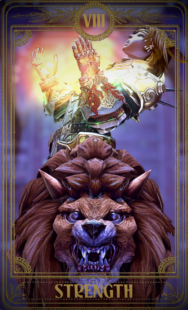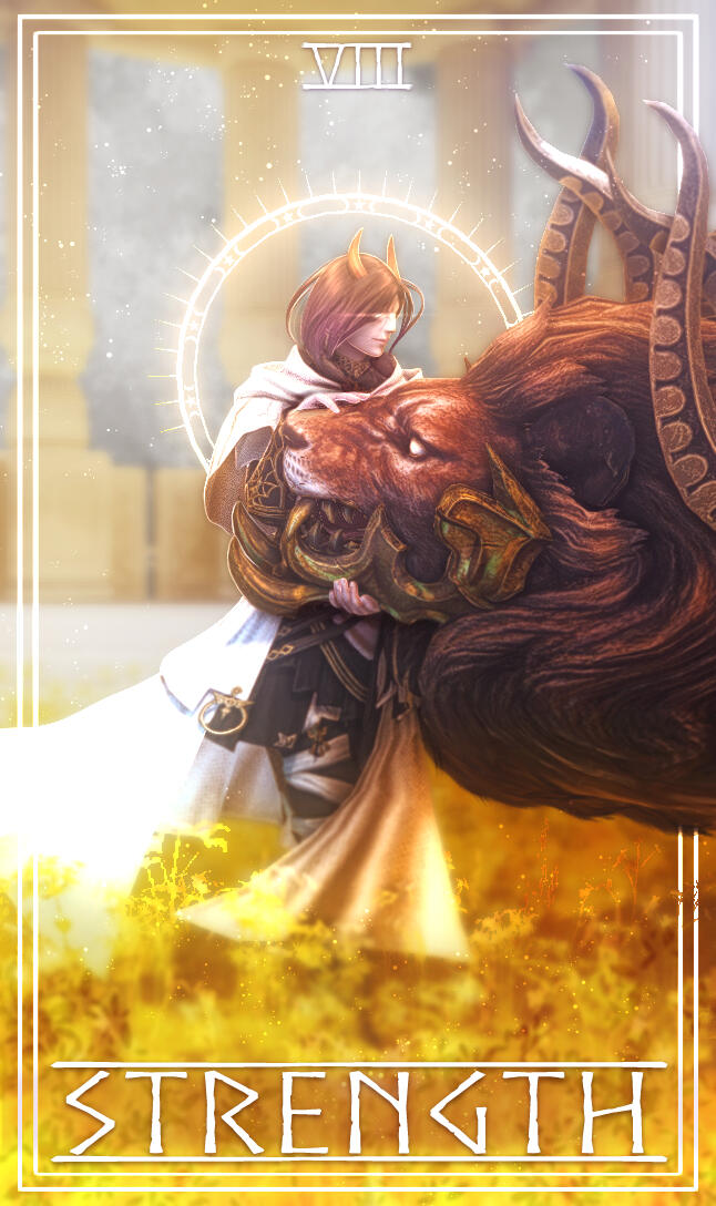 My character M'ozzi fits most with Strength! Shes known as The Lion due to her Half Hrothgar characteristics and her well known strength and willpower and the card is known to depict a lion, I decided to include both her and a normal lion to fit with the tradition.