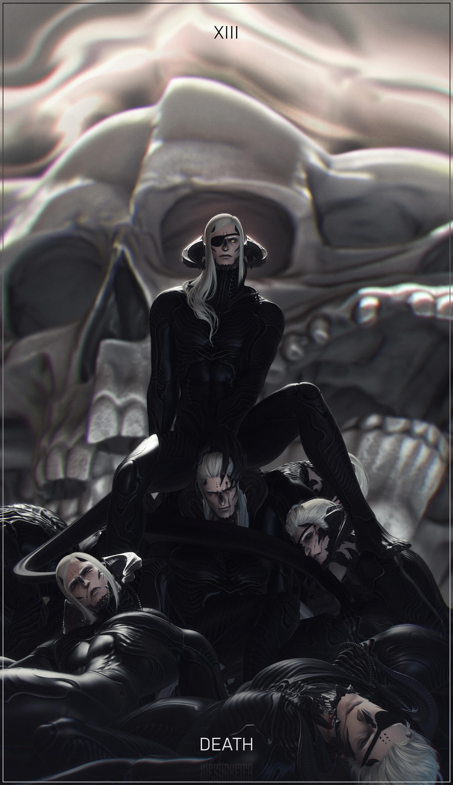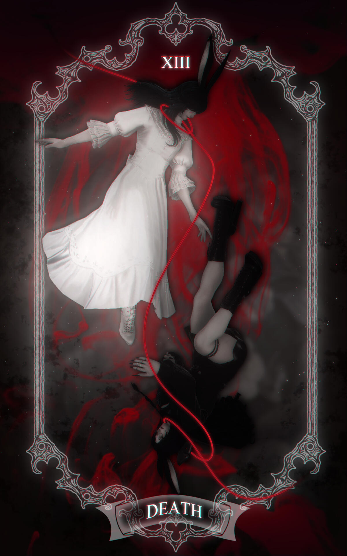 Saviour complex ties with succour and providence meanings of the card. Contrast and duality is represented in colors - black and white for good/evil, red and green for Conflict/Growth, as well as two individuals, one having two heads.It is intentionally left ambiguous whether the scythe is piercing Shadowkeeper or if it's holding the blade (back? close?) in clenched teeth. It's ultimately up to the watcher to get their read on whether this is a controlled situation, Growth controlling Conflict, or the other way around.