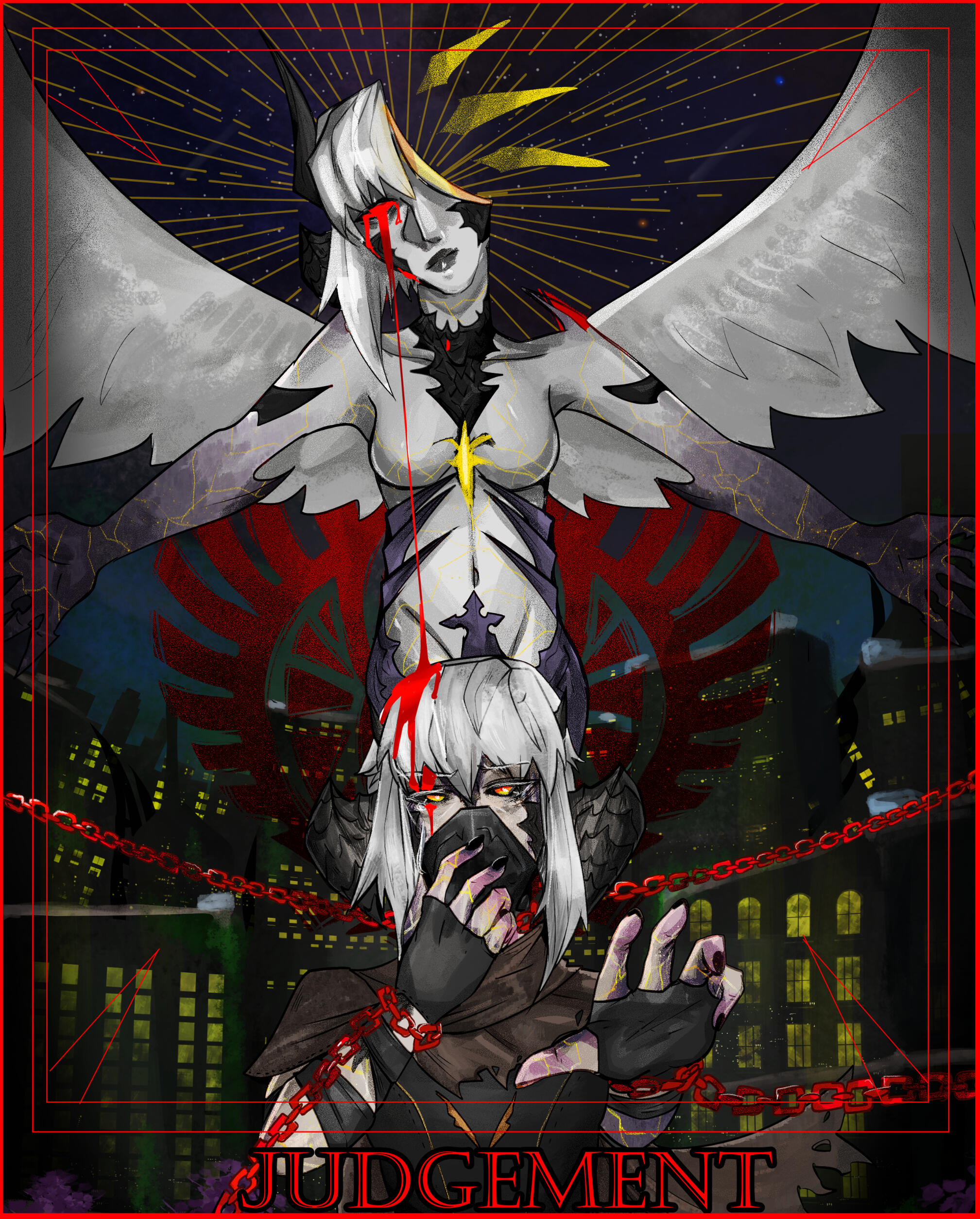 know the price you have already paid"The sword in the queens hand usually points skyward but I depict it downward angled to represent Kou's more grounded rational, less high and mighty in their judgement, more frank. Spattered with blood from where they've symbolically excised their heart for the sake of making a judgement call, so too is their hand extended in the classical way the queen of swords holds hers out, though all theirs seems to offer is the blood spilling from it. This, they've seemingly only just realised.
