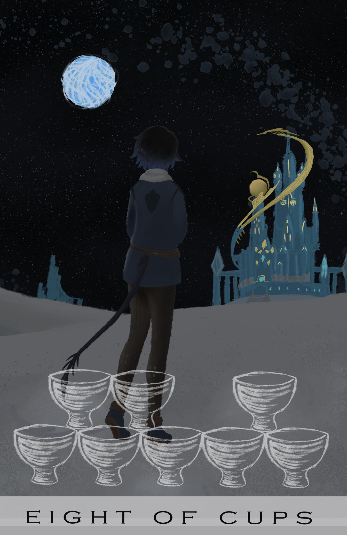 Emmerololth(Zlayer's ancient), Fandaniel(Hermes), and Altima take a walk through Elpis. Their three respective constellation crystals hover above them in the composition, serving as the three pentacles. Hermes, although the newest admit to the convocation, has the attention of his company as he speaks of creation magicks, musing about the apple in his hand.With ample collaboration, apprentices and aces alike can accomplish great things, conjure any creative vision. The tragedy of Hermes is knit into the reversed meaning. Hermes takes the seat of Fandaniel, overseer of life, but struggles to see meaning in life— fundamentally misaligned. He has a close, capable group to rely on, but eventually isolates himself.