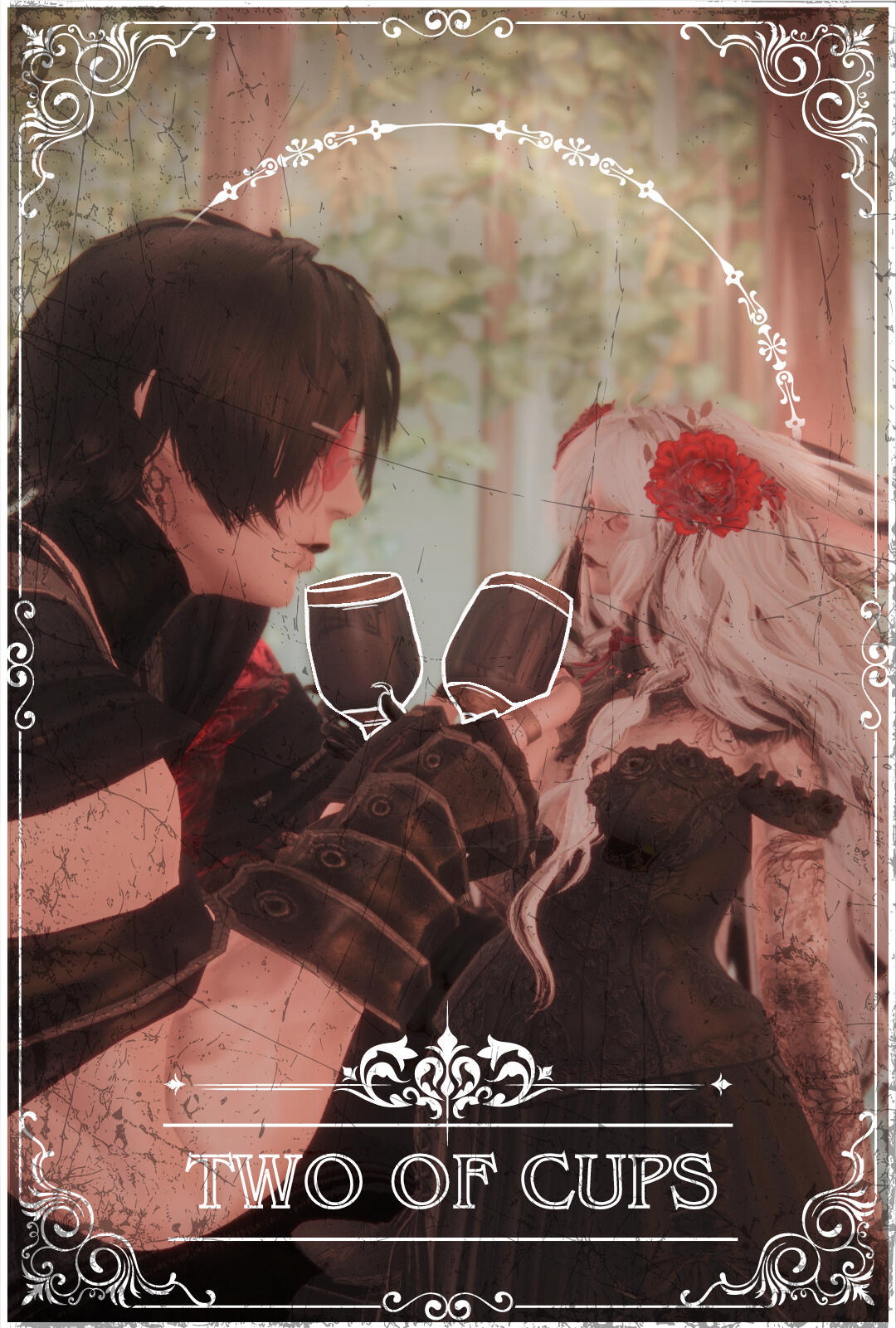 like harmony, like heart — yours and mine, as one.the lovers card depicts a deep connection & understanding between people. in my card, you can see my wol (nouri) and venat touching one another’s faces in understanding while nouri clutches a dagger in hand that venat tenderly holds. nouri & venat are deeply aware of their place with one another and within the cycle and their promise to one another, to wait for one another through the millennia and meet again. they have a clear, holy, absolute trust and love towards one another and their purpose.